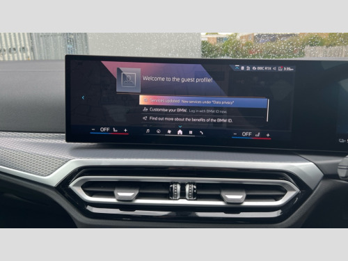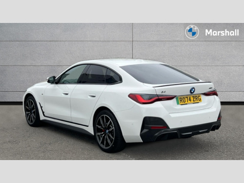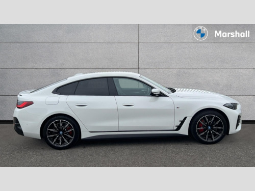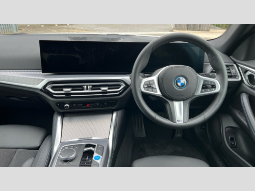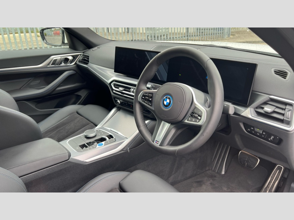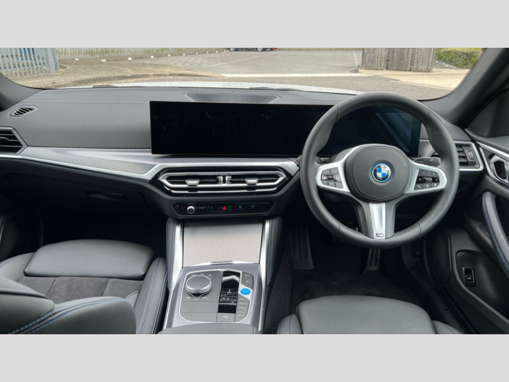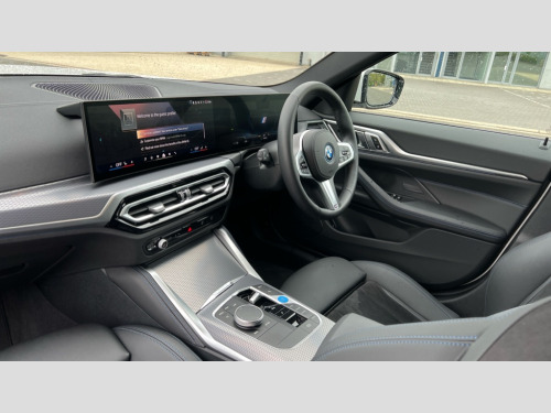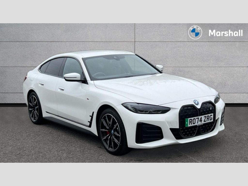 BMW I4 210kW eDrive35 M Sport 70kWh 5dr Auto Active guard plus, Attentiveness assist, Automatic tailgate operation, BMW ConnectedDrive online services, BMW legal emergency call, BMW remote services, BMW Teleservices, Condition based service, Drive off assistant, Driving experience switch, Electric boot lid, Electric Power Steering (EPS) with Servotronic, Engine start/stop button, iDrive controller, Integrated owners handbook, Language version English, Live cockpit plus with nav function 12.3" instrument cluster and 14.9" centre display, Personal Profile - automatic lock when driving away selectable, Preparation for active cruise control with stop and go, Preparation for driver assistance, Run flat indicator, Service interval indicator, Smartphone integration, Speed limiter, Widescreen display, AC charging up to 11kW, DC charging up to 150kW, eDrive exterior sound, Electric drive unit, Electronic differential lock, High voltage battery, Public charging cable Mode 3, Safety battery terminal clamp, 1x USB type A with data transfer and 1.5 Amp charging function in the centre console, 1x USB type C with 3 Amp charging function in the front centre armrest, DAB tuner, Personal eSim, Adaptive LED matrix headlights with 1-module low and high beam, Aluminium door sill strips front with I4 inscription, Auto dimming rear view mirror, Auto dimming with folding wing mirrors, BMW badge on bonnet and tailgate with blue ring around the badge, BMW individual lights shadow line, BMW radiator grille partially with blue accent, BMW radiator grille with mesh grille/end face of the nuggets in quartz silver matt, Body colour door handles, Body colour mirror caps with bottom segment in matt black, Electric adjustable exterior mirrors, Electric windows with trap release and convenient opening/closing feature, Extended high gloss shadow line exterior trim, Exterior mirror heated, Fading support, Follow me home headlights, Front and rear bumper system, Front apron plastic in body colour, Fuel filler flap - right rear in body colour, Headlight beam throw control, Heat protection, sun protection glazing, Heated washer jets, High beam assistant, High gloss black mirror triangles, I badge with blue highlight on front ornamental grille, I4 charging socket flap, right, rear in body colour, Integrated outside door handles, flush design, flush integrated, handle recess indirectly illuminated, Lateral blue accent including air breather, LED 3rd brake light, LED daytime running lights, LED direction indicator lenses, LED eyebrow light, LED front fog lights, LED rear lights, M entry sills, M Sport boot spoiler, Mirror glass aspheric on driver's side, convex on passenger side, Model logo - Rear and right model designation, Rear left i4 inscription, Number plate panel integrated into front bumper and tailgate, One piece front bumper cover including towing eye cover in body colour, Preparation for high beam assistant, Radiator grille frame in chrome matt, Rain sensor including auto headlights activation, Rear boot, Rear bumper with blue accent, Rear side wing doors, Rear wiper, Reversing light, Roof fin in body colour, Side frame trim strip in black matt, Side LED indicators, Side sills in high-gloss black with airbreathers in black, Trailer stabilisation logic, Turn indicators in side mirrors, Visible VIN plate, Welcome lighting, Window recess finisher strip in matt black, 12v power outlet - luggage side, 12V power socket in front centre console with blanking plug, 2 front cupholder in centre console with clamping elements and matt black inlay, 3 seat bench in 2nd row, 3 spoke flat bottom M sport leather steering wheel, 40:20:40 split folding rear seat and rear centre armrest with two cupholders, Adjustable steering column, Ambient door pocket lighting, Ambient inside door handle light, Ambient light design projected onto the left and right entering and exiting area, Ambient lighting front and rear with 9 selectable colours, Ambient storage compartment lighting in the centre console, Anthracite headlining, Automatic air conditioning with 3 zone control, Battery in luggage compartment, BMW ID, Compartment in front of cupholder, Contour lighting in instrument panel and door trim panel, Dynamic function of contour lighting - welcome, goodbye, open doors, phone call, Front and rear ambient footwell lighting, Front and rear armrest with integrated door trim, Front and rear door exit lights, Front and rear door pockets, Front sport seats, Glovebox light, Headrests for all seats, Illuminated armrest storage compartment, Interior light and reading light, Lashing eyelets in boot, Light projection of an ambient lighting graphic, Luggage compartment light, Make-up mirror lights, Rear storage compartment, Single front passenger seat, Storage tray and compartment with cover in centre console, Sunvisors with illuminated vanity mirrors and ticket pocket, Through loading system, Toolkit in luggage compartment, Velour floor mats, Connected package professional - I4, Interior and exterior mirror pack - I4, M Sport exterior styling pack - I4, Parking assistant pack - I4, Storage compartment pack with 12V socket - I4, 3 point seatbelts on all seats, Acoustic protection for pedestrians, Active protection, Anti lock braking system (ABS) with brake assist, Automatic Stability Control (ASC), Battery safety cut-off, Brake drying, Brake energy regeneration, Brake pretensioning, Child lock button on rear side window, Cornering brake control (CBC), Crash sensor activating central locking release, hazard warning lights, Driver and front passenger airbags, Driver and passenger side airbags, Driver/passenger seat occupancy sensor, Dynamic brake control, Dynamic stability control + (DSC+), Dynamic Traction Control - DTC, Electromechanical parking brake, Front and rear curtain airbags, Front and rear ventilated brake disc, Front passenger airbag deactivation, Head airbags for all 4 outer seats, Hill start assistant, ISOFIX child seat mounting on rear outer sea
