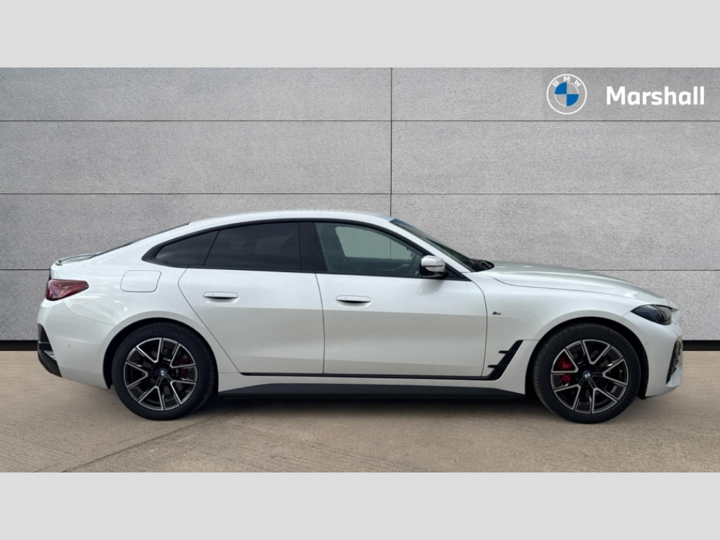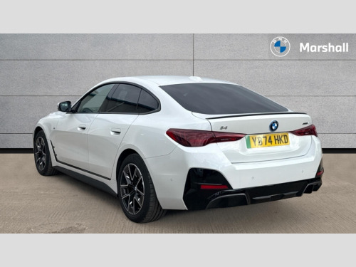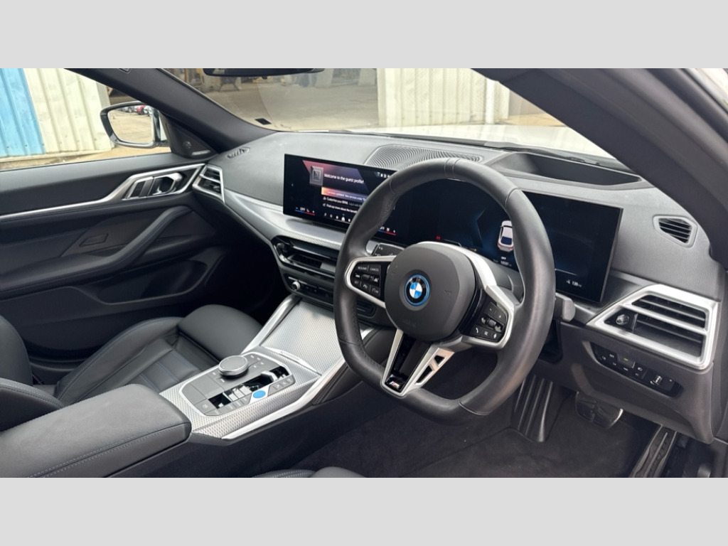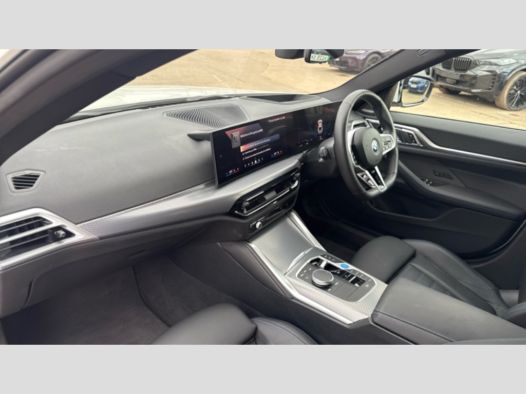 BMW I4 250kW eDrive40 M Sport 83.9kWh 5dr Auto Active guard plus, Attentiveness assist, Automatic tailgate operation, BMW ConnectedDrive online services, BMW legal emergency call, BMW remote services, BMW Teleservices, Condition based service, Drive off assistant, Driving experience switch, Electric boot lid, Electric Power Steering (EPS) with Servotronic, Engine start/stop button, iDrive controller, Integrated owners handbook, Language version English, Live cockpit plus with nav function 12.3" instrument cluster and 14.9" centre display, Personal Profile - automatic lock when driving away selectable, Preparation for active cruise control with stop and go, Preparation for driver assistance, Run flat indicator, Service interval indicator, Smartphone integration, Speed limiter, Widescreen display, AC charging up to 11kW, DC charging up to 150kW, eDrive exterior sound, Electric drive unit, Electronic differential lock, High voltage battery, Public charging cable Mode 3, Safety battery terminal clamp, 1x USB type A with data transfer and 1.5 Amp charging function in the centre console, 1x USB type C with 3 Amp charging function in the front centre armrest, DAB tuner, Personal eSim, Aluminium door sill strips front with I4 inscription, Auto dimming rear view mirror, Auto dimming with folding wing mirrors, BMW badge on bonnet and tailgate with blue ring around the badge, BMW radiator grille partially with blue accent, BMW radiator grille with mesh grille/end face of the nuggets in quartz silver matt, Body colour door handles, Body colour mirror caps with bottom segment in matt black, Electric adjustable exterior mirrors, Electric windows with trap release and convenient opening/closing feature, Exterior mirror heated, Fading support, Follow me home headlights, Front and rear bumper system, Front apron plastic in body colour, Fuel filler flap - right rear in body colour, Headlight beam throw control, Heat protection, sun protection glazing, Heated washer jets, High gloss black mirror triangles, High gloss shadow line exterior trim, I badge with blue highlight on front ornamental grille, I4 charging socket flap, right, rear in body colour, Integrated outside door handles, flush design, flush integrated, handle recess indirectly illuminated, Lateral blue accent including air breather, LED 3rd brake light, LED daytime running lights, LED direction indicator lenses, LED eyebrow light, LED front fog lights, LED rear lights, M entry sills, Mirror glass aspheric on driver's side, convex on passenger side, Model logo - Rear and right model designation, Rear left i4 inscription, Number plate panel integrated into front bumper and tailgate, One piece front bumper cover including towing eye cover in body colour, Preparation for high beam assistant, Radiator grille frame in chrome matt, Rain sensor including auto headlights activation, Rear boot, Rear bumper with blue accent, Rear side wing doors, Rear wiper, Reversing light, Roof fin in body colour, Side frame trim strip in black matt, Side LED indicators, Side sills in high-gloss black with airbreathers in black, Trailer stabilisation logic, Turn indicators in side mirrors, Visible VIN plate, Welcome lighting, Window recess finisher strip in matt black, 12v power outlet - luggage side, 12V power socket in front centre console with blanking plug, 2 front cupholder in centre console with clamping elements and matt black inlay, 3 seat bench in 2nd row, 3 spoke flat bottom M sport leather steering wheel, 40:20:40 split folding rear seat and rear centre armrest with two cupholders, Adjustable steering column, Ambient door pocket lighting, Ambient inside door handle light, Ambient light design projected onto the left and right entering and exiting area, Ambient lighting front and rear with 9 selectable colours, Ambient storage compartment lighting in the centre console, Anthracite headlining, Automatic air conditioning with 3 zone control, Battery in luggage compartment, BMW ID, Compartment in front of cupholder, Contour lighting in instrument panel and door trim panel, Dynamic function of contour lighting - welcome, goodbye, open doors, phone call, Front and rear ambient footwell lighting, Front and rear armrest with integrated door trim, Front and rear door exit lights, Front and rear door pockets, Front sport seats, Glovebox light, Headrests for all seats, Illuminated armrest storage compartment, Interior light and reading light, Lashing eyelets in boot, Light projection of an ambient lighting graphic, Luggage compartment light, Make-up mirror lights, Rear storage compartment, Single front passenger seat, Storage tray and compartment with cover in centre console, Sunvisors with illuminated vanity mirrors and ticket pocket, Through loading system, Toolkit in luggage compartment, Velour floor mats, Connected package professional - I4, Interior and exterior mirror pack - I4, M Sport exterior styling pack - I4, Parking assistant pack - I4, Storage compartment pack with 12V socket - I4, 3 point seatbelts on all seats, Acoustic protection for pedestrians, Active protection, Anti lock braking system (ABS) with brake assist, Automatic Stability Control (ASC), Battery safety cut-off, Brake drying, Brake energy regeneration, Brake pretensioning, Child lock button on rear side window, Cornering brake control (CBC), Crash sensor activating central locking release, hazard warning lights, Driver and front passenger airbags, Driver and passenger side airbags, Driver/passenger seat occupancy sensor, Dynamic brake control, Dynamic stability control + (DSC+), Dynamic Traction Control - DTC, Electromechanical parking brake, Front and rear curtain airbags, Front and rear ventilated brake disc, Front passenger airbag deactivation, Head airbags for all 4 outer seats, Hill start assistant, ISOFIX child seat mounting on rear outer seats, M sport blue brake calipers, Recuperation system, Side impact protection, Sport brake calipers, Twin horns, Tyre pressure sensor, Warning triangl