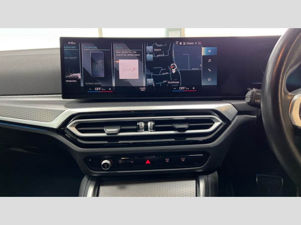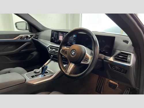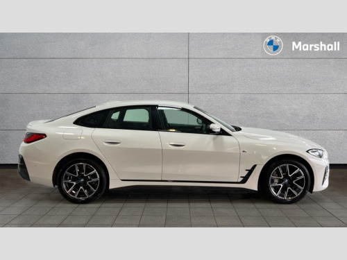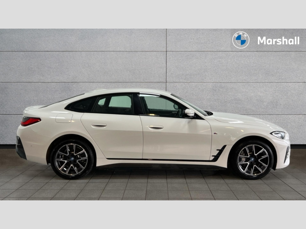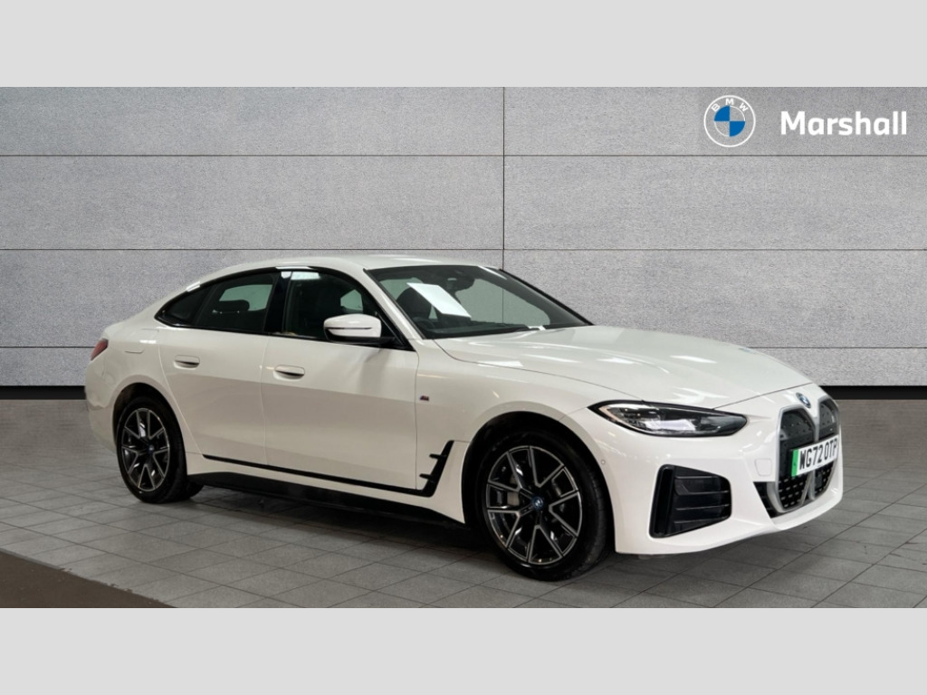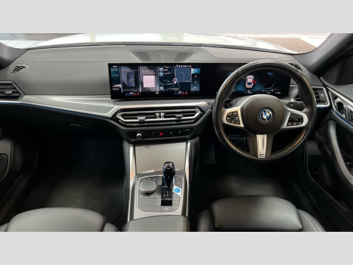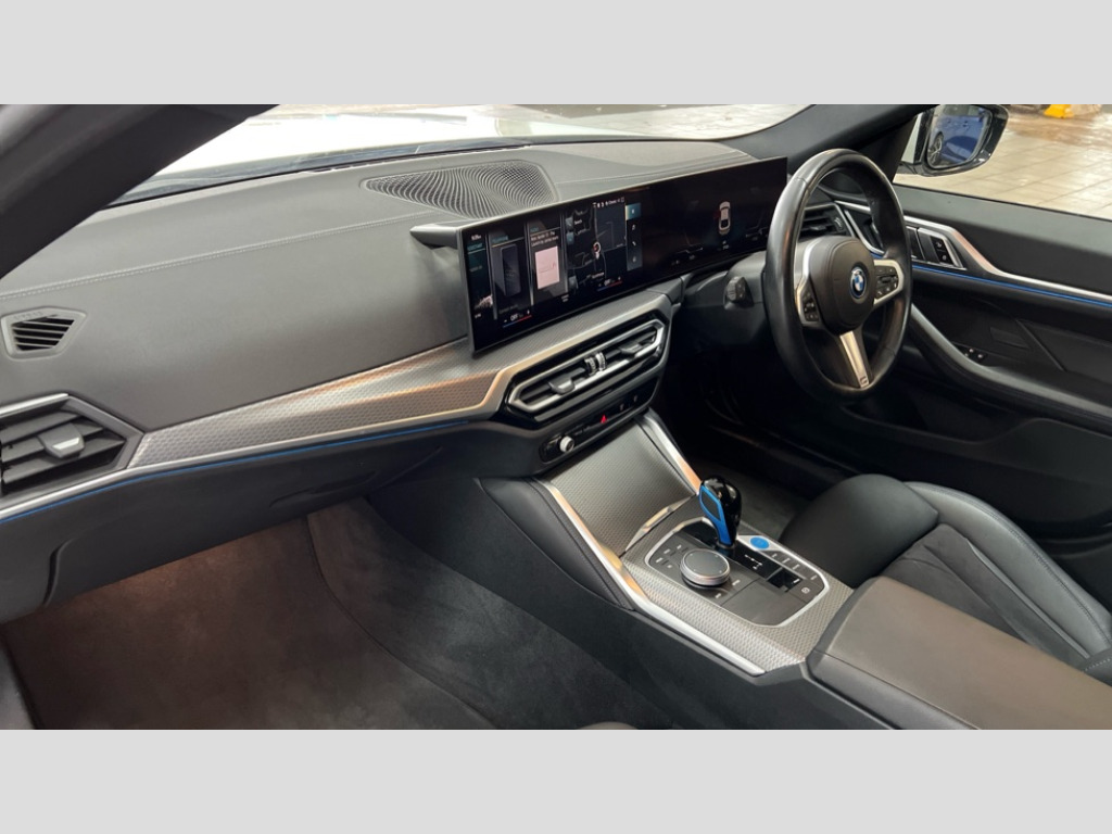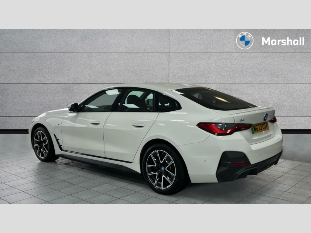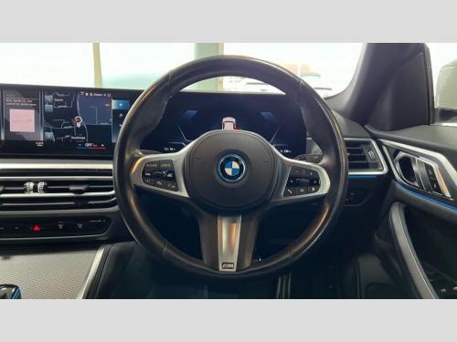 BMW I4 250kW eDrive40 M Sport 83.9kWh 5dr Auto Active guard plus, Attentiveness assist, Automatic tailgate operation, BMW legal emergency call, BMW remote services, BMW Teleservices, Condition based service, Cruise control with brake assist, Drive off assistant, Driving experience switch, Electric Power Steering (EPS) with Servotronic, Engine start/stop button, iDrive controller, Integrated owners handbook, Live cockpit plus with nav function 12.3" instrument cluster and 14.9" centre display, Personal Profile - automatic lock when driving away selectable, Preparation for active cruise control with stop and go, Run flat indicator, Service interval indicator, Smartphone integration, Speed limiter, Widescreen display, AC charging up to 11kW, DC charging up to 150kW, eDrive exterior sound, Electric drive unit, Electronic differential lock, High voltage battery, Mode 2 flexible charger, Mode 3 charging cable, Safety battery terminal clamp, Standard suspension, 2x USB Type C ports in front centre console for charging and data transfer, BMW iconic sound electric, DAB tuner, Auto dimming rear view mirror, Auto dimming with folding wing mirrors, BMW badge on bonnet and tailgate with blue ring around the badge, BMW radiator grille partially with blue accent, BMW radiator grille with mesh grille/end face of the nuggets in quartz silver matt, Body colour door handles, Body colour mirror caps with bottom segment in matt black, Electric adjustable exterior mirrors, Electric windows with trap release and convenient opening/closing feature, Exterior mirror heated, Fading support, Follow me home headlights, Front and rear bumper system, Front apron plastic in body colour, Headlight beam throw control, Heated washer jets, High gloss black mirror triangles, High gloss shadow line exterior trim, I badge with blue highlight on front ornamental grille, I4 charging socket flap, right, rear in body colour, Integrated outside door handles, flush design, flush integrated, handle recess indirectly illuminated, Lateral blue accent including air breather, LED daytime running lights, LED direction indicator lenses, LED eyebrow light, LED front fog lights, LED rear lights, M Sport entry door sill strips, M Sport spoiler, Mirror glass aspheric on driver's side, convex on passenger side, Model logo - Rear and right model designation, Rear left i4 inscription, Number plate panel integrated into front bumper and tailgate, One piece front bumper cover including towing eye cover in body colour, Rain sensor including auto headlights activation, Rear bumper with blue accent, Rear side wing doors, Rear wiper, Reversing light, Roof fin in body colour, Side frame trim strip in black matt, Side LED indicators, Trailer stabilisation logic, Turn indicators in side mirrors, Visible VIN plate, Welcome lighting, Window cavity seal in black matt, 12v power outlet - luggage side, 12V power outlet in front console, 2 front cupholder in centre console with clamping elements and matt black inlay, 3 seat bench in 2nd row, 3 spoke leather M sport multifunction sports steering wheel, 40:20:40 split folding rear seat and rear centre armrest with two cupholders, Adjustable steering column, Ambient door pocket lighting, Ambient inside door handle light in rear, Ambient interior lighting with 11 pre-defined selectable light designs including 6 colours, Ambient light design projected onto the left and right entering and exiting area, Ambient storage compartment lighting in the centre console, Anthracite headlining, Automatic air conditioning with 3 zone control, BMW ID, Compartment in front of cupholder, Contour lighting in instrument panel and door trim panel, Driver seat backrest width adjustment, Dynamic function of contour lighting, Front and rear ambient footwell lighting, Front and rear armrest with integrated door trim, Front and rear door exit lights, Front and rear door pockets, Front sport seats, Glovebox light, Headrests for all seats, Heated front seats, Illuminated armrest storage compartment, Interior light and reading light, Lashing eyelets in boot, Luggage compartment light, Make-up mirror lights, Manual adjustment of seat height, fore/aft position, seat depth, backrest tilt and head restraint height, Rear storage compartment, Single front passenger seat, Storage tray and compartment with cover in centre console, Sunvisors with vanity mirrors and ticket pocket, Through loading system, Toolkit, Velour floor mats, M Sport exterior styling pack - I4, 3 point seatbelts on all seats, Acoustic protection for pedestrians, Active protection, Anti lock braking system (ABS) with brake assist, Automatic Stability Control (ASC), Battery safety cut-off, Brake drying, Brake energy regeneration, Brake pretensioning, Cornering brake control (CBC), Crash sensor activating central locking release, hazard warning lights, Driver and front passenger airbags, Driver and passenger side airbags, Driver/passenger seat occupancy sensor, Dynamic brake control, Dynamic stability control + (DSC+), Dynamic Traction Control - DTC, Electromechanical parking brake, Front and rear curtain airbags, Front and rear ventilated brake disc, Head airbags for all 4 outer seats, Hill start assistant, ISOFIX child seat mounting on rear outer seats, Manual child lock in rear doors, Recuperation system, Side impact protection, Twin horns, Tyre pressure sensor, Warning triangle and first aid kit, Alarm system, Central locking including 2 vehicle keys with integrated emergency key, Central locking switch for all doors, fuel filler cap and luggage compartment, Electronic vehicle immobiliser, Interior centre lock switch, Locking wheel bolts, Sensatec dashboard, 18" M aerodynamic alloy wheels in bicolour with mixed tyres - style 858M, Tyre repair kit
