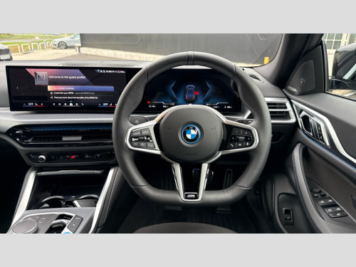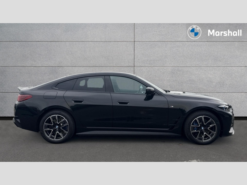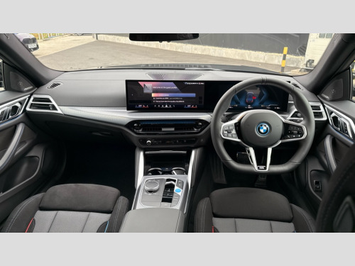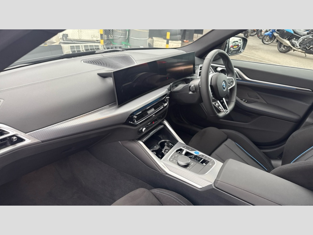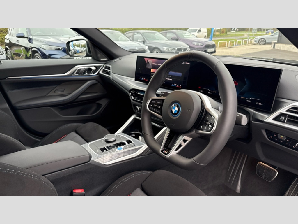 BMW I4 250kW eDrive40 M Sport 83.9kWh 5dr Auto 4G LTE connectivity, Active guard plus, Attentiveness assist, Automatic tailgate operation, Bluetooth Wi-Fi interface, BMW ConnectedDrive online services, BMW legal emergency call, BMW Maps, BMW remote services, BMW Teleservices, Drive off assistant, Driver profile, Driving experience switch, Electric boot lid, Engine start/stop button, iDrive touch controller, Integrated owners handbook, Language version English, Live cockpit plus with nav function 12.3" instrument cluster and 14.9" centre display, Personal Profile - automatic lock when driving away selectable, Service interval indicator, Widescreen display, AC charging up to 11kW, DC charging up to 150kW, eDrive exterior sound, Electric drive unit, Electronic differential lock, High voltage battery, Plug and charge, Public charging cable Mode 3, Safety battery terminal clamp, Silicon carbide inverter, 1x USB type A with data transfer and 1.5 Amp charging function in the centre console, 1x USB type C with 3 Amp charging function in the front centre armrest, DAB tuner, Personal eSim, BMW badge on bonnet and tailgate with blue ring around the badge, BMW radiator grille with mesh grille/end face of the nuggets in quartz silver matt, Body colour door handles, Body colour mirror caps with bottom segment in matt black, Electric adjustable exterior mirrors, Electric windows with trap release and convenient opening/closing feature, Electrochromic rear view mirror, Exterior mirror heated, Fading support, Follow me home headlights, Front and rear bumper system, Front apron plastic in body colour, Fuel filler flap - right rear in body colour, Headlight beam throw control, Heat protection glazing on front windows and windscreen, Heated washer jets, High gloss black mirror triangles, High gloss shadow line exterior trim, I badge with blue highlight on front ornamental grille, I4 charging socket flap, right, rear in body colour, Integrated outside door handles, flush design, flush integrated, handle recess indirectly illuminated, Lateral blue accent including air breather, LED 3rd brake light, LED daytime running lights, LED direction indicator lenses, LED eyebrow light, LED front fog lights, LED rear fog light, LED rear lights, M entry sills, Mirror glass aspheric on driver's side, convex on passenger side, Model logo - Rear and right model designation, Rear left i4 inscription, Number plate panel integrated into front bumper and tailgate, One piece front bumper cover including towing eye cover in body colour, Radiator grille frame in chrome matt, Rain sensor including auto headlights activation, Rear bumper with blue accent, Rear side wing doors, Rear wiper, Reversing light, Roof fin in body colour, Side frame trim strip in black matt, Side LED indicators, Side sills in high-gloss black with airbreathers in black, Trailer stabilisation logic, Turn indicators in side mirrors, Visible VIN plate, Welcome lighting, Window recess finisher strip in matt black, 12V power socket in front centre console with blanking plug, 2 front cupholder in centre console with clamping elements and matt black inlay, 3 seat bench in 2nd row, 3 spoke flat bottom M sport leather steering wheel, 40:20:40 split folding rear seat and rear centre armrest with two cupholders, Adjustable steering column, Aluminium door sill strips front with BMW i inscription, Ambient inside door handle light, Ambient light design projected onto the left and right entering and exiting area, Ambient lighting front and rear with 9 selectable colours, Ambient storage compartment lighting in the centre console, Anthracite headlining, Automatic air conditioning with 3 zone control, Battery in luggage compartment, BMW ID, Contour lighting in instrument panel and door trim panel, Dynamic function of contour lighting - welcome, goodbye, open doors, phone call, Front ambient footwell lighting, Front and rear armrest with integrated door trim, Front and rear door exit lights, Front and rear door pockets, Glovebox light, Headrests for all seats, Illuminated armrest storage compartment, Interior light and reading light, Lashing eyelets in boot, Light projection of an ambient lighting graphic, Luggage compartment light, Multifunction steering wheel, Rear storage compartment, Single front passenger seat, Storage tray and compartment with cover in centre console, Sunvisors with illuminated vanity mirrors and ticket pocket, Through loading system, Toolkit in luggage compartment, Velour floor mats, Connected package professional - I4, Interior and exterior mirror pack - I4, M Sport exterior styling pack - I4, Parking assistant pack - I4, 3 point seatbelts on all seats, Acoustic protection for pedestrians, Active protection, Anti lock braking system (ABS) with brake assist, Automatic Stability Control (ASC), Battery safety cut-off, Brake drying, Brake energy regeneration, Brake pretensioning, Child lock button on rear side window, Cornering brake control (CBC), Crash sensor, Driver and front passenger airbags, Driver and passenger side airbags, Driver/passenger seat occupancy sensor, DSC - Dynamic Stability Control, Dynamic brake control, Dynamic Traction Control - DTC, Electromechanical parking brake, Front and rear ventilated brake disc, Front passenger airbag deactivation, Head airbags for all 4 outer seats, Hill start assistant, ISOFIX child seat mounting on rear outer seats, M sport blue brake calipers, Recuperation system, Side impact protection, Sport brake calipers, Twin horns, Tyre pressure sensor, Warning triangle and first aid kit, Alarm system, Central locking including 2 vehicle keys with integrated emergency key, Central locking switch, Electronic vehicle immobiliser, Locking wheel bolts, Sensatec dashboard, Tyre repair kit plus