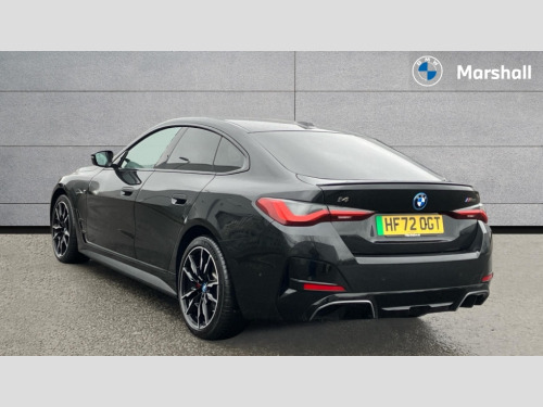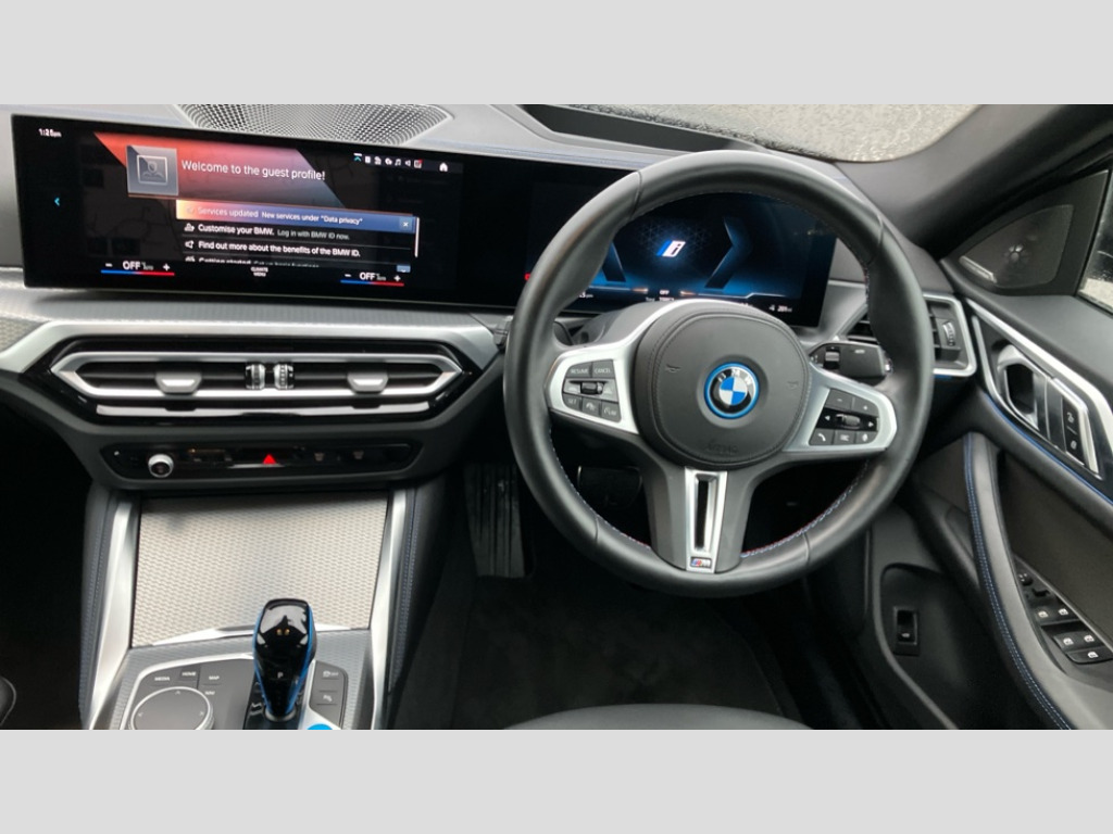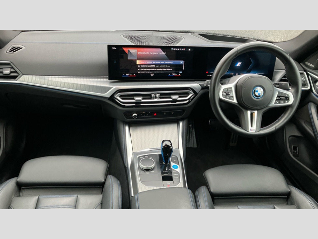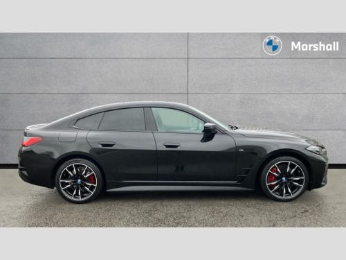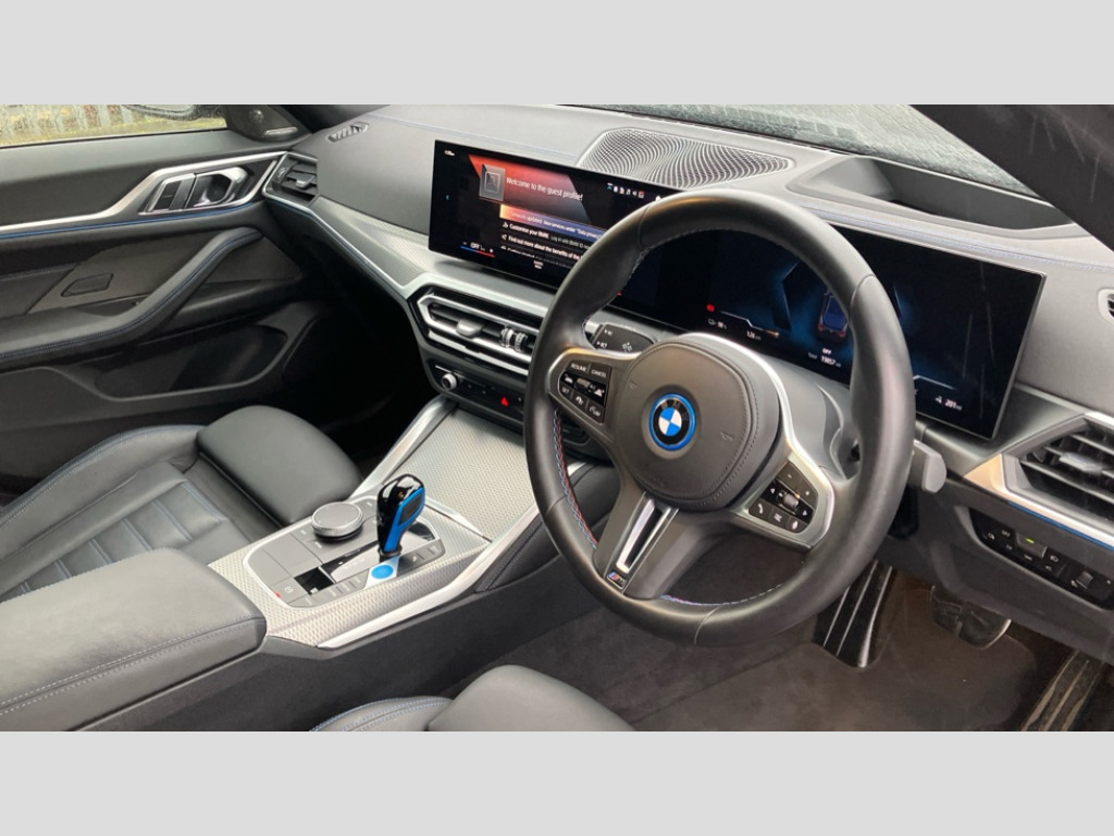 BMW I4 400kW M50 83.9kWh 5dr Auto Active guard plus, Attentiveness assist, Automatic tailgate operation, BMW legal emergency call, BMW remote services, BMW Teleservices, Condition based service, Cruise control with brake assist, Drive off assistant, Driving experience switch, Electric Power Steering (EPS) with Servotronic, Engine start/stop button, iDrive controller, Integrated owners handbook, Live Cockpit Professional with head up display including 12.3" instrument cluster and 14.9" central display, Personal Profile - automatic lock when driving away selectable, Preparation for active cruise control with stop and go, Run flat indicator, Service interval indicator, Smartphone integration, Speed limiter, Storage for wireless charging, Widescreen display, AC charging up to 11kW, Adaptive M suspension, DC charging up to 150kW, eDrive exterior sound, Electric drive unit, Electronic differential lock, High voltage battery, Mode 2 flexible charger, Mode 3 charging cable, Safety battery terminal clamp, 2x USB Type C ports in front centre console for charging and data transfer, BMW iconic sound electric, DAB tuner, Harman/Kardon surround sound audio system with 464W amplifier power, 9 channels and 17 speakers, Auto dimming rear view mirror, Auto dimming with folding wing mirrors, BMW individual lights shadow line, BMW radiator grille partially with blue accent, BMW radiator grille with mesh grille/end face of the nuggets in quartz silver matt, Body colour door handles, Electric adjustable exterior mirrors, Electric windows with trap release and convenient opening/closing feature, Exterior mirror heated, Fading support, Follow me home headlights, Front and rear bumper system, Front apron plastic in body colour, Headlight beam throw control, Heated washer jets, High gloss black radiator grille frame, High gloss shadow line exterior trim, High level third brake light, I badge with blue highlight on front ornamental grille, I4 charging socket flap, right, rear in body colour, Integrated outside door handles, flush design, flush integrated, handle recess indirectly illuminated, Lateral blue accent including air breather, LED daytime running lights, LED direction indicator lenses, LED eyebrow light, LED front fog lights, LED rear lights, M Sport entry door sill strips, M Sport spoiler, Mirror glass aspheric on driver's side, convex on passenger side, Model logo - Rear and right model designation, Rear left i4 inscription, Number plate panel integrated into front bumper and tailgate, One piece front bumper cover including towing eye cover in body colour, Rain sensor including auto headlights activation, Rear bumper with blue accent, Rear side wing doors, Rear wiper, Reversing light, Roof fin in body colour, Side frame trim strip in black matt, Side LED indicators, Sun protection glass, Trailer stabilisation logic, Turn indicators in side mirrors, Visible VIN plate, Welcome lighting, Window cavity seal in black matt, 12v power outlet - luggage side, 12V power outlet in front console, 2 front cupholder in centre console with clamping elements and matt black inlay, 3 seat bench in 2nd row, 3 spoke leather M sport multifunction sports steering wheel, 40:20:40 split folding rear seat and rear centre armrest with two cupholders, Adjustable steering column, Ambient door pocket lighting, Ambient inside door handle light in rear, Ambient interior lighting with 11 pre-defined selectable light designs including 6 colours, Ambient light design projected onto the left and right entering and exiting area, Ambient storage compartment lighting in the centre console, Anthracite headlining, Automatic air conditioning with 3 zone control, BMW ID, Compartment in front of cupholder, Contour lighting in instrument panel and door trim panel, Driver seat backrest width adjustment, Dynamic function of contour lighting, Electric memory seats, Front and rear ambient footwell lighting, Front and rear armrest with integrated door trim, Front and rear door exit lights, Front and rear door pockets, Glovebox light, Headrests for all seats, Heated front seats, Illuminated armrest storage compartment, Interior light and reading light, Lashing eyelets in boot, Luggage compartment light, Make-up mirror lights, Rear storage compartment, Single front passenger seat, Storage tray and compartment with cover in centre console, Sunvisors with vanity mirrors and ticket pocket, Through loading system, Toolkit, Velour floor mats, Driving assistant pack - I4, M Sport exterior styling pack - I4 MPA, 3 point seatbelts on all seats, Acoustic protection for pedestrians, Active protection, Anti lock braking system (ABS) with brake assist, Automatic Stability Control (ASC), Battery safety cut-off, Brake drying, Brake energy regeneration, Brake pretensioning, Cornering brake control (CBC), Crash sensor activating central locking release, hazard warning lights, Driver and front passenger airbags, Driver and passenger side airbags, Driver/passenger seat occupancy sensor, Dynamic brake control, Dynamic stability control + (DSC+), Dynamic Traction Control - DTC, Electromechanical parking brake, Front and rear curtain airbags, Front and rear ventilated brake disc, Head airbags for all 4 outer seats, Hill start assistant, ISOFIX child seat mounting on rear outer seats, M seat belts, M Sport red brake calipers, Manual child lock in rear doors, Recuperation system, Side impact protection, Twin horns, Tyre pressure sensor, Warning triangle and first aid kit, Alarm system, Central locking including 2 vehicle keys with integrated emergency key, Central locking switch for all doors, fuel filler cap and luggage compartment, Electronic vehicle immobiliser, Interior centre lock switch, Locking wheel bolts, Tyre repair kit
