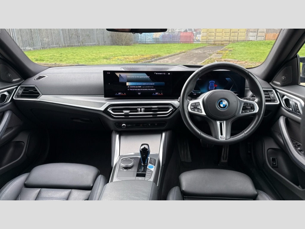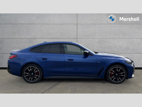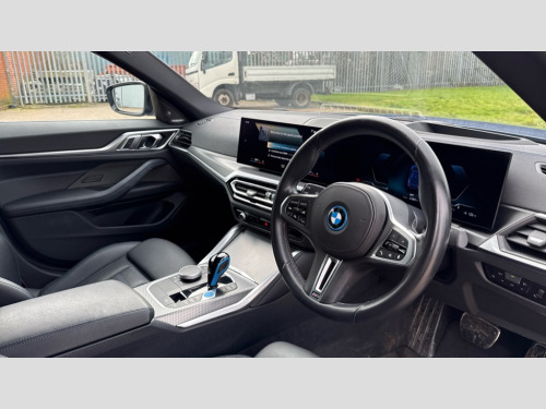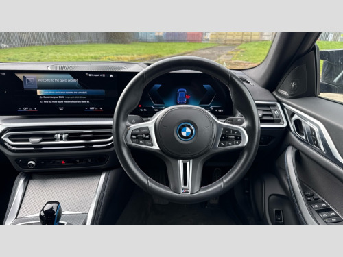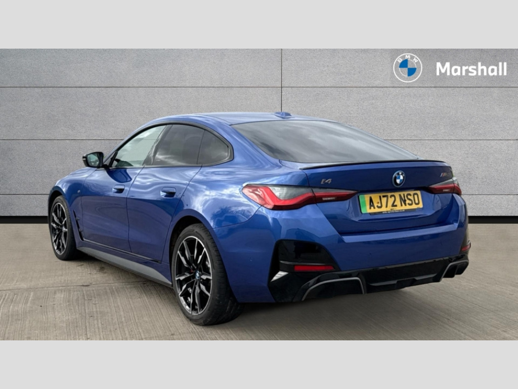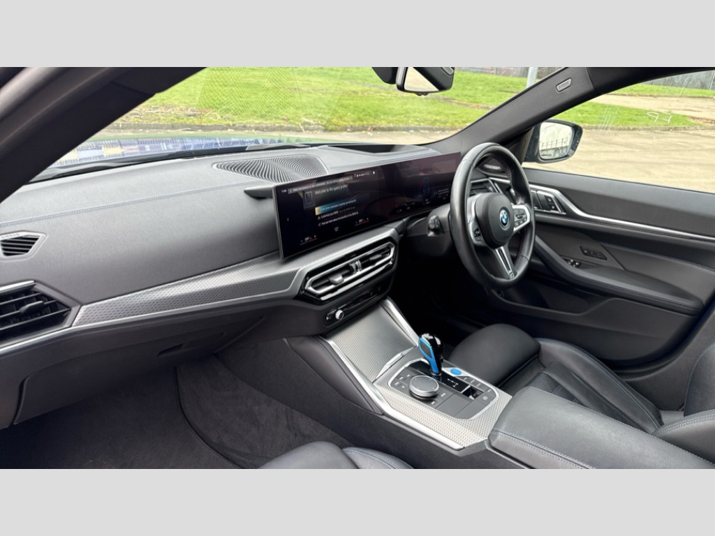 BMW I4 400kW M50 83.9kWh 5dr Auto Active guard plus, Attentiveness assist, Automatic tailgate operation, BMW legal emergency call, BMW remote services, BMW Teleservices, Condition based service, Cruise control with brake assist, Drive off assistant, Driving experience switch, Engine start/stop button, iDrive controller, Integrated owners handbook, Live Cockpit Professional with head up display including 12.3" instrument cluster and 14.9" central display, Personal Profile - automatic lock when driving away selectable, Preparation for active cruise control with stop and go, Run flat indicator, Service interval indicator, Smartphone integration, Speed limiter, Storage for wireless charging, Variable sport steering, Widescreen display, AC charging up to 11kW, Adaptive M suspension, DC charging up to 150kW, eDrive exterior sound, Electric drive unit, Electronic differential lock, High voltage battery, Mode 2 flexible charger, Mode 3 charging cable, Safety battery terminal clamp, 2x USB Type C ports in front centre console for charging and data transfer, BMW iconic sound electric, DAB tuner, Harman/Kardon surround sound audio system with 464W amplifier power, 9 channels and 17 speakers, Auto dimming rear view mirror, Auto dimming with folding wing mirrors, BMW individual lights shadow line, BMW radiator grille partially with blue accent, BMW radiator grille with mesh grille/end face of the nuggets in quartz silver matt, Body colour door handles, Electric adjustable exterior mirrors, Electric windows with trap release and convenient opening/closing feature, Exterior mirror heated, Fading support, Follow me home headlights, Front and rear bumper system, Front apron plastic in body colour, Headlight beam throw control, Heated washer jets, High gloss black radiator grille frame, High gloss shadow line exterior trim, High level third brake light, I badge with blue highlight on front ornamental grille, I4 charging socket flap, right, rear in body colour, Integrated outside door handles, flush design, flush integrated, handle recess indirectly illuminated, Lateral blue accent including air breather, LED daytime running lights, LED direction indicator lenses, LED eyebrow light, LED front fog lights, LED rear lights, M Sport entry door sill strips, M Sport spoiler, Mirror glass aspheric on driver's side, convex on passenger side, Model logo - Rear and right model designation, Rear left i4 inscription, Number plate panel integrated into front bumper and tailgate, One piece front bumper cover including towing eye cover in body colour, Rain sensor including auto headlights activation, Rear bumper with blue accent, Rear side wing doors, Rear wiper, Reversing light, Roof fin in body colour, Side frame trim strip in black matt, Side LED indicators, Sun protection glass, Trailer stabilisation logic, Turn indicators in side mirrors, Visible VIN plate, Welcome lighting, Window cavity seal in black matt, 12v power outlet - luggage side, 12V power outlet in front console, 2 front cupholder in centre console with clamping elements and matt black inlay, 3 seat bench in 2nd row, 3 spoke leather M sport multifunction sports steering wheel, 40:20:40 split folding rear seat and rear centre armrest with two cupholders, Adjustable steering column, Ambient door pocket lighting, Ambient inside door handle light in rear, Ambient interior lighting with 11 pre-defined selectable light designs including 6 colours, Ambient light design projected onto the left and right entering and exiting area, Ambient storage compartment lighting in the centre console, Anthracite headlining, Automatic air conditioning with 3 zone control, BMW ID, Compartment in front of cupholder, Contour lighting in instrument panel and door trim panel, Driver seat backrest width adjustment, Dynamic function of contour lighting, Electric memory seats, Front and rear ambient footwell lighting, Front and rear armrest with integrated door trim, Front and rear door exit lights, Front and rear door pockets, Glovebox light, Headrests for all seats, Heated front seats, Illuminated armrest storage compartment, Interior light and reading light, Lashing eyelets in boot, Luggage compartment light, Make-up mirror lights, Rear storage compartment, Single front passenger seat, Storage tray and compartment with cover in centre console, Sunvisors with vanity mirrors and ticket pocket, Through loading system, Toolkit, Velour floor mats, Driving assistant pack - I4, M Sport exterior styling pack - I4 MPA, 3 point seatbelts on all seats, Acoustic protection for pedestrians, Active protection, Anti lock braking system (ABS) with brake assist, Automatic Stability Control (ASC), Battery safety cut-off, Brake drying, Brake energy regeneration, Brake pretensioning, Cornering brake control (CBC), Crash sensor activating central locking release, hazard warning lights, Driver and front passenger airbags, Driver and passenger side airbags, Driver/passenger seat occupancy sensor, Dynamic brake control, Dynamic stability control + (DSC+), Dynamic Traction Control - DTC, Electromechanical parking brake, Front and rear curtain airbags, Front and rear ventilated brake disc, Head airbags for all 4 outer seats, Hill start assistant, ISOFIX child seat mounting on rear outer seats, M seat belts, M Sport red brake calipers, Manual child lock in rear doors, Recuperation system, Side impact protection, Twin horns, Tyre pressure sensor, Warning triangle and first aid kit, Alarm system, Central locking including 2 vehicle keys with integrated emergency key, Central locking switch for all doors, fuel filler cap and luggage compartment, Electronic vehicle immobiliser, Interior centre lock switch, Locking wheel bolts, Tyre repair kit