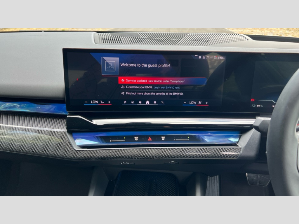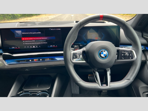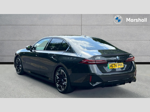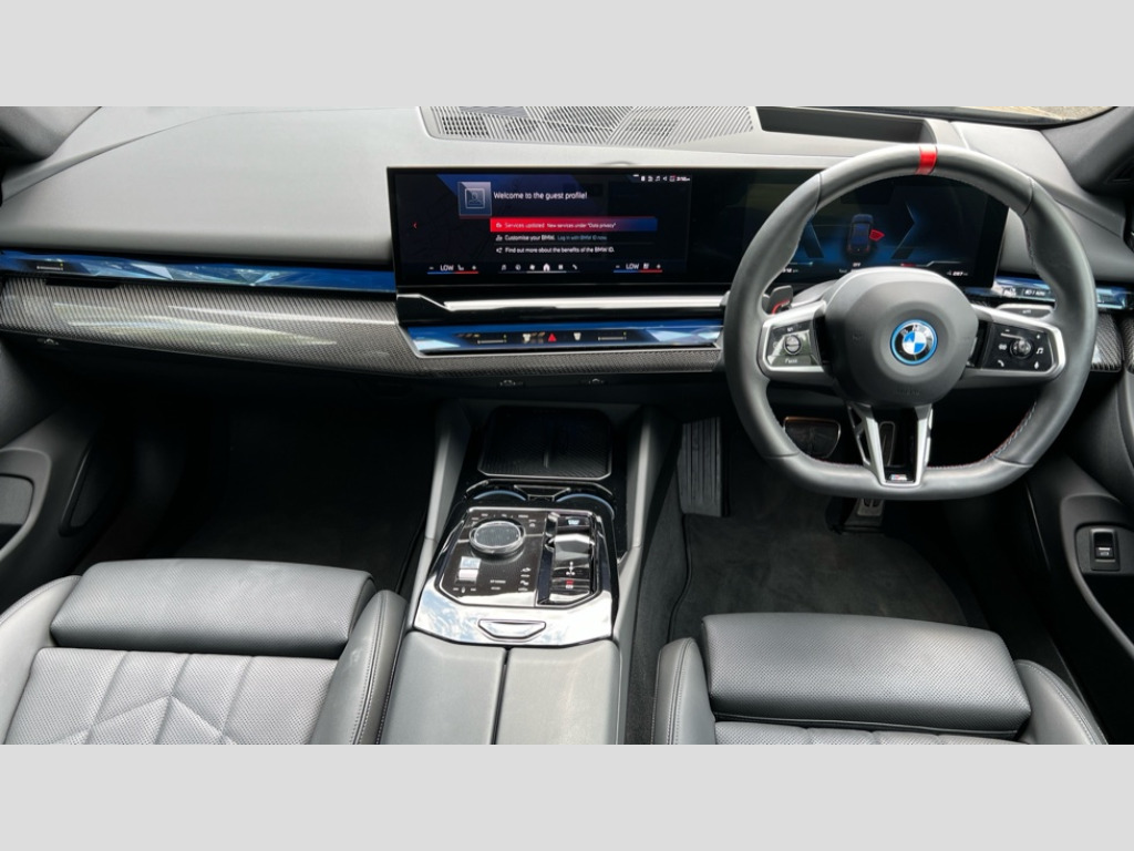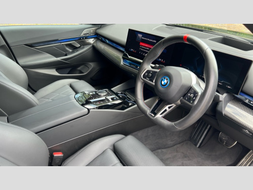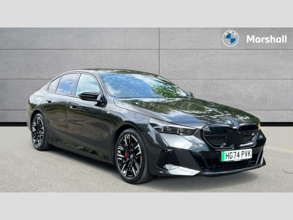 BMW I5 442kW M60 xDrive 84kWh 4dr Auto BMW ConnectedDrive online services, BMW Iconic sounds electric, BMW legal emergency call, BMW Teleservices, Brake pad wear indicator, Cruise control with brake assist, Driving Assistant Plus Preparation, Front collision warning with brake intervention, Lane departure warning with active return, Left turn warning with brake function, Multifunctional instrument panel, Oil sensor for level and grade, On board computer inc. average speed, fuel consumption, liquid crystal Info display, journey computer, outside temperature display, personal profile, On-board diagnosis - OBD, PAS, Personal e-SIM, Powered by Operating System 7.0, Run flat indicator, Service interval indicator, Speed limit Info with manual speed limit assist, AC charging cable professional (mode 3) for public charging, AC charging professional 22kW, Launch control, Bowers and Wilkins surround sound system, DAB tuner, Acoustic glazing, Adaptive LED Headlights, Automatic cornering lights, Automatic windscreen wipers and automatic headlight, BMW selective beam, Body colour door handles, Body coloured bumpers, Dynamic brake lights with LED technology, Electric front and rear windows with fingertip open/close + anti-trap facility and comfort closing function, Exterior mirrors with memory function and automatic parking function, Follow me home headlight function, Headlight elements in blue, Heated windscreen washer jets, LED daytime running lights, LED third brake light, Light colour close to that of ordinary daylight, M high gloss shadow line with extended contents - Radiator grille frame, struts and strip in rear light, M light shadowline - Dark design of selected elements of the headlight and rear lights, Optimum, homogeneous illumination of the road, Rear boot, Rear side wing doors, Sun protection glass, 3 seat bench in 2nd row, 3 spoke leather M steering wheel in BMW M specific design with M badge, Armrest - front and rear integrated door trim, centre console includes storage compartment, rear centre includes 2 cupholders, Four zone automatic air conditioning, High-gloss black door switch cluster, power window switch and tailgate button on first and second row seat, M Sport pedal covers in stainless steel, Rear headrests, Single front passenger seat, Through loading system with 40/20/40 rear seat backrest split, Velour floormats, Wireless charging tray, Ambient lighting pack - 5 Series/I5, BMW Iconic glow kidney grille exterior package, Connected package professional - 5 Series/I5, Driving assistance pack - 5 Series/I5, Expanded exterior mirror package - 5 series/I5, M high gloss shadow line pack - 5 Series/ I5, M Sport exterior styling pack - 5 Series/I5, 3 rear three point seatbelts, Acoustic protection for pedestrians, Active protection, Airbag deployment is controlled with respect to the intensity and scope, Anti-lock braking system (ABS), Brake assist, Brake energy regeneration, Cornering brake control (CBC), Crash sensor activating central locking release, hazard warning lights, fuel cut off and interior lighting, Driver and front passenger airbags, Driver central airbag, Driver/front passenger side airbags, DSC - Dynamic Stability Control, Dynamic brake control, Dynamic Traction Control - DTC, Electromechanical parking brake with automatic drive away release and auto hold function, Electronic brake force distribution, Engine drag torque control, Front and rear brake discs with interior ventilation, Front and rear curtain airbags, Front head restraints with anti-whiplash, Head airbags for first and second row seats, Hill start assist, Locking of doors after driving off, M seat belts, M Sport brakes in high gloss red painted brake callipers with M designation, Mechanical child proof lock on rear doors, PC iBrake PostCrash approach control warning with light braking function, Side impact protection, Trailer stability control, Two tone horn, Tyre pressure monitoring system, Warning triangle and first aid kit, Alarm system, Locking wheel bolts including wheel bolt adapter, Tyre repair kit plus