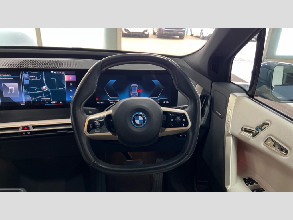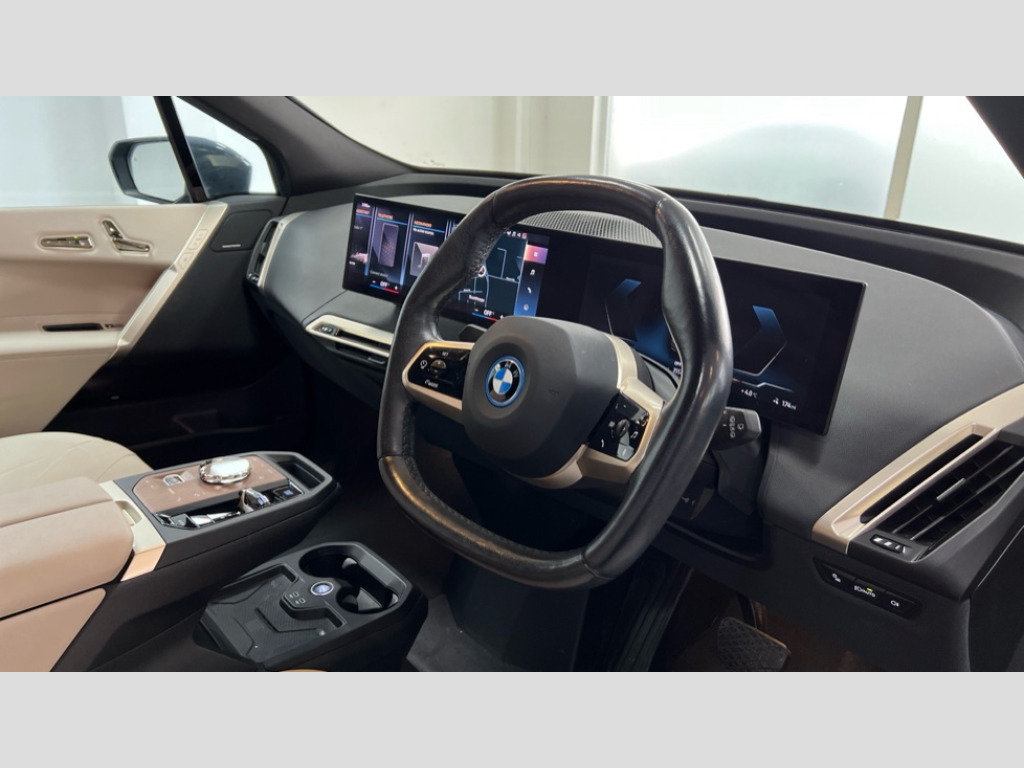 BMW Ix 240kW xDrive40 M Sport 76.6kWh 5dr Auto Attentiveness assist, BMW ConnectedDrive online services, BMW Iconic sounds electric, BMW Natural interaction, BMW Teleservices, Brake pad wear indicator warning light, Condition based service, Electric Power Steering (EPS) with Servotronic, Engine start/stop button, iDrive controller, Integrated owners handbook, Live Cockpit Professional with head up display including 12.3" instrument cluster and 14.9" central display, Service interval indicator, Speed limiter, AC charging up to 11kW, BMW xDrive system, DC charging up to 150kW, Double wishbone front axle, eDrive exterior sound, Electric drive unit, Flexible charger, High voltage 71kWh battery, Mode 3 charging cable, DAB Tuner enables digital radio reception, Harman/Kardon surround sound audio system with 18 speakers and 655W, Personal eSim, USB connections (2 x Type C in cupholder area and 2 x Type C on rear of front seats), Body colour plastic front apron, Body colour roof fin, Charging flap in rear right side panel, Climate comfort windscreen, Daylight driving lights, Dynamic brake lights, Electric integrated door handles flush with the door surface, Follow me home headlight function, Frameless interior mirror, Front and rear electric windows, Fuel filler flap - right rear in body colour, Heated windscreen washer jets, High beam assistant, Integrated direction indicators, LED rear lights, Licence plate panel integrated into front bumper and tailgate, M sport specific bumpers, Mirror base in black matt, Model logo - iX on left of tailgate and xDrive model inscription and model designation on right of tailgate, One piece front bumper cover including towing eye cover in body colour, Rain sensor + automatic driving lights control, Rear side wing doors, Rear window wiper, Side frame decorative moulding black high gloss, Sky Lounge panoramic glass sunroof, Sun protection glass, Third brake light featuring LED technology, Welcome light carpet, Window cavity cover in black high gloss, 12V - Power sockets with front centre console and luggage compartment, 2 Integrated head restraints in the outer seats, one height-adjustable head restraint for the centre seat, 2 spoke polygonal steering wheel, 3 seat bench in 2nd row, 40:20:40 split folding rear seat backrests, Adjustable steering column, Ambient interior lighting, Anthracite headlining, BMW ID, Driver and front passenger heated seats, Fixed luggage compartment cover, Four cupholders (2 front and 2 in rear centre arm rest), Four lashing eyes in luggage compartment, Four zone automatic air conditioning, Front and rear door pockets, Glove box with electric unlocking (button next to glove box lid), Headrests for all seats, High gloss black shadow line, Interior light - Front/rear reading light, glovebox, centre console storage, front footwell, makeup mirro, Luggage compartment and Fire place light, Luggage compartment floor panel with integral storage tray, Multifunction hooks, Rear centre armrest, Seat back with flap pocket, Single front passenger seat, Split folding rear seats, Stationary cooling, Storage tray and compartment with cover in centre console, Sun visors, Wireless charging tray, Connected package professional - iX, Driving assistant professional pack - iX, Expanded exterior mirror pack - iX, M Sport aerodynamics bodystyling pack - iX, Active protection, Anti-lock braking system (ABS), BMW emergency call, Brake energy regeneration, Child locks on rear doors, Child seat ISOFIX attachment rear outer seats, Crash sensor, Driver and front passenger airbags, Driver and passenger side airbags, DSC - Dynamic Stability Control with extended contents, Electromechanical parking brake, Front brake discs with interior ventilation, Head airbags for 1st and 2nd seat row, Hill start assistant, Integrated sport braking system, Passive protection for pedestrians, Rear brake discs with interior ventilation, Recuperation system, Seat occupancy detection for driver and passenger side, Side impact protection, Three point seat belts for all four seats, Two tone horn, Tyre pressure sensor, Warning triangle and first aid kit, Alarm system, Closing system with central locking, Engine immobiliser, Interior centre lock switch, Keyless engine start, Locking wheel bolts, Two vehicle keys, Diagonal stitching on seats, Tool kit, Tyre repair kit