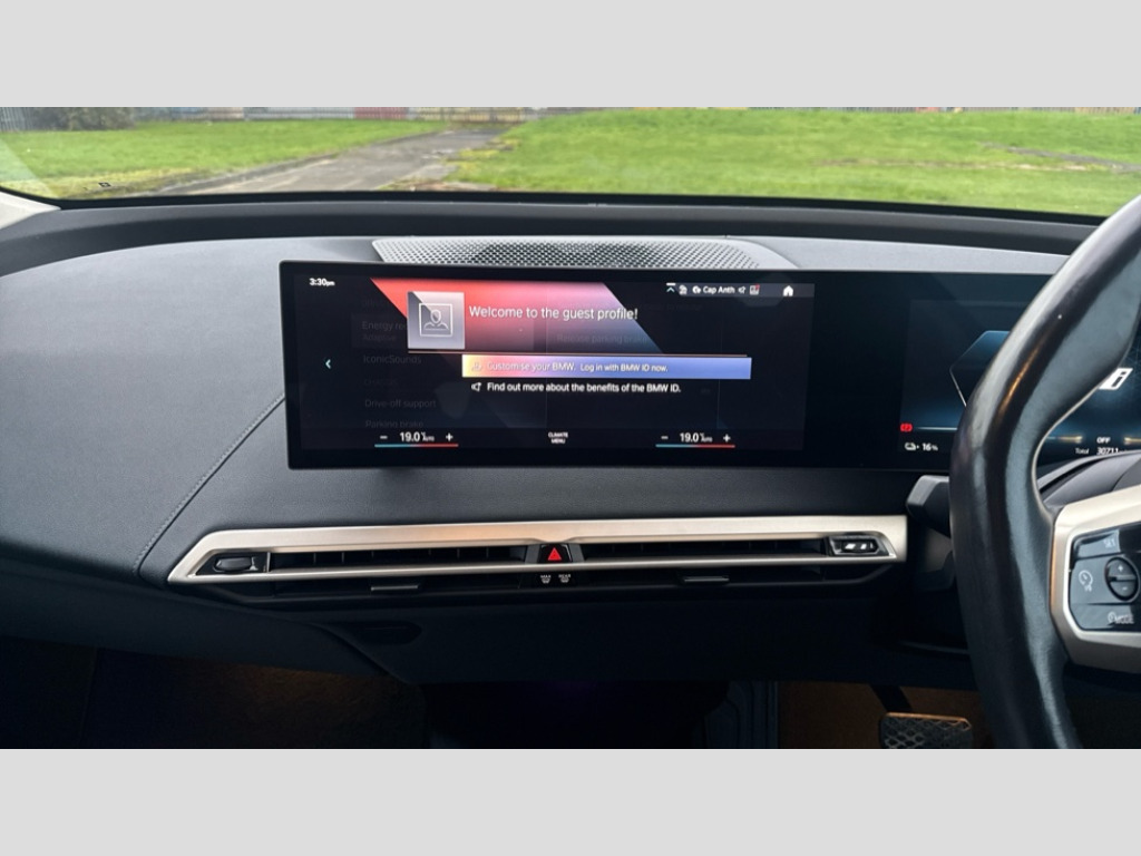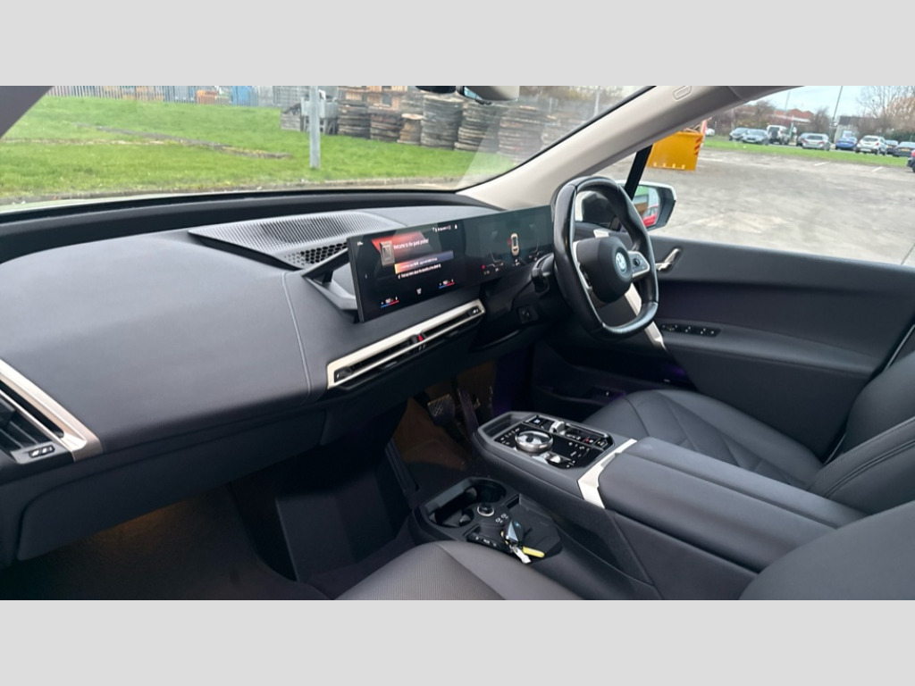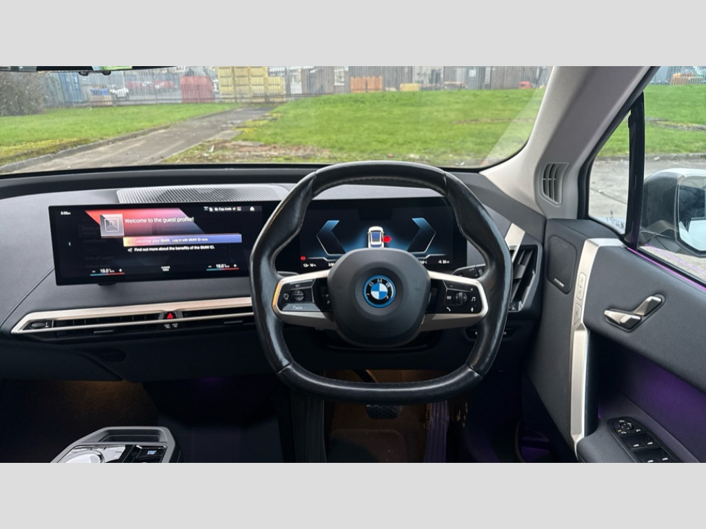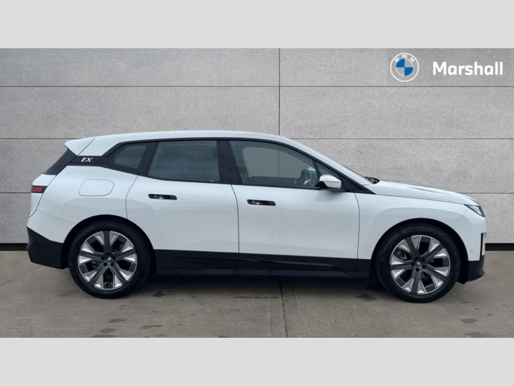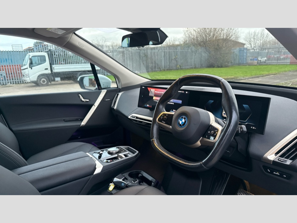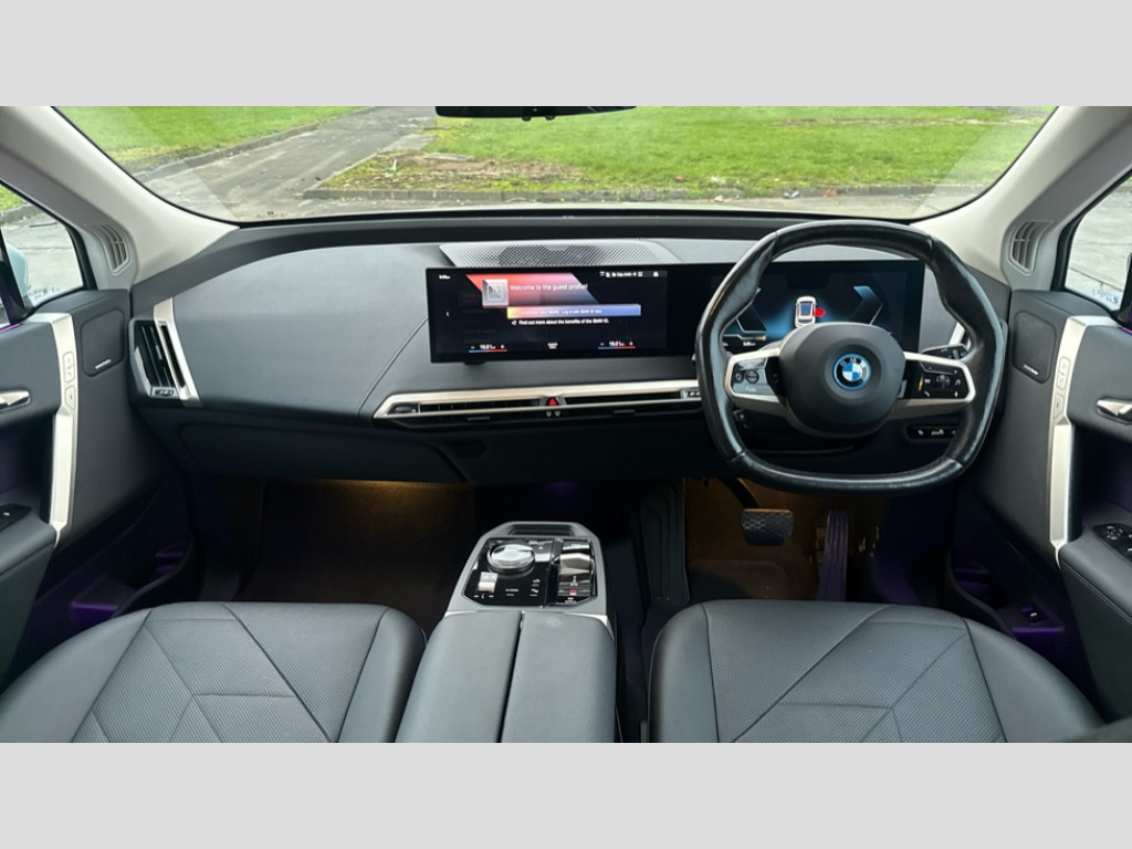 BMW Ix 240kW xDrive40 Sport 76.6kWh 5dr Auto Attentiveness assist, BMW ConnectedDrive online services, BMW Iconic sounds electric, BMW Live cockpit plus with navigation function and BMW maps, BMW Natural interaction, BMW Teleservices, Brake pad wear indicator warning light, Condition based service, Electric Power Steering (EPS) with Servotronic, Electric tailgate, Engine start/stop button, iDrive controller, Integrated owners handbook, Live Cockpit Professional with head up display including 12.3" instrument cluster and 14.9" central display, Service interval indicator, Speed limiter, AC charging up to 11kW, BMW xDrive system, DC charging up to 150kW, Double wishbone front axle, eDrive exterior sound, Electric drive unit, High voltage 71kWh battery, Mode 2 flexible charger, Mode 3 charging cable, DAB Tuner enables digital radio reception, Harman/Kardon surround sound audio system with 18 speakers and 655W, Personal eSim, USB connections (2 x Type C in cupholder area and 2 x Type C on rear of front seats), Automatic beam throw control, BMW emblem on engine compartment lid and tailgate, Body colour door mirrors, Body colour plastic front apron, Body colour roof fin, Body coloured bumpers, Charging flap in rear right side panel, Climate comfort windscreen, Dynamic brake lights, Electric integrated door handles flush with the door surface, Follow me home headlight function, Frameless interior mirror, Front and rear bumper system with replaceable deformation elements, Front and rear electric windows, Fuel filler flap - right rear in body colour, Heated windscreen washer jets, High beam assistant, Integrated direction indicators, LED daytime running lights, LED licence plate lights, LED rear lights, Licence plate panel integrated into front bumper and tailgate, Mirror base in black matt, Model logo - iX on left of tailgate and xDrive model inscription and model designation on right of tailgate, One piece front bumper cover including towing eye cover in body colour, Rain sensor + automatic driving lights control, Rear side wing doors, Rear window wiper, Side frame decorative moulding black high gloss, Third brake light featuring LED technology, Welcome light carpet, Window cavity cover in black high gloss, 12V - Power sockets with front centre console and luggage compartment, 2 Integrated head restraints in the outer seats, one height-adjustable head restraint for the centre seat, 2 spoke polygonal steering wheel, 3 seat bench in 2nd row, 40:20:40 split folding rear seat backrests, Ambient door pocket lighting in front, Ambient interior lighting, Area lighting in the door trim panel, BMW ID, Door entry lights in the front door trim panel, Dynamic function of contour lighting - welcome, goodbye, open doors, phone call, Electric adjustable steering column, Fixed luggage compartment cover, Four cupholders (2 front and 2 in rear centre arm rest), Four lashing eyes in luggage compartment, Four zone automatic air conditioning, Front and rear door pockets, Glove box with electric unlocking (button next to glove box lid), Headrests for all seats, Interior door handle lighting in front and rear, Interior light - Front/rear reading light, glovebox, centre console storage, front footwell, makeup mirro, Luggage compartment and Fire place light, Luggage compartment floor panel with integral storage tray, Multifunction hooks, Rear centre armrest, Seat back with flap pocket, Single front passenger seat, Split folding rear seats, Stationary cooling, Storage tray and compartment with cover in centre console, Sun visors, Wireless charging tray, Connected package professional - iX, Driving assistant professional pack - iX, Expanded exterior mirror pack - iX, Active protection, Anti-lock braking system (ABS), BMW emergency call, Brake energy regeneration, Child locks on rear doors, Child seat ISOFIX attachment rear outer seats, Cornering brake control (CBC), Crash sensor, Driver and front passenger airbags, Driver and passenger side airbags, DSC - Dynamic Stability Control with extended contents, Electromechanical parking brake, Front brake discs with interior ventilation, Head airbags for 1st and 2nd seat row, Hill start assistant, Integrated brake system, Passive protection for pedestrians, Rear brake discs with interior ventilation, Recuperation system, Seat occupancy detection for driver and passenger side, Side impact protection, Three point seat belts for all four seats, Two tone horn, Tyre pressure sensor, Warning triangle and first aid kit, Alarm system, Closing system with central locking, Engine immobiliser, Interior centre lock switch, Keyless engine start, Locking wheel bolts, Two vehicle keys, Diagonal stitching on seats, Tool kit, Tyre repair kit