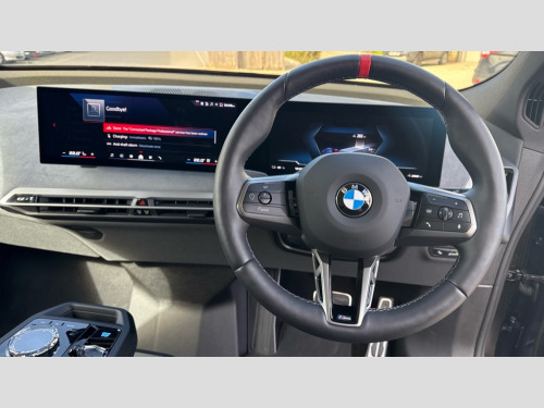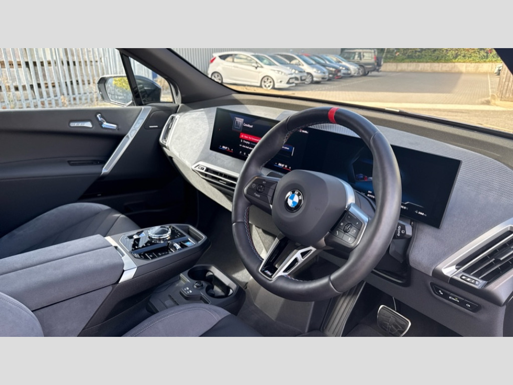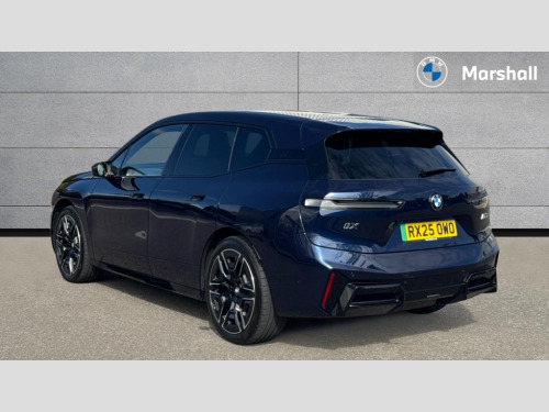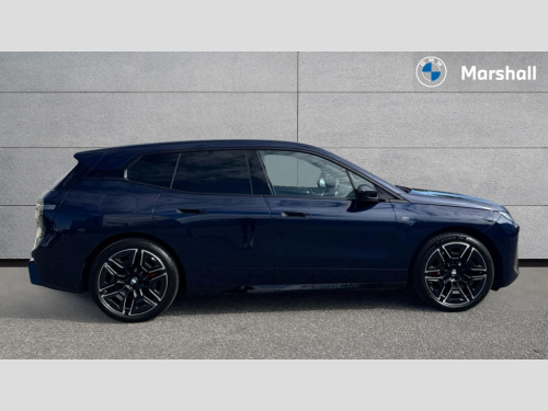 BMW Ix 485kW M70 xDrive 112kWh 5dr Auto Attentiveness assist, BMW ConnectedDrive online services, BMW Iconic sounds electric, BMW Live cockpit plus with navigation function and BMW maps, BMW Natural interaction, BMW Teleservices, Brake pad wear indicator warning light, Condition based service, Electric Power Steering (EPS) with Servotronic, Electric tailgate, Engine start/stop button, Great Britian/Ireland verison, iDrive controller, Integral active steering, Integrated owners handbook, Language version English, Live Cockpit Professional with head up display including 12.3" instrument cluster and 14.9" central display, On board documentation English, Service interval indicator, Speed limiter, Adaptive 2-axle air suspension, BMW xDrive system, DC charging up to 150kW, Double wishbone front axle, eDrive exterior sound, Electric drive unit, High voltage 71kWh battery, Mode 3 charging cable, DAB Tuner enables digital radio reception, Personal eSim, USB connections (2 x Type C in cupholder area and 2 x Type C on rear of front seats), Adaptive LED headlights with high beam assist, Automatic beam throw control, BMW emblem on engine compartment lid and tailgate, BMW Iconic glow kidney grille, Body colour door mirrors, Body colour plastic front apron, Body colour roof fin, Body coloured bumpers, Charging flap in rear right side panel, Climate comfort windscreen, Dynamic brake lights, Electric integrated door handles flush with the door surface, Follow me home headlight function, Frameless interior mirror, Front and rear bumper system with replaceable deformation elements, Front and rear electric windows, Fuel filler flap - right rear in body colour, Heated windscreen washer jets, High beam assistant, Integrated direction indicators, LED daytime running lights, LED licence plate lights, LED rear lights, Licence plate panel integrated into front bumper and tailgate, M Sport exterior styling, M sport specific bumpers, Mirror base in black matt, Model logo - iX on left of tailgate and xDrive model inscription and model designation on right of tailgate, One piece front bumper cover including towing eye cover in body colour, Rain sensor + automatic driving lights control, Rear side wing doors, Rear window wiper, Side frame decorative moulding black high gloss, Sky Lounge panoramic glass sunroof, Sun protection glass: darkened glass for rear screen and rear side windows, Third brake light featuring LED technology, Welcome light carpet, Window cavity cover in black high gloss, 12V - Power sockets with front centre console and luggage compartment, 2 Integrated head restraints in the outer seats, one height-adjustable head restraint for the centre seat, 3 seat bench in 2nd row, 3 spoke M sport leather multifunction steering wheel, 40:20:40 split folding rear seat backrests, Ambient door pocket lighting in front, Ambient interior lighting, Anthracite headlining, Area lighting in the door trim panel, BMW ID, Door entry lights in the front door trim panel, Dynamic function of contour lighting - welcome, goodbye, open doors, phone call, Electric adjustable steering column, Fixed luggage compartment cover, Four cupholders (2 front and 2 in rear centre arm rest), Four lashing eyes in luggage compartment, Four zone automatic air conditioning, Front and rear door pockets, Glove box with electric unlocking (button next to glove box lid), Headrests for all seats, Interior door handle lighting in front and rear, Interior light - Front/rear reading light, glovebox, centre console storage, front footwell, makeup mirro, Luggage compartment and Fire place light, Luggage compartment floor panel with integral storage tray, M Interior accents in dark silver, Mobile phone tray in the front centre console in good view of the driver, Multifunction hooks, Rear centre armrest, Seat back with flap pocket, Single front passenger seat, Split folding rear seats, Stationary cooling, Storage space underneath the floor insert, Storage tray and compartment with cover in centre console, Sun visors, Velour floor mats, Wireless charging tray, Connected package professional - iX, Driving assistant professional pack - iX, Expanded exterior mirror pack - iX, M sport pro pack - iX, Technology plus pack with Park assistant pro inc Park assistance plus - iX, Active protection, Anti-lock braking system (ABS), BMW emergency call, Brake energy regeneration, Child locks on rear doors, Child seat ISOFIX attachment rear outer seats, Cornering brake control (CBC), Crash sensor, Driver and front passenger airbags, Driver and passenger side airbags, DSC - Dynamic Stability Control with extended contents, Electromechanical parking brake, Front brake discs with interior ventilation, Head airbags for 1st and 2nd seat row, Hill start assistant, Integrated brake system, Integrated sport braking system, Passive protection for pedestrians, Rear brake discs with interior ventilation, Recuperation system, Seat occupancy detection for driver and passenger side, Side impact protection, Three point seat belts for all four seats, Two tone horn, Tyre pressure sensor, Warning triangle and first aid kit, Alarm system, Closing system with central locking, Comfort access system with BMW digital key plus, Engine immobiliser, Interior camera, Interior centre lock switch, Keyless engine start, Locking wheel bolts, Diagonal stitching on seats, Tool kit, Tyre repair kit