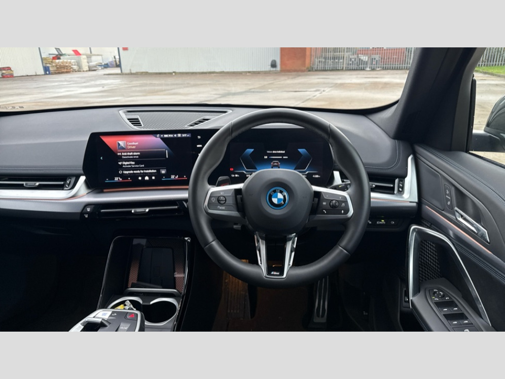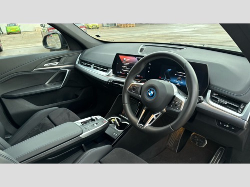 BMW Ix1 150kW eDrive20 M Sport 65kWh 5dr Auto Attentiveness assist, BMW Live Cockpit Plus with 10.25" instrument cluster and 10.7" display, BMW Online services, BMW Operating system 9 with BMW Maps, real-time traffic information, in-car experiences, remote services and smartphone integration, BMW Teleservices, Brake pad wear indicator, Condition based service, Connected eDrive Services, Drive off assistant, Electrically opening/closing tailgate with opening/closing with remote control and contactless opening and closing, iDrive controller, Language version English, My Modes, Parking Assistant with Reversing Assistant, active PDC, Lateral Parking Aid, Rear View Camera and Park Distance Control, Personal Profile - automatic lock when driving away selectable, Servotronic PAS, Tyre puncture warning system, Widescreen display, eDrive exterior sound, EU6 emissions management, Fast charging cable professional mode 3 for public charging, M Adaptive suspension, Performance Control, BMW Personal eSim, DAB Digital radio, Badge on engine compartment lid and tailgate, Body colour door mirrors, Dynamic brake lights, Electric adjustable heated door mirrors, Electric windows - front and rear, with open/close fingertip control, anti-trap facility and comfort closing, Folding door handles integrated flush with surface, Follow me home headlights, Front and rear bumper panel with M specific design, in body colour with inserts in black high gloss, Front door exit lights, Heated rear window, High gloss shadowline, Invisible exhaust tailpipe, Key with M identification, LED 3rd brake light integrated in rear spoiler, LED daytime running lights, LED number plate light, M identification on the sides, M roof rails high gloss shadow line, M specific radiator grille in satinated aluminium, Matt black roof strips, Model inscription on right tailgate, Rain sensor including auto headlights activation, Rear cover painted in BMW I blue, Rear side wing doors, Rear wiper, Sill cover in body colour, Trailer stabilisation logic, Windscreen washer nozzle for rear view camera, Windscreen wipers front with heated washer nozzles, 12V - Power sockets with front centre console and luggage compartment, 2 bag hooks in luggage compartment, 2 cup holders in front, 2 x USB Type C ports for charging in front centre console + 2 x USB Type C ports for charging in rear centre console, 3 rear headrests, 3 seat bench in 2nd row, 3 upper retaining strap clips integrated into rear panels of seat backrests, 4 grab handles, 40:20:40 split folding rear seats, Ambient interior lighting, Anthracite headlining, Anthracite Velour front and rear floormats, Bottle trays in all doors, Child seat ISOFIX attachment for two outer rear seats and front passenger seat with anchorage points, Clothes hook rear, Driver and front passenger heated seats, Dual zone automatic air conditioning, Front and rear door pockets, Front and rear footwell lighting, Front centre console storage compartment, Front/rear adjustable head restraints, Glove compartment, Interior door handle recess light on all doors, Light on right in luggage compartment, M sport leather steering wheel, Manual steering column height and depth adjustment, Middle centre console storage compartment, One piece parcel shelf opens together with tailgate and removable, Rear armrest in door trim panel, Single front passenger seat, Sport leather multifunction steering wheel with thumbrests and operation of instrument display, audio, telephone and driver assistance, Storage compartment net in left side trim panel, Storage compartment with folding cover under centre console armrest cushion, Storage tray in right side trim panel, Tilt adjustment incl. cargo function of 2nd row of seats, Vanity mirror lights, ABS/EBD, Automatic hold function, Automatic Stability Control (ASC), BMW emergency call, Braking readiness, Cornering brake control (CBC), Crash Sensor - activates hazard/interior lighting + unlocks doors, Driver/Front Passenger airbags, Driver/front passenger side airbags, Dry braking, Dynamic brake control, Dynamic stability control + (DSC+), Electromechanical parking brake, Energy recovery system, First aid kit, Front and rear brake discs, Front and rear head airbags, Front passenger airbag deactivation, Integrated brake system, PC iBrake PostCrash approach control warning with light braking function, Rear door child safety locks, Three point seat belts in all seats, Tyre pressure monitor, Warning triangle, Alarm system with tilt sensor, monitoring doors, bonnet interior and tailgate, Closing system with central locking, Locking wheel bolts, Luxury instrument panel, Tyre repair kit plus