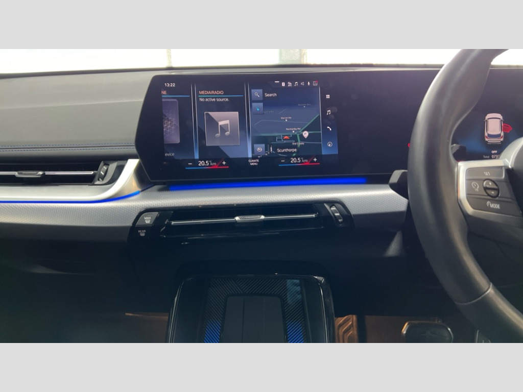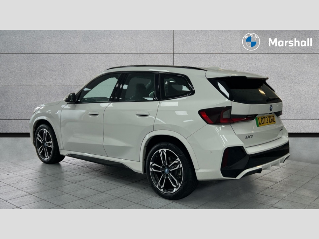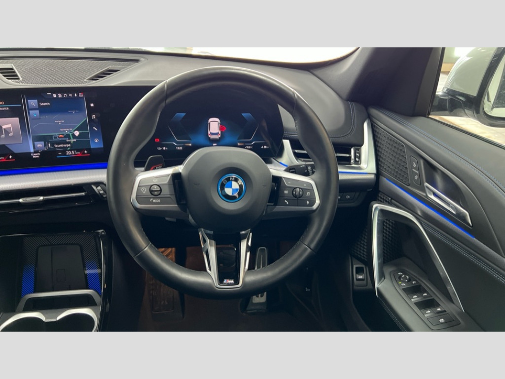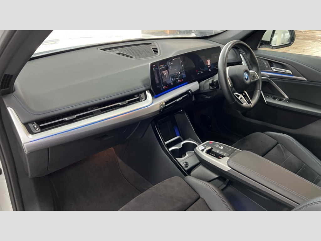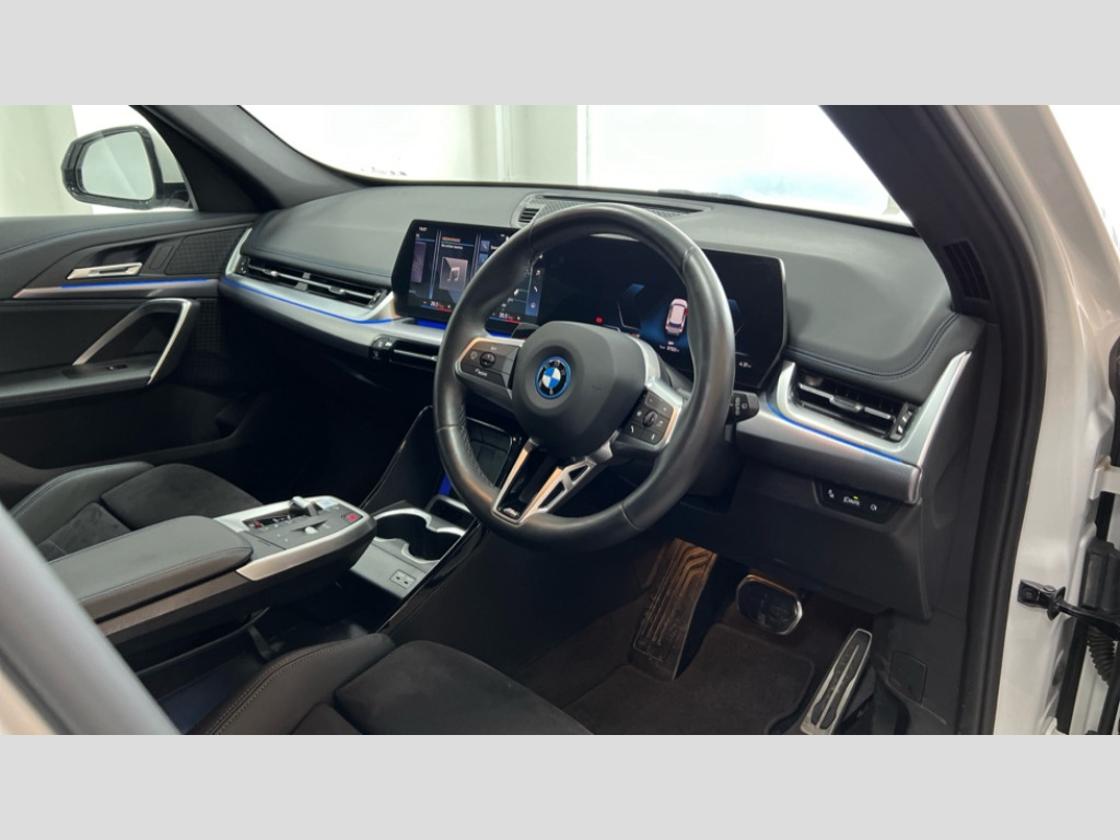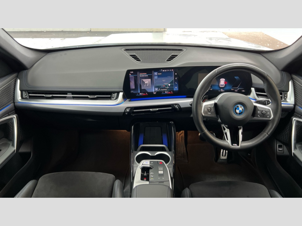 BMW Ix1 230kW xDrive30 M Sport 65kWh 5dr Auto Attentiveness assist, BMW Live Cockpit Plus with 10.25" instrument cluster and 10.7" display, BMW Online services, BMW Operating system 9 with BMW Maps, real-time traffic information, in-car experiences, remote services and smartphone integration, BMW Teleservices, Brake pad wear indicator, Condition based service, Connected eDrive Services, Drive off assistant, Electrically opening/closing tailgate with opening/closing with remote control and contactless opening and closing, iDrive controller, Language version English, My Modes, Parking Assistant with Reversing Assistant, active PDC, Lateral Parking Aid, Rear View Camera and Park Distance Control, Personal Profile - automatic lock when driving away selectable, Servotronic PAS, Tyre puncture warning system, Widescreen display, eDrive exterior sound, EU6 emissions management, Fast charging cable professional mode 3 for public charging, M Adaptive suspension, Performance Control, xDrive intelligent four wheel drive system, BMW iconic sound electric, DAB Digital radio, Badge on engine compartment lid and tailgate, Dynamic brake lights, Electric adjustable heated door mirrors, Electric windows - front and rear, with open/close fingertip control, anti-trap facility and comfort closing, Folding door handles integrated flush with surface, Follow me home headlights, Front and rear bumper panel with M specific design, in body colour with inserts in black high gloss, Front door exit lights, Front entry sills aluminium inserts with M inscription, Heated rear window, High gloss shadow line incl A/B/C-pillar panel/window frame/recess finish strip/window rail front door/mirror frame/cover panel in high gloss black, Invisible exhaust tailpipe, Key with M identification, LED 3rd brake light integrated in rear spoiler, LED daytime running lights, LED number plate light, M identification on the sides, M roof rails high gloss shadow line, M specific radiator grille in satinated aluminium, Matt black roof strips, Rain sensor including auto headlights activation, Rear cover painted in BMW I blue, Rear side wing doors, Rear wiper, Side sill covers with M specific design in body colour, Trailer stabilisation logic, Windscreen washer nozzle for rear view camera, Windscreen wipers front with heated washer nozzles, 12V - Power sockets with front centre console and luggage compartment, 2 bag hooks in luggage compartment, 2 cup holders in front, 2 x USB Type C ports for charging and data transmission (front centre console) and 2 x USB Type C ports for charging (rear centre console), 3 rear headrests, 3 seat bench in 2nd row, 3 upper retaining strap clips integrated into rear panels of seat backrests, 40:20:40 split folding rear seats, Ambient interior lighting, Anthracite headlining, Anthracite Velour front and rear floormats, Bottle trays in all doors, Child seat ISOFIX attachment for two outer rear seats and front passenger seat with anchorage points, Clothes hook rear, Driver and front passenger heated seats, Dual zone automatic air conditioning, Front and rear door pockets, Front centre console storage compartment, Front/rear adjustable head restraints, Glove compartment, Light on right in luggage compartment, M sport leather steering wheel, Manual steering column height and depth adjustment, Map pockets, Middle centre console storage compartment, One piece parcel shelf opens together with tailgate and removable, Rear armrest in door trim panel, Single front passenger seat, Sport leather multifunction steering wheel with thumbrests and operation of instrument display, audio, telephone and driver assistance, Storage compartment net in left side trim panel, Storage compartment with folding cover under centre console armrest cushion, Storage tray in right side trim panel, Tilt adjustment incl. cargo function of 2nd row of seats, ABS/EBD, Automatic hold function, Automatic Stability Control (ASC), BMW emergency call, Braking readiness, Cornering brake control (CBC), Crash Sensor - activates hazard/interior lighting + unlocks doors, Driver/Front Passenger airbags, Driver/front passenger side airbags, Dry braking, Dynamic brake control, Dynamic stability control + (DSC+), Electromechanical parking brake, Energy recovery system, First aid kit, Front and rear brake discs, Front and rear head airbags, Front passenger airbag deactivation, Integrated brake system, PC iBrake PostCrash approach control warning with light braking function, Rear door child safety locks, Three point seat belts in all seats, Tyre pressure monitor, Warning triangle, Alarm system with tilt sensor, monitoring doors, bonnet interior and tailgate, Closing system with central locking, Locking wheel bolts, Luxury instrument panel, Tyre repair kit (including Tyre sealant and 12V Compressor)