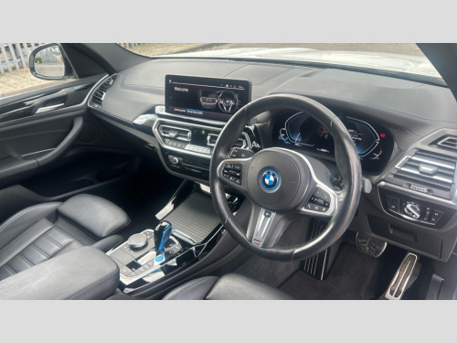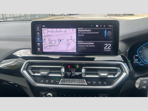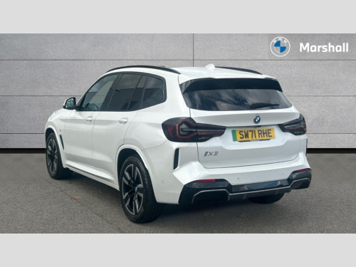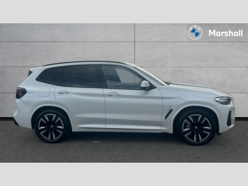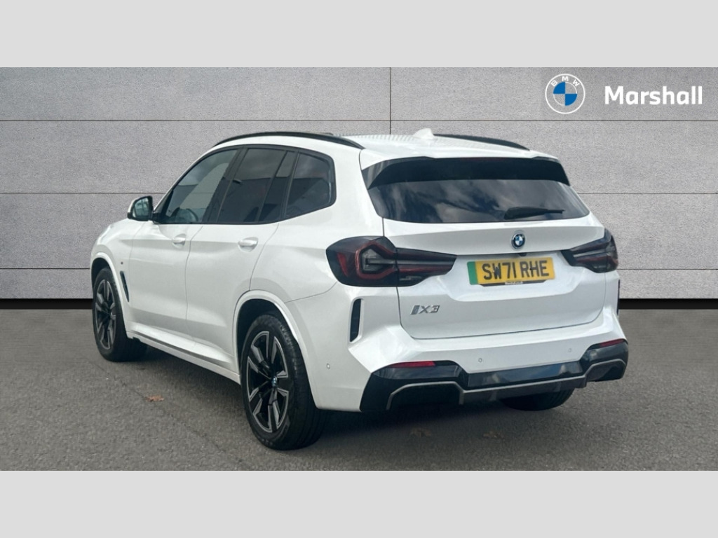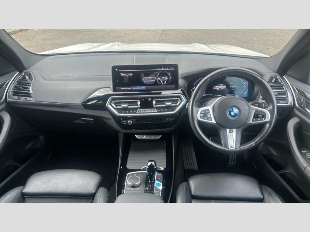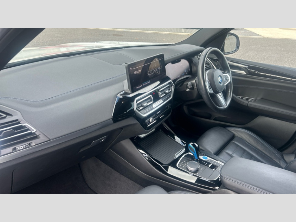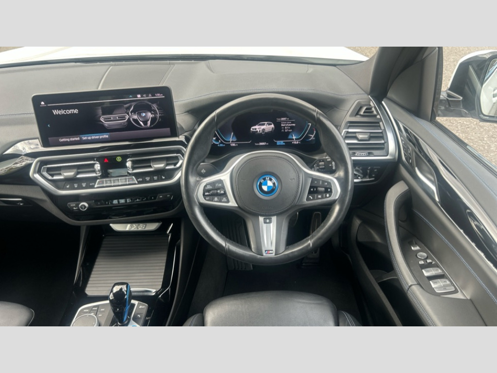BMW Ix3 210kW M Sport 80kWh 5dr Auto Apple car play and Android auto, Attentiveness assist, BMW Live Cockpit Professional with 12.3" instrument display + 12.3" high resolution centre display nav function and Intelligent Voice Assistant, BMW Online services, BMW Teleservices, Brake pad wear indicator, Check control system, Condition based service - BMW service history, electronic service booklet, integrated owner's handbook, Enhanced bluetooth with wireless charging, Front/rear Parking distance control, Lateral parking aid, Parking assistant, PAS, Personal Profile, Reversing assistant, Reversing camera, Start/stop button in blue, Wi-Fi hotspot, eDrive exterior sound, Mode 3 charging cable 22kW, Safety battery terminal clamp, DAB radio, Air breathers with BMW i logo, Blue ring around BMW logos, BMW i badge on the kidney grille, BMW Individual high gloss shadow line with extended contents, Body colour door handles, Body coloured bumpers, Chrome kidney frame, Exterior mirrors electrically adjustable, foldable, heated with memory, auto-dimming drivers side and aspherical on passengers side, Front and rear bumper system with replaceable deformation elements, Full LED rear lights with 3D sculpting, Green tinted heat protection glazing glass, High beam assistant, High gloss black shadow line roof rails, High gloss shadowline exterior trim, Interior rear view electrochromatic mirror with automatic anti dazzle function, LED third brake light, M aerodynamic exterior, M badging on the front side (left and right), M design rear apron with high-gloss black inlays with Frozen grey trim panel, M Sport front bumper with iX3 specific design with blue contents, Metallic paint, Model logo on left tailgate, Model specific design elements - Frozen grey decorative elements and pearl chrome decorative strip, Panoramic glass sunroof, two parts, electric actuation, sliding function, wind deflector, sun protection with floating headliner, Rear diffuser in Blue, Rear side wing doors, Rear wiper, Sun protection glass, Visible VIN plate, Welcome lighting, 12V power socket in front centre console, 3 zone automatic air conditioning, 40:20:40 split folding 3 bench rear seats in 2nd row, Ambient lighting, Anthracite headlining, Blue accent around the logo on the steering wheel, Blue accent on the gear selector, Deletion lumbar support/width adjustment passenger side, Driver and front passenger heated seats, Driver/passenger sunvisors with ticket holders + vanity mirrors, Front and rear headrests, Front Sports electric seats with Driver's side electric backrest width adjustment and memory, Heated steering wheel, Isofix rear child seat preparation, Luggage compartment lighting, M sport leather steering wheel, Passenger side electric backrest width adjustment, Rear centre armrest with 2 cupholders, Seat backrest adjustment for rear seat, Single front passenger seat, Vernasca leather upholstery, Connected pro pack - iX3, Driving assistant professional package - iX3, Extended storage pack - iX3, ABS/EBD, Active protection, Airbags - driver and front passenger, BMW emergency call, Brake energy regeneration, Child proof locking system in rear door, Cornering brake control (CBC), Crash sensor - Activation of airbags, hazard warning lights, battery safety cut-off and interior lighting + deactivation of fuel pump, Driver and passenger side airbags, DSTC-Dynamic Stability and Traction Control, Front and rear brake discs with interior ventilation, Head airbags for first and second row seats, Side impact protection, Three point seatbelts to all seats with front and outer rear pyrotechnic belt tensioners and seat belt force limiters, Two tone horn, Tyre pressure monitoring system, Warning triangle, Central locking switch for all doors, fuel filler cap and luggage compartment, Aluminium rhombicle with pearl chrome interior trim, Galvanic embellisher for controls, Sensatec dashboard, Sensatec instrument panel, 19" Aerodynamic alloy wheels in bicolour style 842, Tyre repair kit (including Tyre sealant and 12V Compressor)