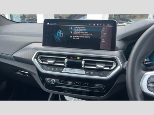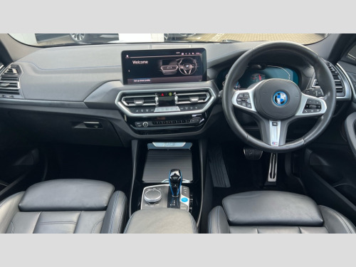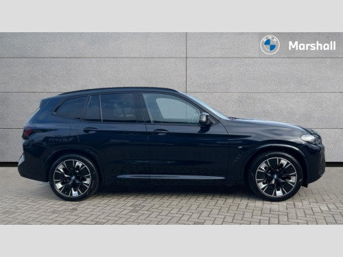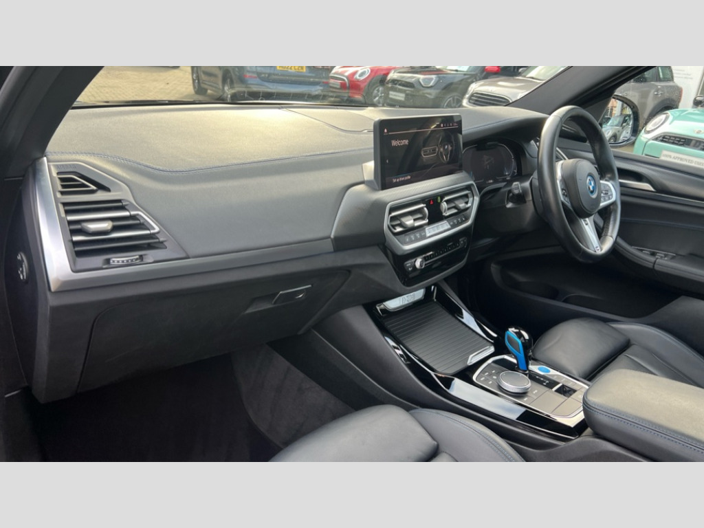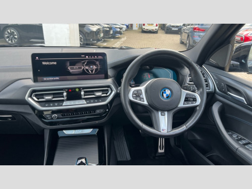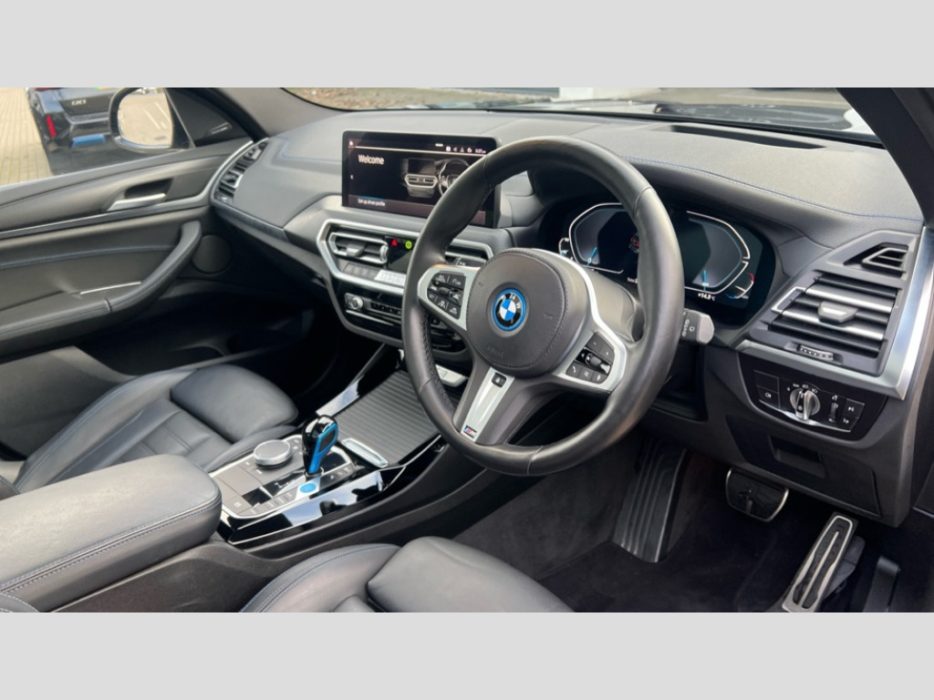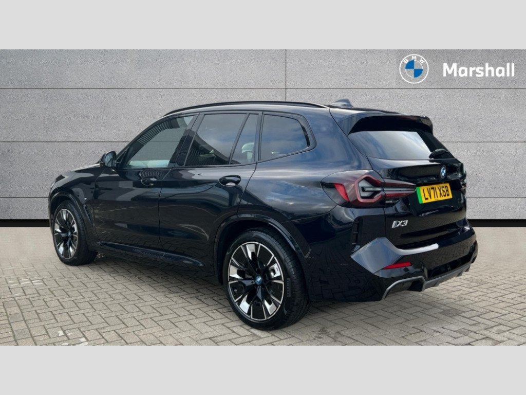 BMW Ix3 210kW M Sport Pro 80kWh 5dr Auto Apple car play and Android auto, Attentiveness assist, BMW Drive recorder, BMW gesture control, BMW Live Cockpit Professional with 12.3" instrument display + 12.3" high resolution centre display nav function and Intelligent Voice Assistant, BMW Online services, BMW Teleservices, Brake pad wear indicator, Check control system, Condition based service - BMW service history, electronic service booklet, integrated owner's handbook, Enhanced bluetooth with wireless charging, Front/rear Parking distance control, Head up Display, Lateral parking aid, Parking assistant plus with 360 degree surround view camera system and remote 3D view, PAS, Personal Profile, Start/stop button in blue, Wi-Fi hotspot, eDrive exterior sound, Mode 3 charging cable 22kW, Safety battery terminal clamp, BMW iconic sound electric, DAB radio, Harman/Kardon surround sound audio system, Acoustic front side windows, Acoustic windscreen, Air breathers with BMW i logo, Black kidney frame, Blue ring around BMW logos, BMW i badge on the kidney grille, BMW Individual high gloss shadow line with extended contents, Body colour door handles, Body coloured bumpers, Extended high gloss shadow line exterior trim, Exterior mirrors electrically adjustable, foldable, heated with memory, auto-dimming drivers side and aspherical on passengers side, Front and rear bumper system with replaceable deformation elements, Full LED rear lights with 3D sculpting, Green tinted heat protection glazing glass, High beam assistant, High gloss black shadow line roof rails, High gloss shadowline exterior trim, Interior rear view electrochromatic mirror with automatic anti dazzle function, LED third brake light, M aerodynamic exterior, M badging on the front side (left and right), M design rear apron with high-gloss black inlays with Frozen grey trim panel, M Sport front bumper with iX3 specific design with blue contents, Metallic paint, Model logo on left tailgate, Model specific design elements - Frozen grey decorative elements and pearl chrome decorative strip, Panoramic glass sunroof, two parts, electric actuation, sliding function, wind deflector, sun protection with floating headliner, Rear diffuser in Blue, Rear side wing doors, Rear wiper, Sun protection glass, Visible VIN plate, Welcome lighting, 12V power socket in front centre console, 3 zone automatic air conditioning, 4 way electrically adjustable lumbar support for drivers seat, 40:20:40 split folding 3 bench rear seats in 2nd row, Ambient lighting, Anthracite headlining, Blue accent around the logo on the steering wheel, Blue accent on the gear selector, Deletion lumbar support/width adjustment passenger side, Driver and front passenger heated seats, Driver/passenger sunvisors with ticket holders + vanity mirrors, Front and rear headrests, Front Sports electric seats with Driver's side electric backrest width adjustment and memory, Heated steering wheel, Isofix rear child seat preparation, Luggage compartment lighting, M sport leather steering wheel, Passenger side electric backrest width adjustment, Rear centre armrest with 2 cupholders, Seat backrest adjustment for rear seat, Single front passenger seat, Vernasca leather upholstery, Connected pro pack - iX3, Driving assistant professional package - iX3, Extended storage pack - iX3, ABS/EBD, Active protection, Airbags - driver and front passenger, BMW emergency call, Brake energy regeneration, Child proof locking system in rear door, Cornering brake control (CBC), Crash sensor - Activation of airbags, hazard warning lights, battery safety cut-off and interior lighting + deactivation of fuel pump, Driver and passenger side airbags, DSTC-Dynamic Stability and Traction Control, Front and rear brake discs with interior ventilation, Head airbags for first and second row seats, M Sport seat belts, Side impact protection, Three point seatbelts to all seats with front and outer rear pyrotechnic belt tensioners and seat belt force limiters, Two tone horn, Tyre pressure monitoring system, Warning triangle, Central locking switch for all doors, fuel filler cap and luggage compartment, Comfort access system, Aluminium rhombicle with pearl chrome interior trim, Galvanic embellisher for controls, Sensatec dashboard, Sensatec instrument panel, 20" M aerodynamic alloy wheels in M bicolour style 890, Tyre repair kit (including Tyre sealant and 12V Compressor)