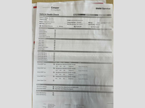 2 KEYS3 MONTH WARRANTY. 12V Power Socket - Centre Console, 12V Power Socket - Passenger Footwell, 12V Power Socket - Rear of Centre Console, 18in Alloy Wheels - Light M Double Spoke Style - 570 M Bi-Colour, 40-20-40 Split Folding Rear Seats, 6.5in Colour Display Screen, ABS - Anti Lock Braking System, Active Carbon Microfilter, Active Guard, Adaptive LED Headlights with High-Beam Assistant, Air Conditioning - Automatic with Two-Zone Control, Airbags - Curtain Head - Front, Airbags - Curtain Head - Rear, Airbags - Driver, Airbags - Front Side, Airbags - Passenger, Airbags - Passenger Deactivation, Alarm System Thatcham 1 with Remote Control, Armrest - Front Centre, Armrest - Rear Centre, Armrests - Grained Expanded Vinyl - Black, Attentiveness Assistant, Automatic Lock when Driving Away Selectable, Auxiliary Input, BMW Apps Interface, BMW ConnectedDrive Online Services, BMW Emergency Call, BMW Navigation, BMW Professional Radio - Single CD and MP3, BMW TeleServices, Battery Safety Cut Off, Belt Force Limiters - Front, Bluetooth - Audio Streaming - with Compatible Devices, Bluetooth Hands Free Facility, Brake Assist, Brake Drying, Brake Pad Wear Indicator - Front and Rear, Brake Readiness, Bumper - Rear Dark Shadow Effect, Bumper System Front and Rear - Replaceable Deformation Elements for Impacts Up to 9mph, Bumpers - Body Colour, Carpet - Anthracite, Central Locking - Remote, Central Locking Switch - Doors - Fuel Filler Cap - Luggage Compartment, Check Control Warning System for Monitoring of Lights and Door-Luggage Compartment Open Warning, Child Proof Locking System - Rear Doors, Child Seat ISOFIX Attachment - Front, Child Seat ISOFIX Attachment - Rear x2, City Collision Mitigation, Coded Belt Buckles Rear, Contrast Stitching - Instrument Panel - Blue - Silver - Grey or Brown to Match Seat Upholstery, Crash Sensor, Cup Holders - Rear x2, Cup Holders x2, DAB - Digital Radio, DSC - Dynamic Stability Control Plus, DTC - Dynamic Traction Control, Daytime Running Lights - LED, Door Handles - Body Colour, Door Mirrors - Body Coloured, Door Mirrors - Drivers Aspheric, Door Mirrors - Electric and Heated, Door Mirrors - Integrated Indicators, Door Mirrors - Passenger Side Convex, Door Panels - Anthracite, Door Sill Finishers - M Designation, Double Tuner with RDS, Drive Performance Control with ECO PRO - Comfort and Sport Modes, Dynamic Brake Lights, ECO PRO Mode, Electric Windows - Front and Rear with Open-Close Fingertip Control, Electro Mechanical Parking Brake, Electronic Differential Lock, Engine Immobiliser, Exhaust Tailpipe - Chrome - Single - Round - Left, Extended Storage, Exterior Trim - High-Gloss Shadowline, First Aid Kit, Floor Mats - Velour, Follow Me Home Headlight Function, Forward Collision Warning System, Front Bumper Underbody Protection in Silver Matt, Front Fog Lights, Gearshift Lever with M Designation, Glove Compartment - Illuminated, Glove Compartment - Lockable, Grab Handles - Everest Grey, Grab Handles - in Roof Lining x4, Head Restraints - Front and Rear, Headlights - Auto On, Headlights - Beam Throw Control, Headlining - Anthracite, Headrests - Anthracite, Heat Protection Glazing with Green Tint, Heated Windscreen Washer Jets, High Level Third Brake Light, Hill Start Assist, Humidity Sensor, Incorrect Fuelling Protection System, Indicator Lenses - Clear, Instrument Panel - Lower Section - Plastic Grained - Black, Instrument Panel - Upper Section - Expanded Vinyl Grained - Black, Interior Lighting - Front and Rear Centre, Interior Trim - A-B-C-D Pillar - Upper Section - Everest Grey, Interior Trim - Aluminium Hexagon with Estoril Blue Finisher, Kidney Grille - Extra Wide High Gloss Black Vertical Slats, LED Ambient Lighting in Door Trim, LED Headlights, LED Rear Light Bars, Lights-on Audio Warning, Locking Wheel Bolts, Luggage Compartment - Light, Luggage Compartment - Remote Unlocking, Luggage Compartment Access via Handle in Number Plate Recess, Luggage Compartment Lining - Carpet - Anthracite, M Aerodynamic Bodystyling, M Logo. Part service history