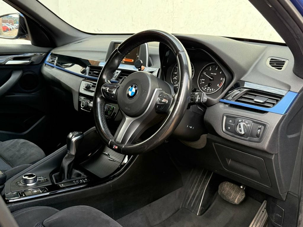 ONLY 2 OWNERS FROM NEW, THIS WELL PRESENTED BMW X1 FINISHED IN ESTORIL BLUE. COMES WITH 2 KEYS, GOOD SERVICE HISTORY AND FEATURES INCLUDING, SATELLITE NAVIGATION, BLUETOOTH HANDS-FREE, DUAL CLIMATE CONTROL WITH AIR CONDITIONING, HEATED FRONT SEATS, REAR PARKING SENSORS, DAB DIGITAL RADIO/CD PLAYER WITH USB POINT, BLUETOOTH MEDIA CONNECTIVITY, ELECTRIC OPERATING BOOT, ELECTRIC FRONT SEATS WITH DRIVERS MEMORY, MULTI FUNCTION LEATHER STEERING WHEEL, CRUISE CONTROL, ECO-PRO/NORMAL/SPORT DRIVING MODES, AUTO LIGHTS, AUTO WIPERS, KEYLESS START/STOP, 4 X ELECTRIC WINDOWS, ELECTRIC MIRRORS, 8 SPEED AUTOMATIC GEARBOX, REMOTE CENTRAL LOCKING AND 18" ALLOY WHEELS. *** EXCAT MILEAGE - 93,600 *** 12V Power Socket in Centre Console Front, 12V Power Socket in Centre Console Rear , 12V Power Socket in Front Centre Console, 18in Alloy Wheels - Light M Double Spoke, 3.5mm Auxiliary Input Point for Auxiliar, 40-20-40 Electrically Split Folding Rear, Active Guard, Adaptive LED Headlights with High-Beam A, Air Conditioning - Automatic with Two-Zo, Airbags, Alarm System - Thatcham 1 with Remote Co, Armrest Front - Free Standing and can be, Automatic Powered Tailgate, BMW ConnectedDrive Online Services, BMW Emergency Call, BMW Navigation, BMW Professional Radio - Single CD and M, BMW TeleServices, Battery Safety Cut Off, Bluetooth Hands Free with USB Audio Inte, Brake Pad Wear Indicator, Bumpe