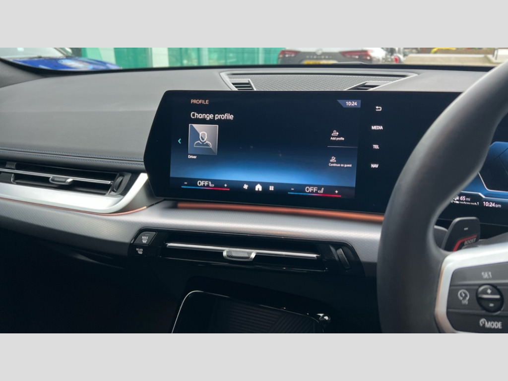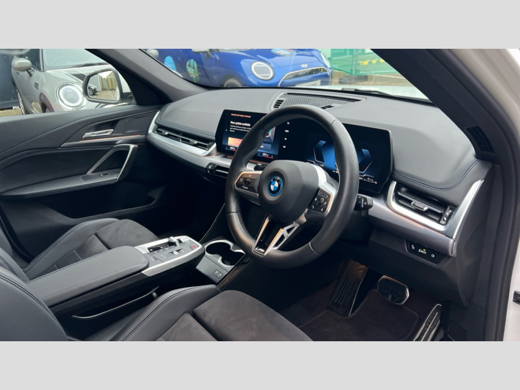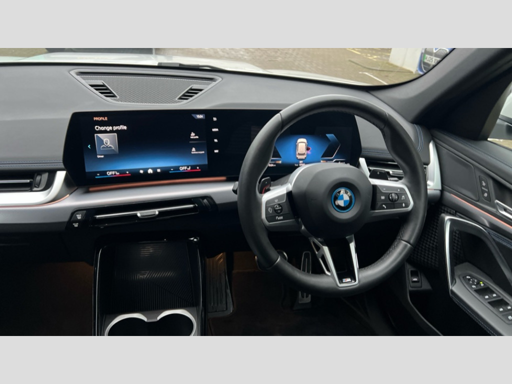 BMW X1 xDrive 30e M Sport 5dr Step Auto Attentiveness assist, Automatic start/stop function, BMW Live Cockpit Plus with 10.25" instrument cluster and 10.7" display, BMW Operating system 9 with BMW Maps, real-time traffic information, in-car experiences, remote services and smartphone integration, BMW Teleservices, Brake pad wear indicator, Condition based service, Connected eDrive Services, Drive off assistant, Electrically opening/closing tailgate with opening/closing with remote control and contactless opening and closing, iDrive controller, Language version English, My Modes, Parking Assistant with Reversing Assistant, active PDC, Lateral Parking Aid, Rear View Camera and Park Distance Control, Personal Profile - automatic lock when driving away selectable, Servotronic PAS, Tyre puncture warning system, Widescreen display, 11 kW AC charging power, eDrive exterior sound, EU6 emissions management, Fast charging cable professional mode 3 for public charging, M Adaptive suspension, Performance Control, Petrol Particulate Filter, Steptronic transmission with double clutch and gear shift paddles, xDrive intelligent four wheel drive system, BMW Personal eSim, DAB Digital radio, Badge on engine compartment lid and tailgate, Body colour door mirrors, Dynamic brake lights, Electric adjustable heated door mirrors, Electric windows - front and rear, with open/close fingertip control, anti-trap facility and comfort closing, Folding door handles integrated flush with surface, Follow me home headlights, Front and rear bumper panel with M specific design, in body colour with inserts in black high gloss, Front door exit lights, Heated rear window, High gloss shadowline, Invisible exhaust tailpipe, Key with M identification, LED 3rd brake light integrated in rear spoiler, LED daytime running lights, LED number plate light, M identification on the sides, M roof rails high gloss shadow line, M specific radiator grille in satinated aluminium, Matt black roof strips, Model inscription on right tailgate, Rain sensor including auto headlights activation, Rear side wing doors, Rear wiper, Sill cover in body colour, Trailer stabilisation logic, Windscreen washer nozzle for rear view camera, Windscreen wipers front with heated washer nozzles, 12V - Power sockets with front centre console and luggage compartment, 2 bag hooks in luggage compartment, 2 cup holders in front, 2 x USB Type C ports for charging in front centre console + 2 x USB Type C ports for charging in rear centre console, 3 rear headrests, 3 seat bench in 2nd row, 3 upper retaining strap clips integrated into rear panels of seat backrests, 4 grab handles, 40:20:40 split folding rear seats, Ambient interior lighting, Anthracite headlining, Anthracite Velour front and rear floormats, Bottle trays in all doors, Child seat ISOFIX attachment for two outer rear seats and front passenger seat with anchorage points, Clothes hook rear, Driver and front passenger heated seats, Dual zone automatic air conditioning, Front and rear door pockets, Front and rear footwell lighting, Front centre console storage compartment, Front/rear adjustable head restraints, Glove compartment, Interior door handle recess light on all doors, Light on right in luggage compartment, M sport leather steering wheel, Manual steering column height and depth adjustment, Middle centre console storage compartment, One piece parcel shelf opens together with tailgate and removable, Rear armrest in door trim panel, Single front passenger seat, Sport leather multifunction steering wheel with thumbrests and operation of instrument display, audio, telephone and driver assistance, Storage compartment net in left side trim panel, Storage compartment with folding cover under centre console armrest cushion, Storage tray in right side trim panel, Tilt adjustment incl. cargo function of 2nd row of seats, Vanity mirror lights, ABS/EBD, Automatic hold function, Automatic Stability Control (ASC), BMW emergency call, Braking readiness, Cornering brake control (CBC), Crash Sensor - activates hazard/interior lighting + unlocks doors, Driver/Front Passenger airbags, Driver/front passenger side airbags, Dry braking, Dynamic brake control, Dynamic stability control + (DSC+), Electromechanical parking brake, Energy recovery system, First aid kit, Front and rear brake discs, Front and rear head airbags, Front passenger airbag deactivation, Integrated brake system, PC iBrake PostCrash approach control warning with light braking function, Rear door child safety locks, Three point seat belts in all seats, Tyre pressure monitor, Warning triangle, Alarm system with tilt sensor, monitoring doors, bonnet interior and tailgate, Closing system with central locking, Locking wheel bolts, Luxury instrument panel, Tyre repair kit plus