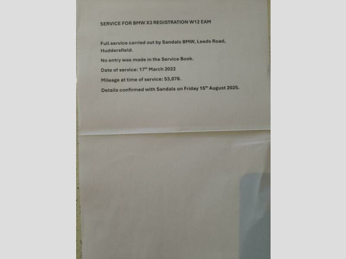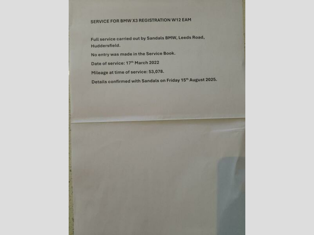 Excellent example of this BMW X3 X Drive 20D M Sport, 1 owner from new with full service history(Pictured) and lovely low miles, Part exchange welcome, HPI Clear, All our vehicle are hand pick and specially selected to qualify for the AA Dealer Promise Program providing you with total peace of mind., We guarantee all our vehicles are 100% HPI Checked and supplied with a full 12 Mth MOT plus a 12 Mth AA RoadSide Assistance and a comprehensive AA parts and labour Warranty Package. Together with our teams no pressure sales approach and with over 40 years combined experience and good old-fashioned customer service you are in very safe hands. Part exchanges are always welcome, and help is always on hand to advise on potential finance options and the many extended vehicle warranties that are available., Zero contact home delivery available please ask for details. Zero Contact Home Delivery or Click and Collect Available on all our vehicles. 12V Power Socket, ABS, Alarm, Automatic Rearview Mirror Dimming, Brake Assist, Cruise Control, Electric Windows, Engine Immobiliser, Front Airbags, Front Fog Lights, Heated Windscreen, Hill-Start Assist, MP3, Parking Assistance, Power Assisted Steering, Rain Sensor, Reading Lights, Sports Seats, Steering Wheel Controls