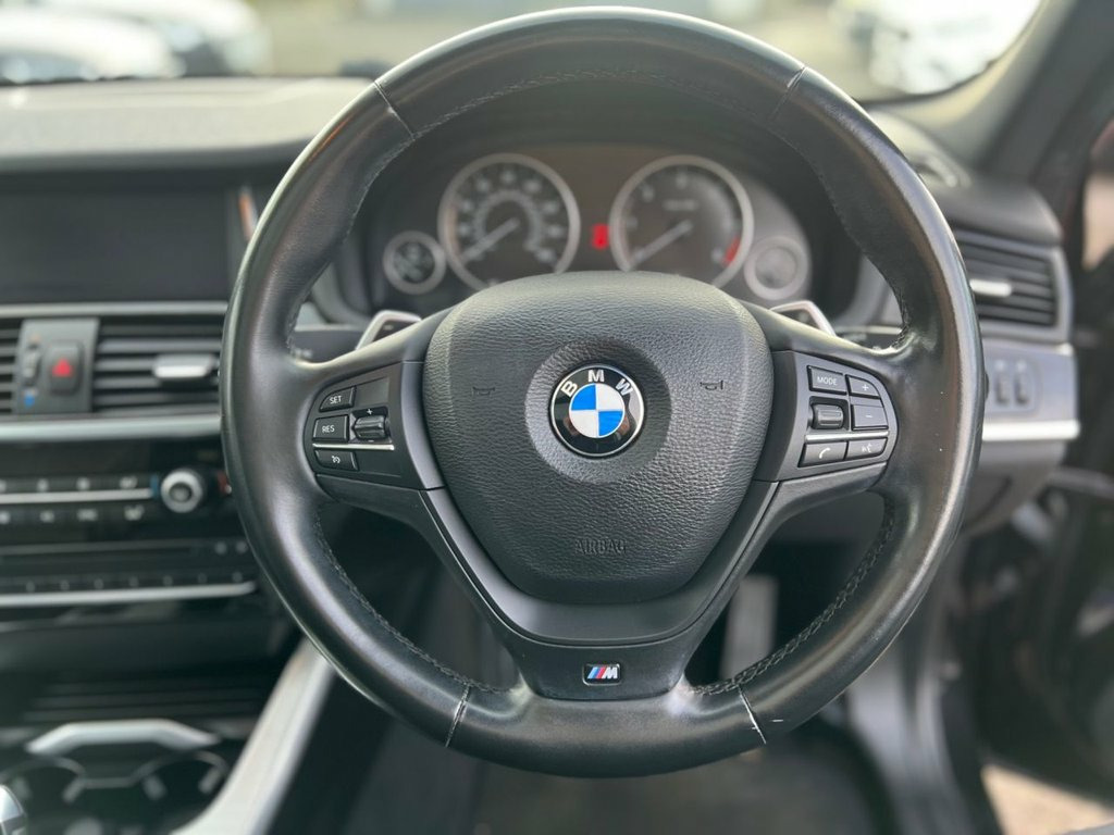 This 2015 BMW X3 20d M Sport presents a compelling proposition with its remarkably low mileage of just 73,600 miles for its age, backed by a clear vehicle history check. This four wheel drive diesel SUV, featuring the desirable M Sport trim, is powered by an efficient 2.0 litre Euro 6 compliant engine. It boasts a substantial towing weight of 2400 kg, making it a practical choice for various needs. Inside, you'll find a wealth of premium features including a panoramic glass sunroof that opens up the cabin, a professional multimedia navigation system, and enhanced Bluetooth telephone preparation with USB audio interface, all part of the comprehensive media package. The striking 20 inch M double spoke alloy wheels complete the sporty aesthetic. Experience impressive performance with this X3, achieving 0 to 60 miles per hour in just 8.1 seconds, a testament to its dynamic capabilities. This model also offers excellent fuel economy, achieving an outstanding 54 miles per gallon, which is a significant advantage over many similar vehicles. Furthermore, the generous boot space ensures ample room for luggage, shopping, or equipment, enhancing its practicality for everyday use and longer journeys. 12V Power Socket - Centre Console, 12V Power Socket - Luggage Compartment, 19in Alloy Wheels - Light M Double-Spoke, ABS - Anti Lock Braking System, ASC - Automatic Stability Control, Additional Detachable Cupholder, Air Conditioning - Automatic with Two-Zo, Air Microfilter, Airbags - Driver, Airbags - Driver and Front Passenger Sid, Airbags - First and Second Seat Row ITS , Airbags - Passenger, Airbags - Passenger Deactivation, Alarm System Thatcham 1 with Remote Cont, Ambient Interior Lighting, Anti Roll Bars - Front and Rear, Armrest - Front with Storage Compartment, Automatically Dimming Rear View Mirror, Auxiliary Input, BMW Emergency Call, BMW Mobility System, BMW Navigation System, BM