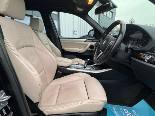DRIVE HOME TODAY IN THIS GREAT VALUE 2016 BMW X3 2.0 20D M-SPORT DIESEL AUTO XDRIVE EURO 6 5DOOR 190 BHP FINISHED IN CARBON BLACK AND TRIMMED WITH HEATED OYSTER NEVEDA LEATHER SEATING. LAST OWNER SINCE 2020 WITH A SERVICE HISTORY INC 6X SERVICES AND JUST SERVICED & MOT'ED ON THE 20/1/26 SO READY TO DRIVE HOME TODAY. A SUPERB COMBINATION OF STYLE AND LUXURY COMBINED WITH ECONOMY AND PRACTICALITY WITH 54+MPG AND ?190 ROAD TAX. ALL THE USUAL BMW REFINEMENTS INC 19"ALLOY WHEELS, SAT-NAV, FRONT & REAR SENSORS, DAB, ENHANCED BLUETOOTH, ELECTRIC TAIL GATE, CLIMATE & CRUISE CONTROL, TOW BAR 12V Power Socket - Front, 19in Alloy Wheels - Light M Double-Spoke, Air Conditioning - Automatic - Dual Zone, Airbags - Driver - Front Passenger - Fro, Alarm System - Thatcham 1 with Remote Co, Ambient Lighting, Anti Roll Bars - Front and Rear, Armrest - Front with Storage Compartment, Armrest - Rear Centre, Automatically Dimming Rear View Mirror, Auxiliary Input Point for Auxiliary Play, BMW ConnectedDrive Online Services, BMW Emergency Call, BMW Mobility System, BMW Navigation System, BMW Professional Radio with Single CD Pl, BMW TeleServices, Bluetooth Hands Free with USB Audio Inte, Brake Force Display, Central Locking - Doors Boot Fuel Cap vi, Child Locking System - Rear Doors, Child Se