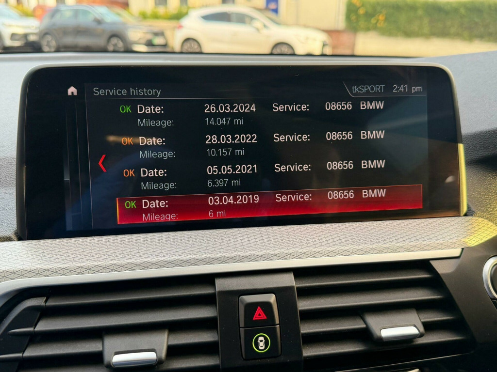 Boasting exceptionally low mileage for its age, this 2019 BMW X3 20i M Sport presents a superb ownership proposition. This Four Wheel Drive model, powered by a 2.0 litre Euro 6 compliant petrol engine, comes with a clear vehicle history check and a full service history, ensuring peace of mind. The M Sport trim level enhances its sporty appeal, and it includes the desirable Comfort Package, Visibility Package with LED headlights, and the M Sport Plus Package. For an immersive audio experience, it features a premium Harman Kardon speaker system.This X3 offers a compelling blend of performance and practicality, achieving 0-62mph in a brisk 8.3 seconds, demonstrating its dynamic capability. The generous boot space provides ample room for luggage or shopping, making it a versatile choice for various needs. The inclusion of Keyless Entry and Comfort Access with Smart Opener adds a layer of convenience to your daily driving. Furthermore, the vehicle will be supplied with a 12 month MOT, underscoring its readiness for the road and its superior condition compared to other similar vehicles on the market.. 12V Power Socket in Front Centre Console, Active Guard, Adaptive LED Headlights with High-Beam Assistant, Air Conditioning - Automatic, Airbags, Alarm System - Thatcham 1 with Remote Control and Engine Immobiliser, Ambient Lighting, Armrest - Front with Storage Compartment, Armrest - Rear Centre with Two Cupholders, Attentiveness Assistant, BMW ConnectedDrive Online Services, BMW Emergency Call, BMW Professional Navigation with 10.25in Touch Display, BMW TeleServices, Battery Safety Cut Off, Bluetooth Hands Free with USB Audio Interface, Bottle Holders Integrated into Door Trim Storage Compartments - Front - up to 1 litre - Rear - Up to 750ml, Brake Pad Wear Indicator - Front and Rear, Bumper System Front and Rear - Replaceable Deformation Elements for Impacts Up to 9mph, Central Locking Switch - Doors - Fuel Filler Cap - Luggage Compartment, Check Control Warning System for Monitoring of Lights and Door-Luggage Compartment Open Warning, Child Locking System - Rear Doors, Child Seat ISOFIX Attachment - Rear, Condition Based Service, Crash Sensor, Cruise Control with Brake and Speed Limiting Function, Cup Holders - Front - Two with Removable Oddments Tray-Lid, DAB Digital Radio, DSC - Dynamic Stability Control Plus, Direction Indicator - Side Repeaters - Integrated in Exterior Mirrors, Door Sill Finishers - Front - High-Gloss Black with BMW Designation, Drive Performance Control with ECO PRO - Comfort and Sport Modes, Dynamic Brake Lights, EPS - Electric Power Steering, Electric Windows - Front and Rear with Open-Close Fingertip Control - Anti-Trap Facility and Comfort Closing Function, Electro Mechanical Parking Brake, Exhaust Tailpipe - Chrome - Dual - Round - Split - Left and Right, Exterior B Pillar - Black, Exterior Mirrors Electrically Adjustable, Exterior Parts in Body Colour, Exterior Trim - High-Gloss Shadowline, First Aid Kit and Warning Triangle, Gear Knob - Leather, Grab Handles - Integrated in Roof Lining x4, Headlining - Anthracite, Heat Protection Glazing with Green Tint, Heated Windscreen Washer Jets, High Level Third Brake Light Using LED Technology, Incorrect Fuelling Protection System, Instrument Cluster, Interior Lighting, Interior Rear-View Mirror with Automatic Anti-Dazzle Function, Interior Trim - Aluminium Rhombicle with Highlight Trim Finishers Pearl Chrome, Kidney Grille - Chrome with Black High-Gloss Vertical Slats, LED Fog Lights - Front, LED Tail Lights, Lights-On Warning by Audio Warning Signal When Ignition is Switched Off, Luggage Compartment - Light, Luggage Compartment Storage, M Aerodynamic Bodystyling, M Sport Package, M Sport Suspension, Model Designation, Navigation System - BMW Professional Multimedia, OBC - On Board Computer, Oil Sensor For Level and Grade - Warning by Check Control System, Optimum Shift Indicator, PDC - Park Distance Control - Front and Rear, Parking Assistant, Performance Control, Personal Profile, Rain Sensor with Automatic Headlight Activation, Real Time Traffic Information, Rear Seat Headrests - Three, Rear Seats - Slope Adjustable, Rear Suspension - Five-Link, Remote Control Including Integrated Key - 2, Remote Services, Reversing Assist Camera, Roof Rails - Shadowline High-Gloss Black, Run Flat Tyres, Seat Belt Security Check for Driver and Front Passenger, Seat Heating for Driver and Front Passenger, Semi Digital Instrument Cluster, Shark Fin, Side Armrests - Front and Rear Integrated into Door Trim, Side Exterior M Designation Badges, Side Impact Protection, Sport Seats - Front, Start-Stop Button with Comfort Go Keyless Engine Start and Auto Start-Stop Deactivation Button, Steering Column with Manual Reach and Rake Adjustment, Steering Wheel - Gearshift Paddles, Steering Wheel - M Sport Leather Multifunction, Storage Compartment - Rear Centre Console and Front-Rear Door Trim, Sun Visors with Vanity Mirrors and Ticket Holder, TPMS - Tyre Pressure Monitoring System, Tailgate Operation - Automatic, Three-Point Seat Belts - All Seats, Through-Loading System, Tool Kit. Full service history