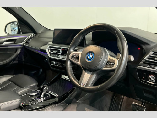 This 2022 BMW X3 30e M Sport is a superb example, having had only one owner from new and boasting a clear vehicle history check. This four wheel drive plug in hybrid SUV features a 2.0 litre petrol engine and meets Euro 6 emissions standards. Inside, you'll find luxurious Vernasca leather upholstery in black with grey stitching, complemented by a Technology Package that includes a Head Up Display. The M Sport Pro Pack further enhances its appeal, alongside striking 20 inch M Double Spoke Style 699 alloy wheels in Jet Black. For effortless manoeuvring, it comes equipped with a Parking Assistant, complete with front and rear sensors and a rear camera.  The performance of this X3 is truly impressive, accelerating from 0 to 60mph in just 6.1 seconds, demonstrating its dynamic capabilities. This swift acceleration, combined with the advanced technology and premium M Sport trim, sets this particular X3 apart from other vehicles in its class. It offers a compelling blend of efficiency from its plug in hybrid system and the engaging driving experience expected from a BMW, all within a practical and stylish SUV body. 12V Power Socket in Front Centre Console, 19in Alloy Wheels - 887M M Y-Spoke - Mid, 20in Alloy Wheels - M Double-Spoke Style, ABS - Anti Lock Braking System, Acoustic Glass, Active Guard, Air Conditioning - Automatic with Three-, Airbags - Driver and Front Passenger Sid, Airbags - Driver and Passenger, Alarm System - Thatcham 1 with Remote Co, Ambient Lighting, Armrest - Front - Fixed with Storage Com, Armrest - Rear Centre with Two Cupholder, Attentiveness Assistant, Automatic Powered Electric Bootlid, Automatic Windscreen Wiper and Headlight, Automatically Dimming Rear View Mirror, Battery Safety Cut Off, BMW Connected Package Professional, BMW ConnectedDrive Online Services, BMW Emergency