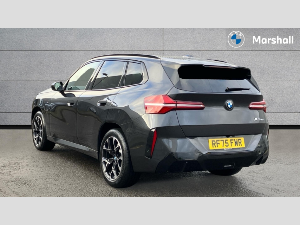 BMW X3 xDrive 30e M Sport 5dr Auto Active guard professional, Attentiveness assist, Automatic operation of tailgate, BMW ConnectedDrive online services, BMW Iconic sounds electric, BMW iDrive, BMW Live cockpit plus, BMW Online services, BMW Teleservices, Brake pad wear indicator, Condition based service, Cruise control with brake function + speed limiter, Drive off assistant, Driving Assistant Plus Preparation, Flat tyre monitor, Language version English, My Mode - Personal, Efficient, Sport, Relax, Expressive, Parking assistant, Reversing assist camera, Servotronic system, Variable sport steering, Dynamic stability control, eDrive exterior sound, Fast charging cable professional mode 3 for public charging, Multiple control arm rear axle, Steptronic transmission with gearshift paddles, Two-joint strut-type front axle with tension strut, DAB tuner, Personal eSim, 4 tailpipe tips, B-pillar trim panel in black high-gloss, BMW badge on front and rear, BMW M-specific front/rear bumpers and side sills, BMW M-specific radiator grille with horizontal bars in Dark Silver and M logo, Daytime running lights, Door handles flush to the surface with lock barrel on driver's side, Dynamic brake lights, Electric adjustable and heated door mirrors, Electric window trap release and convenient opening/closing feature, Headlight beam throw control, Heated rear window, Heated windscreen washer jets, High beam assistant, LED 3rd brake light, LED rear lights, LED tail lights, Locking of the doors, M high-gloss shadowline, M-specific Exterior mirrors, Mirror base and mirror blade in black high-gloss, Mirror triangle in black high-gloss, Rain sensor with automatic headlight activation, Rear side wing doors, Rear wiper, Reversing light, Side window frame in black high-gloss, Windscreen wipers, 12v power socket in front centre console and luggage compartment, 2 x USB Type C ports for charging and data transmission (front centre console) and 2 x USB Type C ports for charging (rear centre console), 3 rear headrests, 3 seat bench in 2nd row, 3 zone automatic air conditioning, 40:20:40 split folding rear seat with loading system, Ambient lighting, Anthracite headlining, Electric adjustable seats with memory function, Floor mats in velour, Footrest and pedals in black plastic, Four grab handles integrated in roof lining, Front armrest with integrated control panel, Front centre console trim in black high-gloss, Front head restraints, Front passenger seat, Front sports seats, Glove compartment, i-Size / ISOFIX attachment points on both outer rear seats, with covers in black, Luggage compartment separating net, M sport leather steering wheel, Multifunction steering wheel, Rear side armrests integrated into door trim, Selector lever with toggle operation, Steering column adjustment, Sun visors with illuminated vanity mirrors, Three upper retaining strap clips integrated into the rear panels of the seat backrests, Through loading system, Two front cupholders and two in the rear center armrest, Wireless charging tray, Connected pro package - X3, Driving assistant + pack - X3, Driving assistant package - X3, Interior and exterior mirror package - X3, 3 point seatbelts, Acoustic protection for pedestrians, Airbag deployment is controlled with respect to the intensity and scope, Anti-lock braking system (ABS), Automatic hold function, BMW emergency call, Brake assist, Brake drying, Brake energy regeneration, Braking readiness, Central airbag, Child locks on rear doors, Cornering brake control (CBC), Crash Sensor - activation of central locking release, hazard warning light and interior lighting, Driver and front passenger front and side airbags, Dynamic brake control, Electromechanical parking brake, Front and rear disc brakes, Head airbags, Integrated braking system, Post Crash Collision Warning with braking function, Trailer stability control, Tyre pressure sensor, Warning triangle, Alarm system, Closing system with central locking, Comfort access system with BMW digital key plus, Locking wheel bolts, Start/stop button with keyless motor start with acoustic drive, Tyre repair kit