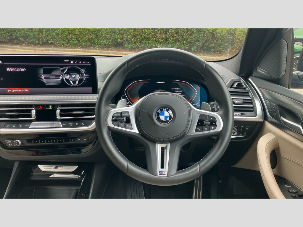 This 2022 BMW X3 M40i boasts a full dealership service history, with its last service completed on 2025-09-17 at 42,011 miles, and comes with a 12-month warranty and 12 months MOT provided on purchase. This impressive example, with only one owner, features a powerful 3.0L Petrol Hybrid engine and Four Wheel Drive, ensuring excellent performance and grip. It is a Euro 6 compliant vehicle. Notable features include the Visibility Pack with Laserlights, a Harman Kardon Surround Audio Sound System for an immersive listening experience, and the Technology Package which includes a Head Up Display for convenient access to information. Comfort is further enhanced with heated front seats and adaptive LED headlights.