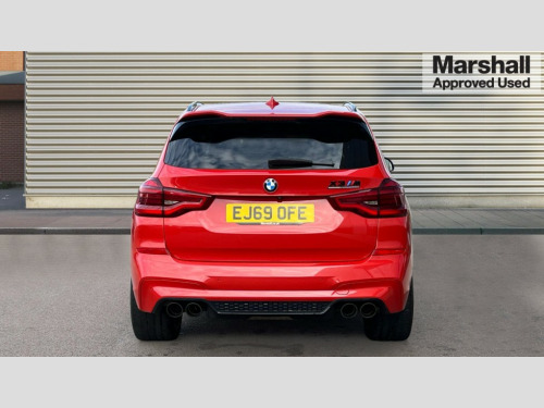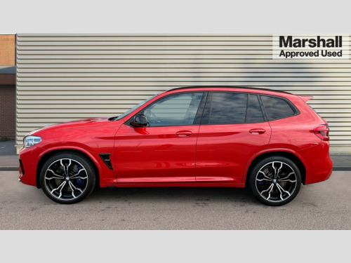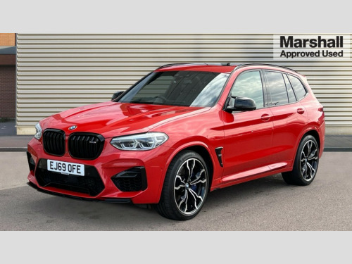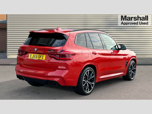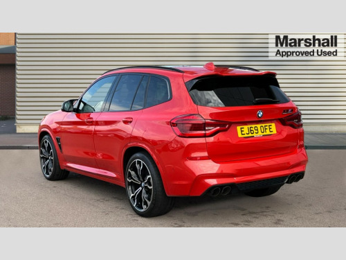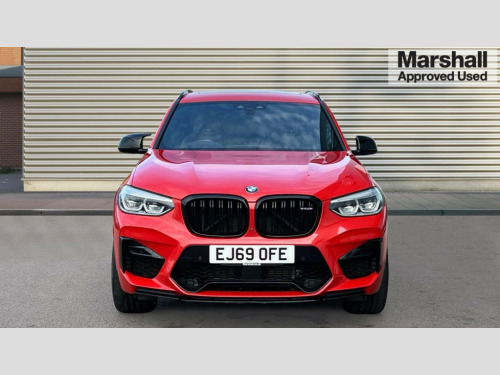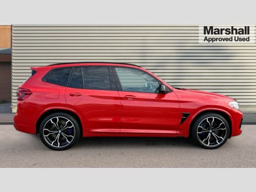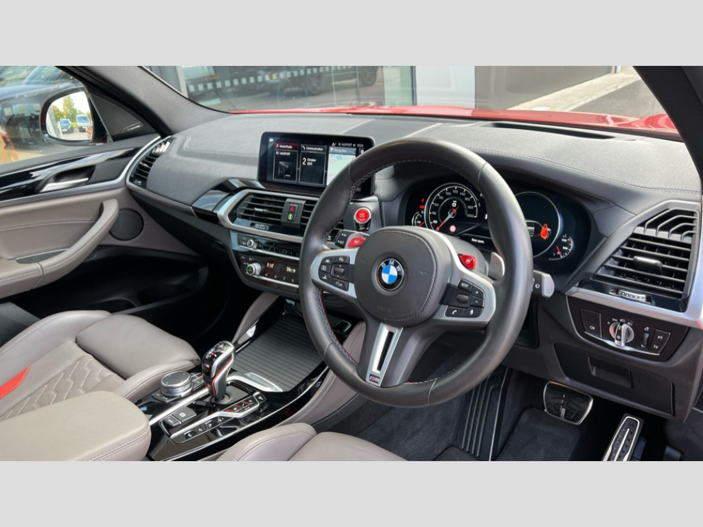 BMW X3 M xDrive X3 M Competition 5dr Step Auto Active Guard incl speed limiting and lane departure functions with auto steering, and front collision warning with brake intervention, Attentiveness assist, Auto start-stop, Automatic tailgate operation, BMW Online services, BMW remote services, BMW Teleservices, Brake pad wear indicator in front and rear, Check Control warning system for monitoring of lights and door/luggage compartment open warning, Condition based service, Control display - 10.25" colour touch sensitive display screen, Digital cockpit with speedometer with mph readout,M Specific appearance with model designation and tachometer,fuel gauge and oil temperature gauge, Electronic Power Steering (EPS), Front/rear park distance control (PDC), Head up Display, iDrive Controller with 8 favourite buttons, Lights on warning by audio warning signal when ignition is switched off, M Gear selector, Navigation system - BMW Professional multimedia with Hard disc drive (HDD) and 10.25" touch display, Oil sensor for level and grade, warning by check control system, On board computer - average speed+fuel consumption, service interval, clock/date, odometer/trip meter, outside temperature display and ice warning, Personal Profile - automatic lock when driving away selectable, Real time traffic information, Adaptive M suspension, Eight speed M Steptronic sport transmission with drivelogic and gearshift paddle switches on steering wheel, Incorrect fuelling protection, M Sport differential, Performance Control, Sport automatic transmission with gearshift paddles, BMW professional radio/CD/MP3, DAB tuner, Harman Kardon loudspeaker system, Acoustic glazing, Automatically dimming electrochromatic rear view mirror, Black finish on B pillars, BMW Icon adaptive LED headlights with low and high beam headlights in Bi-LED, LED daytime running lights in corona ring style and LED Indicators, Body colour door handles, Body colour front and rear bumpers, Direction indicator, side repeaters, integrated in exterior mirrors, Dynamic brake lights, Electric front and rear windows with fingertip open/close + anti-trap facility and comfort closing function, Exterior mirrors - electrically folding with anti-dazzle, Front and rear bumper system with replaceable deformation elements, Green tinted heat protection glazing, Heated windscreen washer jets, High beam assistant, High gloss black exterior air inlets, mirror caps and air breather, High gloss black shadow line roof rails, High gloss shadowline exterior trim in decorative moulding side frame/recess cover/guide rail/B, C pillars/mirror frame and triangle with mirror base, High level 3rd brake light incorporating LED Technology, Interior rear view electrochromatic mirror with automatic anti dazzle function, LED tail lights, Lightweight engineering, M competition bodystyling, M Double slat kidney grilles in High Gloss Black with black slats, M Exhaust tailpipes - Quad, round, split left and right with high gloss black finisher 90mm, M Sport exhaust system, Rain sensor including auto headlights activation, Rear wiper, Shark fin antenna, Visible VIN plate, Welcome lighting, Windscreen wipers with adjustable interval, 12V Accessory socket in centre console, 3 zone automatic air conditioning, Ambient lighting, Anthracite headlining, Driver and front passenger lumbar support, Foldable boot floor with storage compartment, Four grab handles integrated in roof lining, Front and rear bottle holders integrated into door trim storage compartments, Front and rear side armrests integrated into door trim, Front centre armrest with storage compartment, Front cupholders x 2, Front floor mats in velour, Front head restraints, Front M seats, Front M seats with illuminated M logo in headrests, High gloss black front door sill finishers with X3 M competition designation, Interior lighting - front centre over interior mirror with soft light, rear centre and front and rear footwell lighting, Luggage area underfloor compartment, Luggage compartment lighting, M Gear knob, M leather steering wheel, Parcel shelf removeable and storable under boot floor, Reach and rake adjustable steering column, Rear seat centre armrest with two cupholders, Storage compartment in rear centre console, front and rear door trims and under luggage compartment, Sunvisors with vanity mirrors and ticket pocket, Three rear headrests, Through loading system with 40/20/40 split folding rear seat, Toolkit located in luggage compartment, Active protection, ADB - Automatic Differential Brake, Airbags - Front driver/passenger, front and rear curtain head protection, front side, manual deactivation of front passenger airbag, Anti lock braking system (ABS) with brake assist, Automatic Stability Control (ASC), Battery safety cut-off, BMW emergency call, Brake drying, Brake energy regeneration, Braking pre-tensioning, Child proof locking system in rear door, Child seat ISOFIX attachment rear outer seats, Cornering brake control (CBC), Crash Sensor - activation of airbags, Crash Sensor - activation of central locking release, hazard warning light and interior lighting, Deactivation of fuel pump in the event of a crash, DSC - Dynamic Stability Control, DSC+, Dynamic brake control, Dynamic safety, Dynamic Traction Control - DTC, Electromechanical parking brake, Hill descent control, Hill start assist, M Compound perforated brakes, Passive protection for pedestrians, Seatbelt security check for front seats, Side impact protection, Three point seatbelts to all seats with front and outer rear pyrotechnic belt tensioners and seat belt force limiters, Twin horns, Tyre pressure monitoring system, Ventilated front and rear disc brakes, Warning triangle and first aid kit, Alarm system (Thatcham 1) with remote control and electronic engine immobiliser, Central locking switch for all doors, fuel filler cap and luggage compartment, Locking wheel nuts, Remote control including integrated key with M specific design, Remote control including 