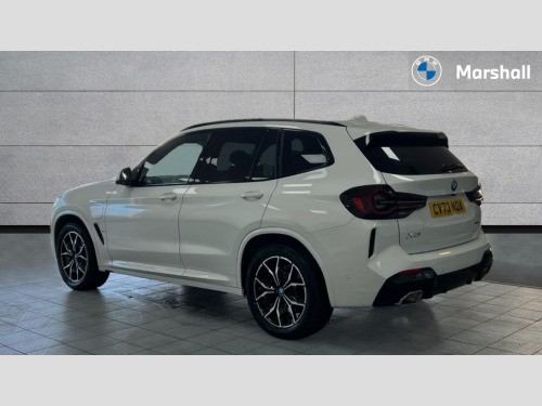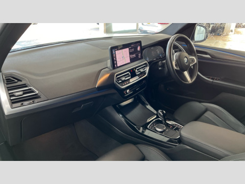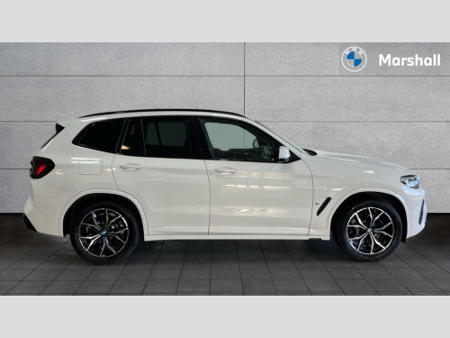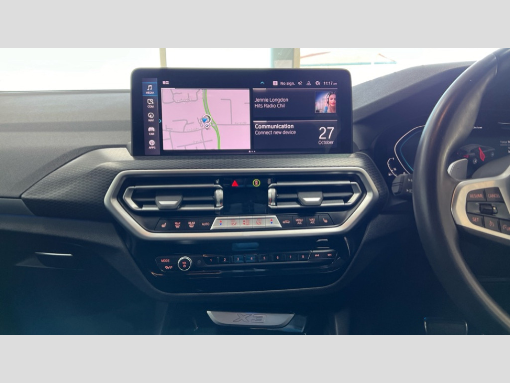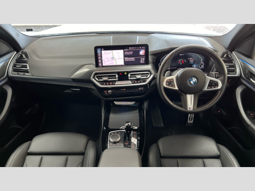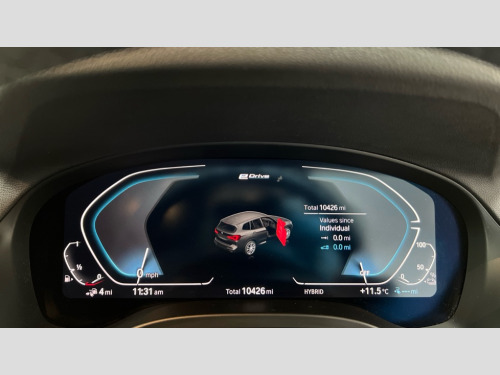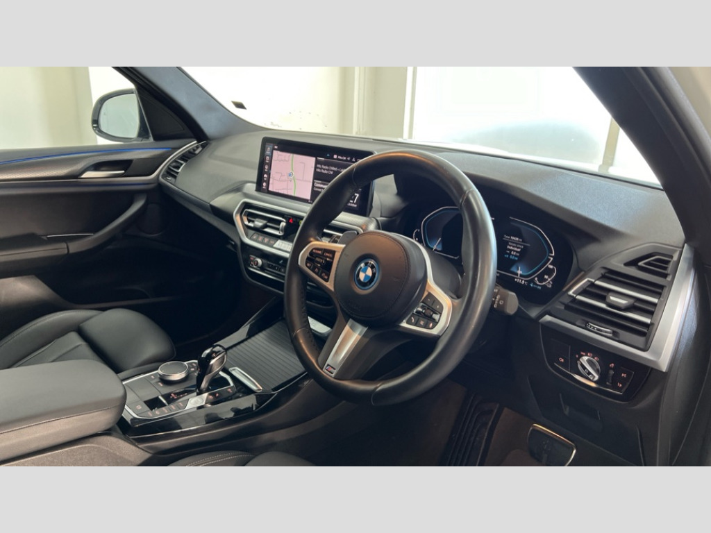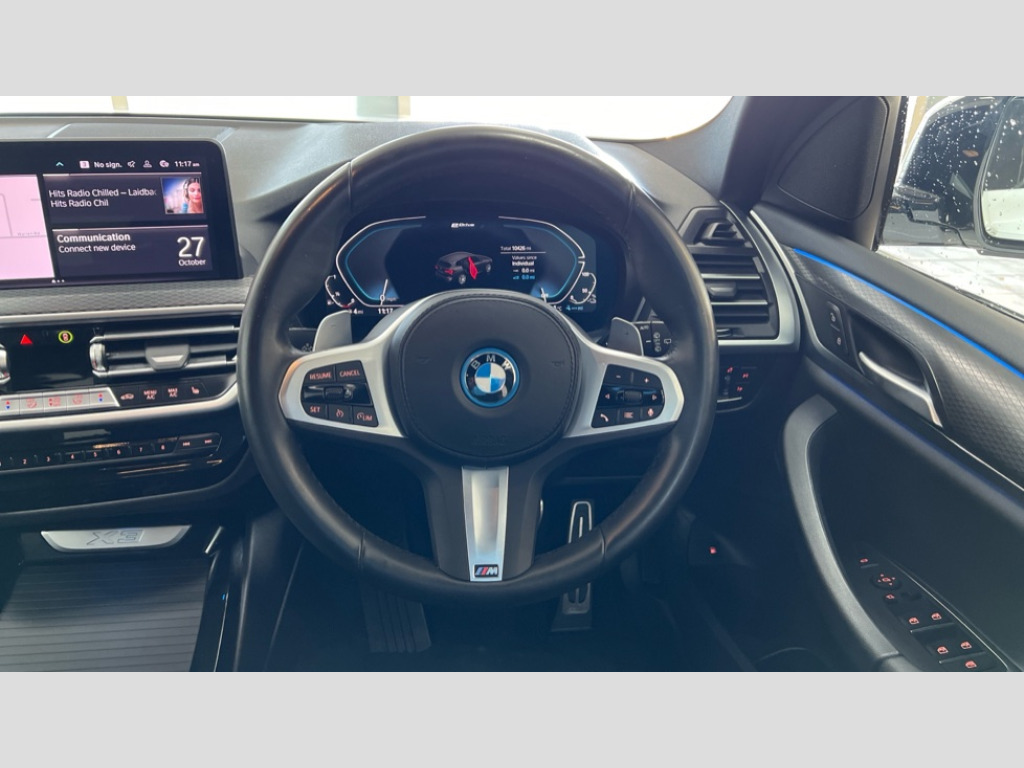 BMW X3 xDrive 30e M Sport 5dr Auto Active Guard, Attentiveness assist, BMW Live Cockpit Professional nav system including 12.3" instrument display + 12.3 high resolution control display, BMW Online services, BMW Teleservices, Brake pad wear indicator in front and rear, Check Control warning system for monitoring of lights and door/luggage compartment open warning, Condition based service - BMW service history, electronic service booklet, integrated owner's handbook, Connected drive services, Electric boot lid, Front/rear Parking distance control, iDrive touch controller with 8 favourite buttons, Instrument cluster with speedometer with mph readout, tachometer, fuel gauge and oil temperature gauge, Lights on warning by audio warning signal when ignition is switched off, Oil sensor for level and grade, warning by check control system, On board computer - average speed+fuel consumption, service interval, clock/date, odometer/trip meter, outside temperature display and ice warning, Optimum shift indicator, Personal Profile - automatic lock when driving away selectable, Run flat indicator, Stop/start system, Variable sports power steering with drive performance control Sport+ mode, eDrive exterior sound, Fast charging cable professional mode 3 for public charging, Incorrect fuelling protection, Multi-link rear suspension, Sport automatic transmission with gearshift paddles, BMW professional radio/CD/MP3, DAB tuner, Acoustic glazing, Automatic windscreen wipers and automatic headlight, Black finish on B pillars, Body colour door handles, Body colour electric adjust heated aspherical door mirrors, Body colour roof mouldings, Body coloured bumpers, Direction indicator, side repeaters, integrated in exterior mirrors, Dynamic brake lights, Exhaust tailpipes - dual, round, split left and right with chrome finisher, Fingertip control / anti-trap function on electric window, Folding wing mirrors with auto dimming, Follow me home headlights, Front and rear bumper system with replaceable deformation elements, Front and rear electric windows, Gloss chrome tailpipes finishers, Green tinted heat insulating glass, Heated windscreen washer jets, High beam assistant, High gloss black shadow line roof rails, High gloss shadowline exterior trim in decorative moulding side frame/recess cover/guide rail/B, C pillars/mirror frame and triangle with mirror base, High level 3rd brake light incorporating LED Technology, Interior rear view electrochromatic mirror with automatic anti dazzle function, LED tail lights, Lightweight engineering, M aerodynamic bodystyling, M Sport entry door sill strips, Model designation, Rain sensor, Rear side wing doors, Rear wing door, Rear wiper, Shark fin antenna, Side exterior M designation badges, Visible VIN plate, Welcome lighting, Windscreen wipers with adjustable interval, 12V power point in luggage area, 12V power socket in front centre console, 2 x USB Type C ports for charging and data transmission (front centre console) and 2 x USB Type C ports for charging (rear centre console), 3 rear headrests, 3 seat bench in 2nd row, 3 zone automatic air conditioning, 4 lashing points to secure luggage, 40:20:40 split folding rear seat with loading system, Ambient lighting, Anthracite headlining, Automatic interior light when door is opened/ignition switched off or via remote key, Floor mats in velour, Foldable storage floor with compartment, Four grab handles integrated in roof lining, Front and rear bottle holders integrated into door trim storage compartments, Front and rear side armrests integrated into door trim, Front centre armrest with storage compartment, Front footwell lights, Front head restraints, Front passenger seat, Front sports seats, Front/rear courtesy lights with soft on/off dimming, Front/rear reading lights, Heated front seats, Isofix rear child seat preparation, Leather gear knob, Lockable glove compartment, Luggage area underfloor compartment, Luggage compartment lighting, M sport leather steering wheel, Multifunction steering wheel, Parcel shelf removeable and storable under boot floor, Reach and rake adjustable steering column, Rear centre armrest with 2 cupholders, Removable / retractable luggage cover, Slope adjustable rear seats, Storage compartment in rear centre console and front/rear door trims, Sun visors with vanity mirrors and ticket pocket, Toolkit located in luggage compartment, Two front cupholders with removable oddments tray/lid, Connected pro pack - X3, ADB - Automatic Differential Brake, Anti-lock braking system (ABS) with brake assist, Automatic Stability Control (ASC), Battery safety cut-off, BMW emergency call, Brake drying, Brake energy regeneration, Braking pre-tensioning, Child locks on rear doors, Cornering brake control (CBC), Crash Sensor - activation of central locking release, hazard warning light and interior lighting, Deactivation of fuel pump in the event of a crash, Driver and front passenger front and side airbags with passenger deactivation and ITS front and rear head airbags, Driver and front passenger knee airbag, DSC+, Dynamic brake control, Dynamic Traction Control - DTC, Electromechanical parking brake, Hill descent control, Hill start assist, Seatbelt security check for front seats, Side impact protection, Three point seatbelts to all seats with front and outer rear pyrotechnic belt tensioners and seat belt force limiters, Two tone horn, Tyre pressure sensor, Ventilated front and rear disc brakes, Warning triangle and first aid kit, Central locking switch for all doors, fuel filler cap and luggage compartment, Electronic engine immobiliser, Locking wheel nuts, Remote control including two integrated key - one button for open/close all lockable content, windows and separate button for open luggage compartment, Remote control Thatcham category 1 alarm, Start/stop button with Comfort Go keyless engine start and auto Start/stop deactivation button, Low rolling resistance tyres