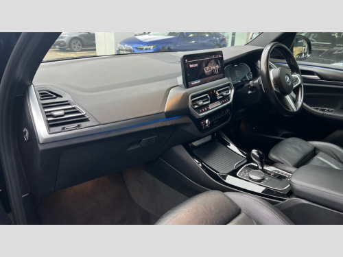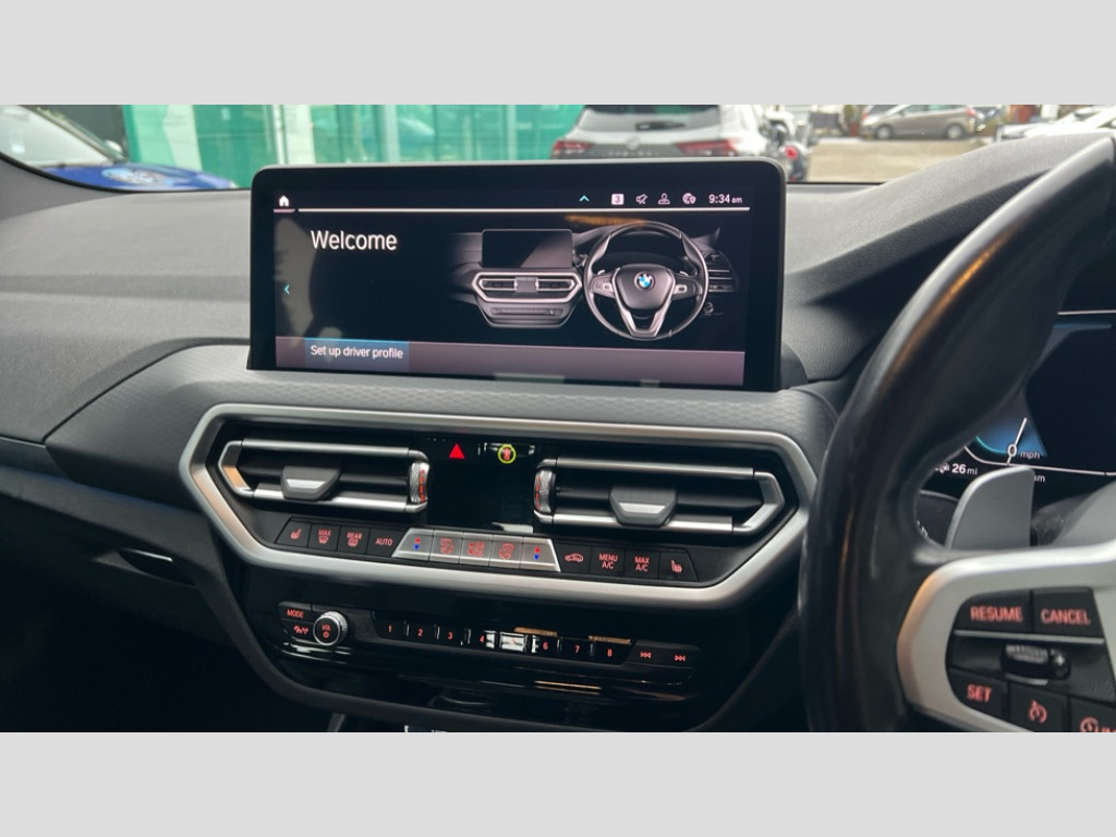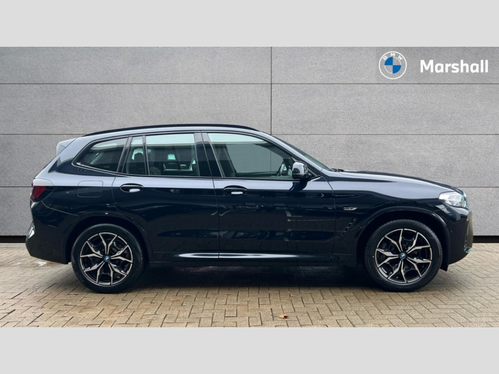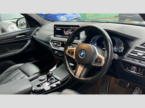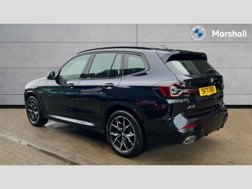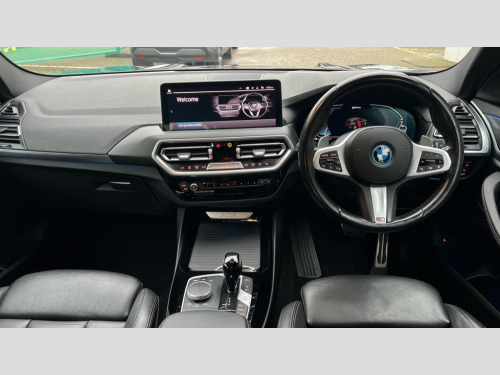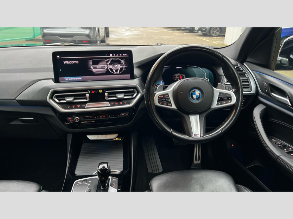 BMW X3 xDrive 30e M Sport 5dr Auto Active Guard, Attentiveness assist, Bluetooth hands free telephone connection with USB audio interface + audio streaming, BMW Live Cockpit Professional nav system including 12.3" instrument display + 12.3 high resolution control display, BMW Online services, BMW Teleservices, Brake pad wear indicator in front and rear, Check Control warning system for monitoring of lights and door/luggage compartment open warning, Condition based service - BMW service history, electronic service booklet, integrated owner's handbook, Connected drive services, Cruise control with brake function + speed limiter, Electric boot lid, Front/rear Parking distance control, iDrive Controller with 8 favourite buttons, Instrument cluster with speedometer with mph readout, tachometer, fuel gauge and oil temperature gauge, Lights on warning by audio warning signal when ignition is switched off, Oil sensor for level and grade, warning by check control system, On board computer - average speed+fuel consumption, service interval, clock/date, odometer/trip meter, outside temperature display and ice warning, Optimum shift indicator, Personal Profile - automatic lock when driving away selectable, Stop/start system, Variable sports power steering, Charging cable - Mode 2, Drive performance control with ECO PRO comfort + sport mode, eDrive exterior sound, Incorrect fuelling protection, Multi-link rear suspension, Performance Control, Sport automatic transmission with gearshift paddles, BMW professional radio/CD/MP3, DAB tuner, HiFi loudspeaker audio system, Acoustic glazing, Automatic windscreen wipers and automatic headlight, Black finish on B pillars, Body colour door handles, Body colour electric adjust heated aspherical door mirrors, Body colour roof mouldings, Body coloured bumpers, Direction indicator, side repeaters, integrated in exterior mirrors, Dynamic brake lights, Exhaust tailpipes - dual, round, split left and right with chrome finisher, Fingertip control / anti-trap function on electric window, Folding wing mirrors with auto dimming, Follow me home headlights, Front and rear bumper system with replaceable deformation elements, Front and rear electric windows, Gloss chrome tailpipes finishers, Green tinted heat insulating glass, Heated windscreen washer jets, High beam assistant, High gloss black shadow line roof rails, High gloss shadowline exterior trim in decorative moulding side frame/recess cover/guide rail/B, C pillars/mirror frame and triangle with mirror base, High level 3rd brake light incorporating LED Technology, Interior rear view electrochromatic mirror with automatic anti dazzle function, LED tail lights, Lightweight engineering, M aerodynamic bodystyling, Model designation, Rear wiper, Shark fin antenna, Side exterior M designation badges, Visible VIN plate, Welcome lighting, Windscreen wipers with adjustable interval, 12V power socket in front centre console, 3 rear headrests, 3 zone automatic air conditioning, 4 lashing points to secure luggage, 40:20:40 split folding rear seat with loading system, Ambient lighting, Anthracite headlining, Automatic interior light when door is opened/ignition switched off or via remote key, Foldable storage floor with compartment, Four grab handles integrated in roof lining, Front and rear bottle holders integrated into door trim storage compartments, Front and rear side armrests integrated into door trim, Front centre armrest with storage compartment, Front footwell lights, Front head restraints, Front sports seats, Front/rear courtesy lights with soft on/off dimming, Front/rear reading lights, Heated front seats, Isofix rear child seat preparation, Leather gear knob, Luggage area underfloor compartment, Luggage compartment lighting, M sport leather steering wheel, Multifunction steering wheel, Parcel shelf removeable and storable under boot floor, Reach and rake adjustable steering column, Rear centre armrest with 2 cupholders, Removable / retractable luggage cover, Seat backrest width adjustment, Slope adjustable rear seats, Storage compartment in rear centre console and front/rear door trims, Sun visors with vanity mirrors and ticket pocket, Toolkit located in luggage compartment, Two front cupholders with removable oddments tray/lid, Vernasca leather upholstery, Connected pro pack - X3, Driving assistant pack - X3, ADB - Automatic Differential Brake, Anti-lock braking system (ABS) with brake assist, Automatic Stability Control (ASC), Battery safety cut-off, BMW emergency call, Brake drying, Brake energy regeneration, Braking pre-tensioning, Child locks on rear doors, Cornering brake control (CBC), Crash Sensor - activation of central locking release, hazard warning light and interior lighting, Deactivation of fuel pump in the event of a crash, Driver and front passenger front and side airbags with passenger deactivation and ITS front and rear head airbags, DSC+, Dynamic brake control, Dynamic Traction Control - DTC, Electromechanical parking brake, Hill descent control, Hill start assist, Seatbelt security check for front seats, Side impact protection, Three point seatbelts to all seats with front and outer rear pyrotechnic belt tensioners and seat belt force limiters, Two tone horn, Tyre pressure sensor, Ventilated front and rear disc brakes, Warning triangle and first aid kit, Central locking switch for all doors, fuel filler cap and luggage compartment, Electronic engine immobiliser, Locking wheel nuts, Remote control including two integrated key - one button for open/close all lockable content, windows and separate button for open luggage compartment, Remote control Thatcham category 1 alarm, Start/stop button with Comfort Go keyless engine start and auto Start/stop deactivation button, Low rolling resistance tyres