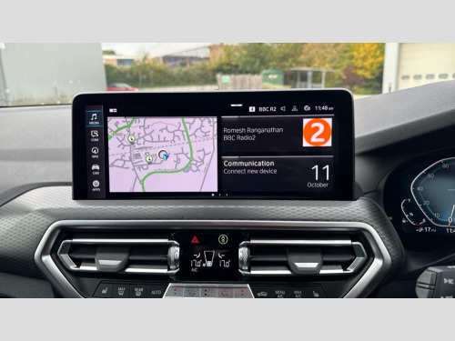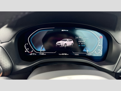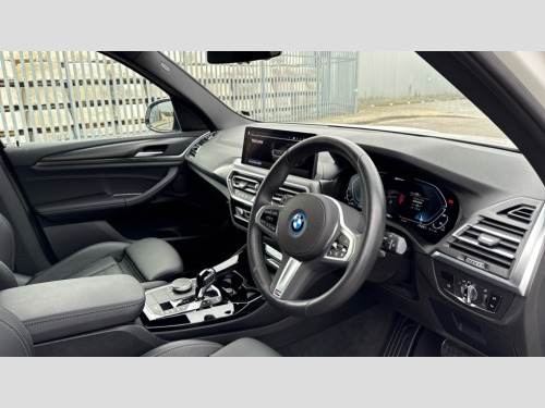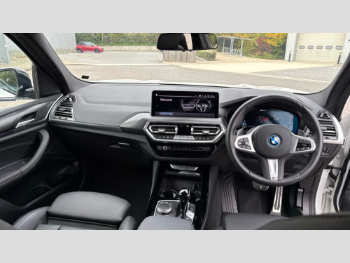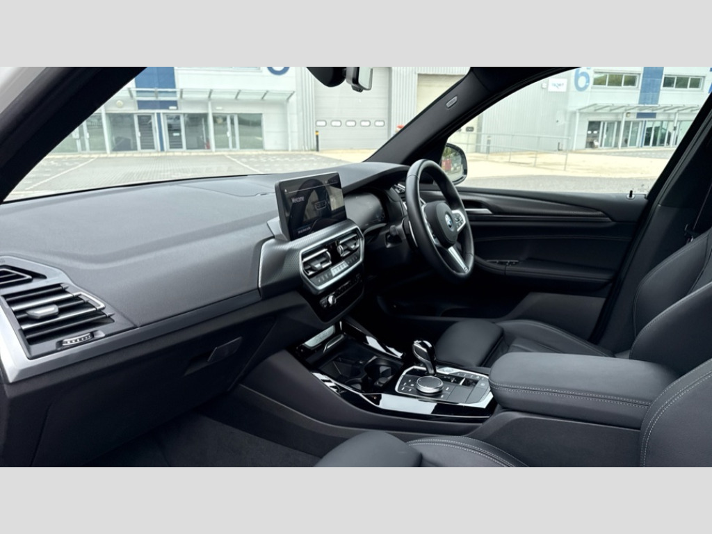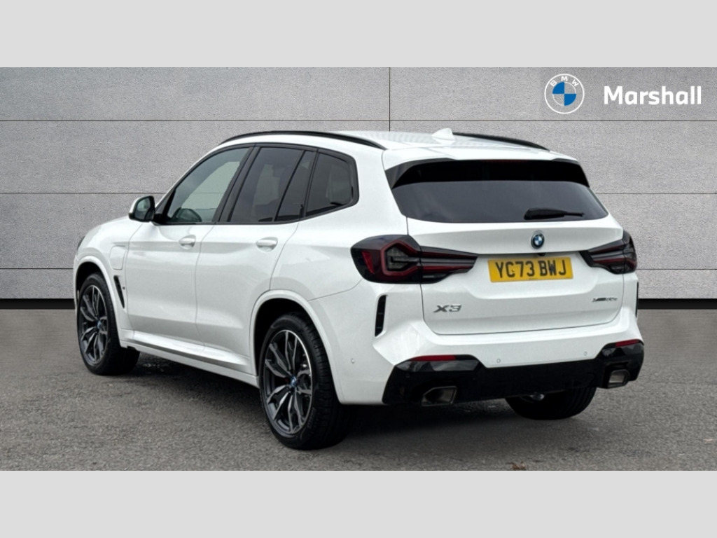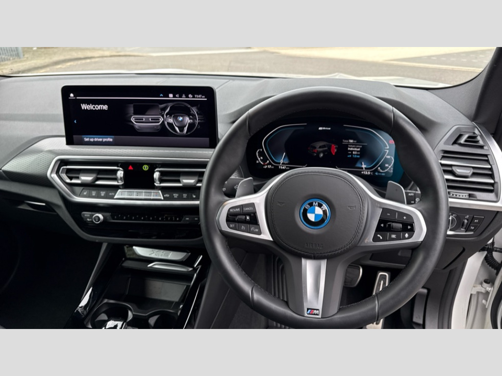 BMW X3 xDrive 30e M Sport 5dr Auto Active Guard, Attentiveness assist, BMW Live Cockpit Professional nav system including 12.3" instrument display + 12.3 high resolution control display, BMW Online services, BMW Teleservices, Brake pad wear indicator in front and rear, Check Control warning system for monitoring of lights and door/luggage compartment open warning, Condition based service - BMW service history, electronic service booklet, integrated owner's handbook, Connected drive services, Electric boot lid, Front/rear Parking distance control, iDrive touch controller with 8 favourite buttons, Instrument cluster with speedometer with mph readout, tachometer, fuel gauge and oil temperature gauge, Lights on warning by audio warning signal when ignition is switched off, Oil sensor for level and grade, warning by check control system, On board computer - average speed+fuel consumption, service interval, clock/date, odometer/trip meter, outside temperature display and ice warning, Optimum shift indicator, Personal Profile - automatic lock when driving away selectable, Run flat indicator, Stop/start system, Variable sports power steering with drive performance control Sport+ mode, Adaptive suspension, eDrive exterior sound, Fast charging cable professional mode 3 for public charging, Flexible charger (Mode 2), Incorrect fuelling protection, Multi-link rear suspension, Sport automatic transmission with gearshift paddles, BMW professional radio/CD/MP3, DAB tuner, Acoustic glazing, Automatic windscreen wipers and automatic headlight, Black finish on B pillars, BMW individual high gloss shadow line with extended content, Body colour door handles, Body colour electric adjust heated aspherical door mirrors, Body colour roof mouldings, Body coloured bumpers, Direction indicator, side repeaters, integrated in exterior mirrors, Dynamic brake lights, Exhaust tailpipes - dual, round, split left and right with chrome finisher, Fingertip control / anti-trap function on electric window, Folding wing mirrors with auto dimming, Follow me home headlights, Front and rear bumper system with replaceable deformation elements, Front and rear electric windows, Gloss chrome tailpipes finishers, Green tinted heat insulating glass, Heated windscreen washer jets, High beam assistant, High gloss black shadow line roof rails, High gloss shadowline exterior trim in decorative moulding side frame/recess cover/guide rail/B, C pillars/mirror frame and triangle with mirror base, High level 3rd brake light incorporating LED Technology, Interior rear view electrochromatic mirror with automatic anti dazzle function, LED tail lights, Lightweight engineering, M aerodynamic bodystyling, M Sport entry door sill strips, Model designation, Rain sensor, Rear side wing doors, Rear wing door, Rear wiper, Shark fin antenna, Side exterior M designation badges, Visible VIN plate, Welcome lighting, Windscreen wipers with adjustable interval, 12V power point in luggage area, 12V power socket in front centre console, 2 x USB Type C ports for charging and data transmission (front centre console) and 2 x USB Type C ports for charging (rear centre console), 3 rear headrests, 3 seat bench in 2nd row, 3 zone automatic air conditioning, 4 lashing points to secure luggage, 40:20:40 split folding rear seat with loading system, Ambient lighting, Anthracite headlining, Automatic interior light when door is opened/ignition switched off or via remote key, Floor mats in velour, Foldable storage floor with compartment, Four grab handles integrated in roof lining, Front and rear bottle holders integrated into door trim storage compartments, Front and rear side armrests integrated into door trim, Front centre armrest with storage compartment, Front footwell lights, Front head restraints, Front passenger seat, Front sports seats, Front/rear courtesy lights with soft on/off dimming, Front/rear reading lights, Heated front seats, Isofix rear child seat preparation, Leather gear knob, Lockable glove compartment, Luggage area underfloor compartment, Luggage compartment lighting, M sport leather steering wheel, Multifunction steering wheel, Parcel shelf removeable and storable under boot floor, Reach and rake adjustable steering column, Rear centre armrest with 2 cupholders, Removable / retractable luggage cover, Slope adjustable rear seats, Storage compartment in rear centre console and front/rear door trims, Sun visors with vanity mirrors and ticket pocket, Toolkit located in luggage compartment, Two front cupholders with removable oddments tray/lid, Connected pro pack - X3, Active protection, ADB - Automatic Differential Brake, Anti-lock braking system (ABS) with brake assist, Automatic Stability Control (ASC), Battery safety cut-off, BMW emergency call, Brake drying, Brake energy regeneration, Braking pre-tensioning, Child locks on rear doors, Cornering brake control (CBC), Crash Sensor - activation of central locking release, hazard warning light and interior lighting, Deactivation of fuel pump in the event of a crash, Driver and front passenger front and side airbags with passenger deactivation and ITS front and rear head airbags, Driver and front passenger knee airbag, DSC+, Dynamic brake control, Dynamic Traction Control - DTC, Electromechanical parking brake, Hill descent control, Hill start assist, M sport seatbelt, Seatbelt security check for front seats, Side impact protection, Three point seatbelts to all seats with front and outer rear pyrotechnic belt tensioners and seat belt force limiters, Two tone horn, Tyre pressure sensor, Ventilated front and rear disc brakes, Warning triangle and first aid kit, Central locking switch for all doors, fuel filler cap and luggage compartment, Electronic engine immobiliser, Locking wheel nuts, Remote control including two integrated key - one button for open/close all lockable content, windows and separate button for open luggage compartment, Remote control Thatcham category 1 alarm, Start/stop button with Comfort