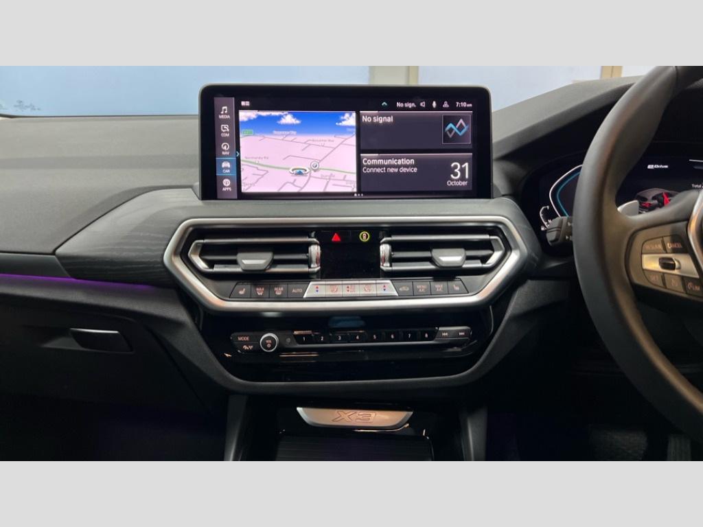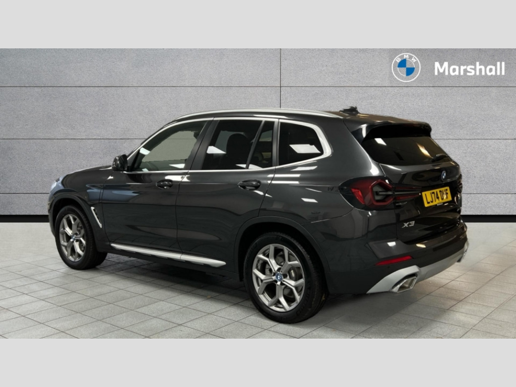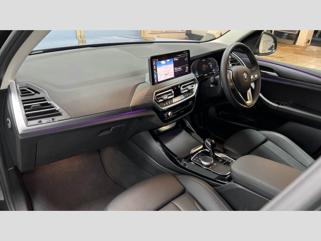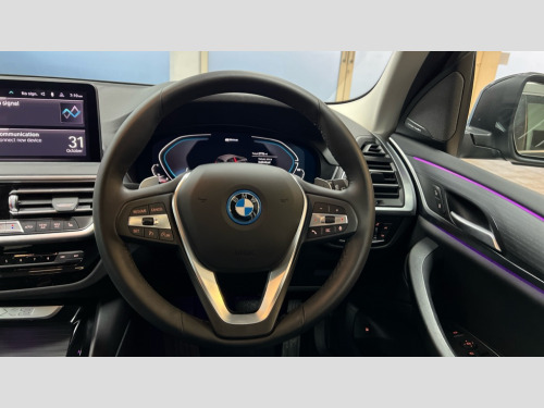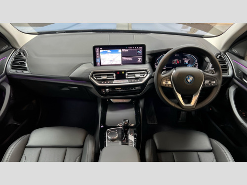 BMW X3 xDrive 30e xLine 5dr Auto Active guard professional, Attentiveness assist, Automatic operation of tailgate, BMW ConnectedDrive online services, BMW Iconic sounds electric, BMW iDrive, BMW Online services, BMW Teleservices, Brake pad wear indicator, Condition based service, Drive off assistant, Flat tyre monitor, Language version English, My Mode - Personal, Efficient, Sport, Relax, Expressive, Servotronic system, Variable sport steering, Dynamic stability control, eDrive exterior sound, Fast charging cable professional mode 3 for public charging, Multiple control arm rear axle, Steptronic transmission with gearshift paddles, Two-joint strut-type front axle with tension strut, DAB tuner, Personal eSim, 4 tailpipe tips, B-pillar trim panel in black high-gloss, BMW badge on front and rear, BMW M-specific front/rear bumpers and side sills, BMW M-specific radiator grille with horizontal bars in Dark Silver and M logo, Daytime running lights, Door handles flush to the surface with lock barrel on driver's side, Dynamic brake lights, Electric adjustable and heated door mirrors, Electric window trap release and convenient opening/closing feature, Headlight beam throw control, Heated rear window, Heated windscreen washer jets, High beam assistant, LED 3rd brake light, LED rear lights, LED tail lights, Locking of the doors, M-specific Exterior mirrors, Mirror base and mirror blade in black high-gloss, Mirror triangle in black high-gloss, Rain sensor with automatic headlight activation, Rear side wing doors, Rear wiper, Reversing light, Side window frame in black high-gloss, Windscreen wipers, 12v power socket in front centre console and luggage compartment, 2 x USB Type C ports for charging and data transmission (front centre console) and 2 x USB Type C ports for charging (rear centre console), 3 rear headrests, 3 seat bench in 2nd row, 3 zone automatic air conditioning, 40:20:40 split folding rear seat with loading system, Ambient lighting, Electric adjustable seats with memory function, Floor mats in velour, Footrest and pedals in black plastic, Four grab handles integrated in roof lining, Front armrest with integrated control panel, Front centre console trim in black high-gloss, Front head restraints, Front passenger seat, Front sports seats, Glove compartment, i-Size / ISOFIX attachment points on both outer rear seats, with covers in black, Luggage compartment separating net, Multifunction steering wheel, Rear side armrests integrated into door trim, Selector lever with toggle operation, Steering column adjustment, Sun visors with illuminated vanity mirrors, Three upper retaining strap clips integrated into the rear panels of the seat backrests, Through loading system, Two front cupholders and two in the rear center armrest, Wireless charging tray, Connected pro package - X3, Driving assistant + pack - X3, Interior and exterior mirror package - X3, 3 point seatbelts, Acoustic protection for pedestrians, Airbag deployment is controlled with respect to the intensity and scope, Anti-lock braking system (ABS), Automatic hold function, BMW emergency call, Brake assist, Brake drying, Brake energy regeneration, Braking readiness, Central airbag, Child locks on rear doors, Cornering brake control (CBC), Crash Sensor - activation of central locking release, hazard warning light and interior lighting, Driver and front passenger front and side airbags, Dynamic brake control, Electromechanical parking brake, Front and rear disc brakes, Head airbags, Integrated braking system, Post Crash Collision Warning with braking function, Trailer stability control, Tyre pressure sensor, Warning triangle, Alarm system, Closing system with central locking, Comfort access system with BMW digital key plus, Locking wheel bolts, Start/stop button with keyless motor start with acoustic drive, Tyre repair kit