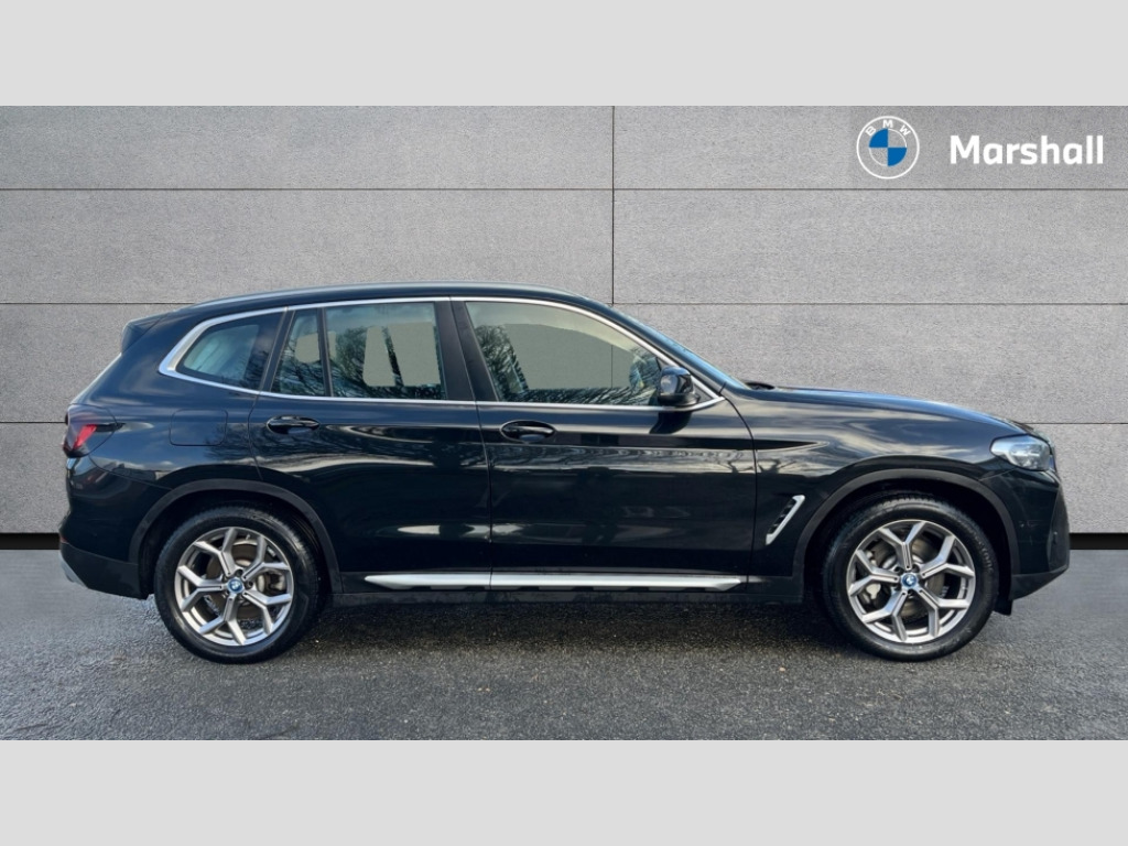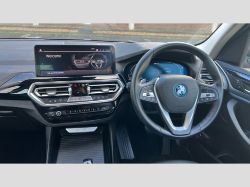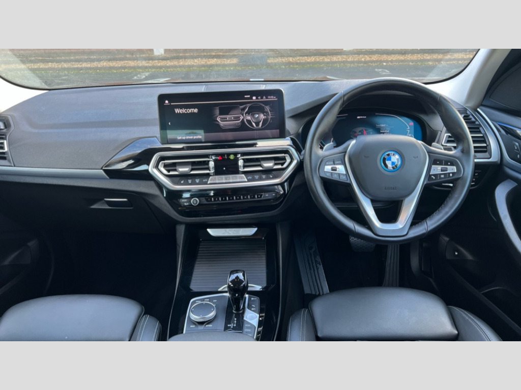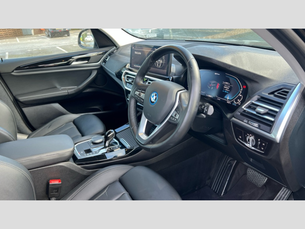 BMW X3 xDrive 30e xLine 5dr Auto Active Guard, Attentiveness assist, BMW Live Cockpit Professional nav system including 12.3" instrument display + 12.3 high resolution control display, BMW Online services, BMW Teleservices, Brake pad wear indicator in front and rear, Check Control warning system for monitoring of lights and door/luggage compartment open warning, Condition based service - BMW service history, electronic service booklet, integrated owner's handbook, Connected drive services, Cruise control with brake function + speed limiter, Electric boot lid, Front/rear Parking distance control, iDrive Controller with 8 favourite buttons, Instrument cluster with speedometer with mph readout, tachometer, fuel gauge and oil temperature gauge, Lights on warning by audio warning signal when ignition is switched off, Oil sensor for level and grade, warning by check control system, On board computer - average speed+fuel consumption, service interval, clock/date, odometer/trip meter, outside temperature display and ice warning, Optimum shift indicator, Personal Profile - automatic lock when driving away selectable, Run flat indicator, Stop/start system, Variable sports power steering with drive performance control Sport+ mode, Charging cable - Mode 2, eDrive exterior sound, Incorrect fuelling protection, Multi-link rear suspension, Performance Control, Sport automatic transmission with gearshift paddles, BMW professional radio/CD/MP3, DAB tuner, Acoustic glazing, Aluminium exterior trim, Automatic windscreen wipers and automatic headlight, Black finish on B pillars, Body colour door handles, Body colour electric adjust heated aspherical door mirrors, Body colour roof mouldings, Body coloured bumpers, Direction indicator, side repeaters, integrated in exterior mirrors, Dynamic brake lights, Exhaust tailpipes - dual, round, split left and right with chrome finisher, Fingertip control / anti-trap function on electric window, Folding wing mirrors with auto dimming, Follow me home headlights, Front and rear bumper system with replaceable deformation elements, Front and rear electric windows, Glacier silver metallic matt in side sills, Gloss chrome tailpipes finishers, Green tinted heat insulating glass, Heated windscreen washer jets, High beam assistant, High level 3rd brake light incorporating LED Technology, Interior rear view electrochromatic mirror with automatic anti dazzle function, LED tail lights, Lightweight engineering, M Sport entry door sill strips, Matt aluminium roof rails, Model designation, Rain sensor, Rear side wing doors, Rear wing door, Rear wiper, Shark fin antenna, Visible VIN plate, Welcome lighting, Windscreen wipers with adjustable interval, xLine exterior styling with underbody protection, 12V power point in luggage area, 12V power socket in front centre console, 3 rear headrests, 3 seat bench in 2nd row, 3 spoke sports leather multi-function steering wheel, 3 zone automatic air conditioning, 4 lashing points to secure luggage, 40:20:40 split folding rear seat with loading system, Ambient lighting, Automatic interior light when door is opened/ignition switched off or via remote key, Deletion lumbar support/width adjustment passenger side, Floor mats in velour, Foldable storage floor with compartment, Four grab handles integrated in roof lining, Front and rear bottle holders integrated into door trim storage compartments, Front and rear side armrests integrated into door trim, Front centre armrest with storage compartment, Front door sill finishers with BMW X-line designation, Front footwell lights, Front head restraints, Front passenger seat, Front sports seats, Front/rear courtesy lights with soft on/off dimming, Front/rear reading lights, Heated front seats, Isofix rear child seat preparation, Leather gear knob, Luggage area underfloor compartment, Luggage compartment lighting, Parcel shelf removeable and storable under boot floor, Reach and rake adjustable steering column, Rear centre armrest with 2 cupholders, Removable / retractable luggage cover, Sensatec perforated upholstery, Slope adjustable rear seats, Storage compartment in rear centre console and front/rear door trims, Sun visors with vanity mirrors and ticket pocket, Toolkit located in luggage compartment, Two front cupholders with removable oddments tray/lid, Connected pro pack - X3, Driving assistant pack - X3, ADB - Automatic Differential Brake, Anti-lock braking system (ABS) with brake assist, Automatic Stability Control (ASC), Battery safety cut-off, BMW emergency call, Brake drying, Brake energy regeneration, Braking pre-tensioning, Child locks on rear doors, Cornering brake control (CBC), Crash Sensor - activation of central locking release, hazard warning light and interior lighting, Deactivation of fuel pump in the event of a crash, Driver and front passenger front and side airbags with passenger deactivation and ITS front and rear head airbags, Driver and front passenger knee airbag, DSC+, Dynamic brake control, Dynamic Traction Control - DTC, Electromechanical parking brake, Hill descent control, Hill start assist, Seatbelt security check for front seats, Side impact protection, Three point seatbelts to all seats with front and outer rear pyrotechnic belt tensioners and seat belt force limiters, Two tone horn, Tyre pressure sensor, Ventilated front and rear disc brakes, Warning triangle and first aid kit, Central locking switch for all doors, fuel filler cap and luggage compartment, Electronic engine immobiliser, Locking wheel nuts, Remote control including two integrated key - one button for open/close all lockable content, windows and separate button for open luggage compartment, Remote control Thatcham category 1 alarm, Start/stop button with Comfort Go keyless engine start and auto Start/stop deactivation button, Low rolling resistance tyres, Tyre repair kit