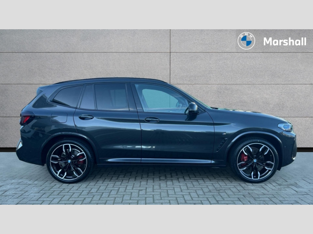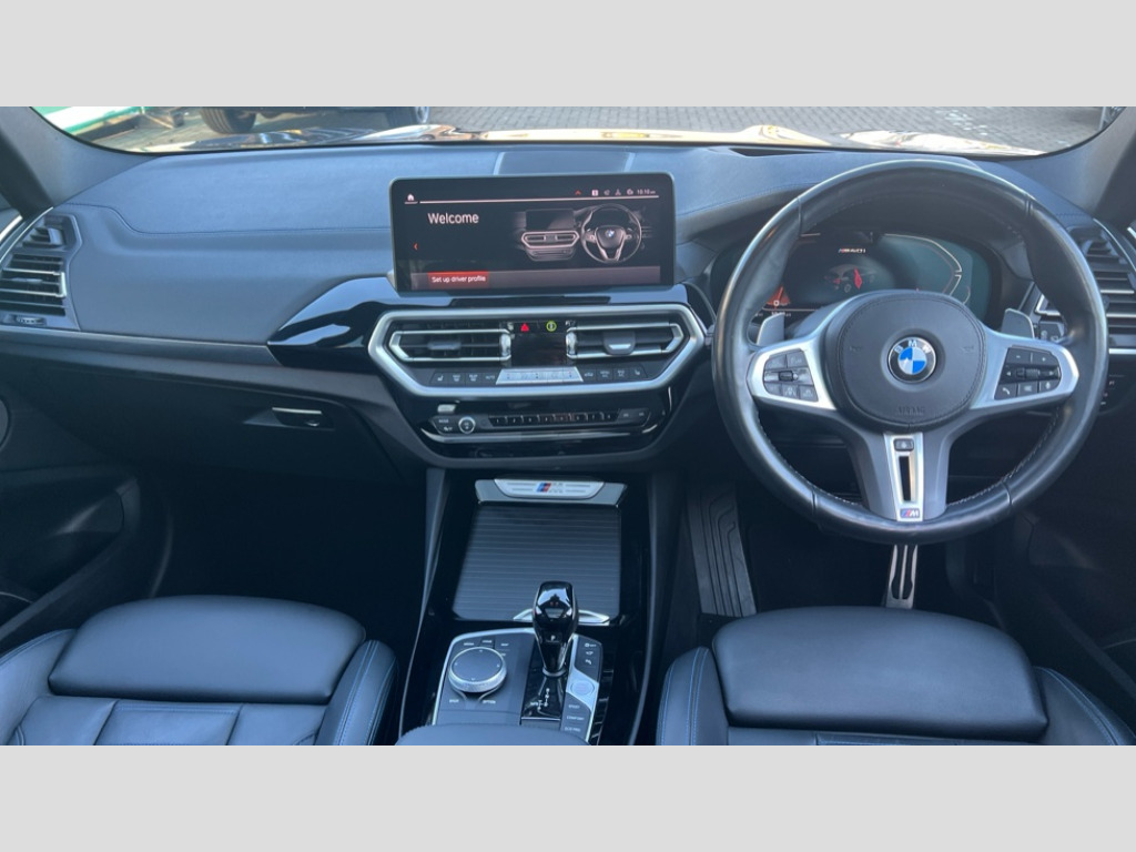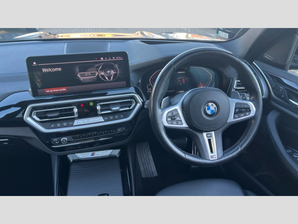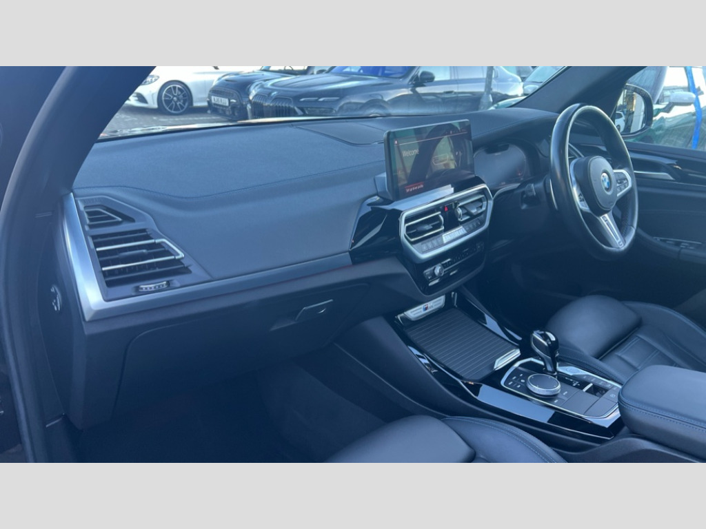 BMW X3 xDrive M40i MHT 5dr Auto Active Guard, Attentiveness assist, BMW Live Cockpit Professional nav system including 12.3" instrument display + 12.3 high resolution control display, BMW Online services, BMW Teleservices, Brake pad wear indicator in front and rear, Check Control warning system for monitoring of lights and door/luggage compartment open warning, Condition based service - BMW service history, electronic service booklet, integrated owner's handbook, Connected drive services, Deletion of driving assistant professional, Electric boot lid, Front/rear Parking distance control, iDrive Controller with 8 favourite buttons, Instrument cluster with speedometer with mph readout, tachometer, fuel gauge and oil temperature gauge, Lights on warning by audio warning signal when ignition is switched off, Oil sensor for level and grade, warning by check control system, On board computer - average speed+fuel consumption, service interval, clock/date, odometer/trip meter, outside temperature display and ice warning, Optimum shift indicator, Personal Profile - automatic lock when driving away selectable, Run flat indicator, Stop/start system, Variable sports power steering with drive performance control Sport+ mode, Incorrect fuelling protection, M Adaptive suspension, M Sport differential, Multi-link rear suspension, Performance Control, Sport automatic transmission with gearshift paddles, BMW professional radio/CD/MP3, DAB tuner, Acoustic glazing, Automatic windscreen wipers and automatic headlight, Black finish on B pillars, BMW individual high gloss shadow line with extended content, Body colour door handles, Body colour roof mouldings, Body coloured bumpers, Direction indicator, side repeaters, integrated in exterior mirrors, Dynamic brake lights, Electric adjust heated aspherical door mirrors, Exhaust tailpipes - dual, round, split left and right with chrome finisher, Fingertip control / anti-trap function on electric window, Folding wing mirrors with auto dimming, Follow me home headlights, Front and rear bumper system with replaceable deformation elements, Front and rear electric windows, Green tinted heat insulating glass, Heated windscreen washer jets, High beam assistant, High gloss black shadow line roof rails, High gloss shadowline exterior trim in decorative moulding side frame/recess cover/guide rail/B, C pillars/mirror frame and triangle with mirror base, High level 3rd brake light incorporating LED Technology, Interior rear view electrochromatic mirror with automatic anti dazzle function, Kidney frame and struts painted in high gloss black, LED tail lights, Lightweight engineering, M aerodynamic bodystyling, M black mirror caps, M Sport entry door sill strips, Model designation, Rain sensor, Rear side wing doors, Rear wing door, Rear wiper, Shark fin antenna, Side exterior M designation badges, Sun protection glass, Visible VIN plate, Welcome lighting, Windscreen wipers with adjustable interval, 12V power point in luggage area, 12V power socket in front centre console, 3 rear headrests, 3 seat bench in 2nd row, 3 zone automatic air conditioning, 4 lashing points to secure luggage, 40:20:40 split folding rear seat with loading system, Ambient lighting, Anthracite headlining, Automatic interior light when door is opened/ignition switched off or via remote key, Electric adjustable seats with memory function, Floor mats in velour, Foldable storage floor with compartment, Four grab handles integrated in roof lining, Front and rear bottle holders integrated into door trim storage compartments, Front and rear side armrests integrated into door trim, Front centre armrest with storage compartment, Front footwell lights, Front head restraints, Front passenger seat, Front/rear courtesy lights with soft on/off dimming, Front/rear reading lights, Heated front seats, Isofix rear child seat preparation, Leather gear knob, Luggage area underfloor compartment, Luggage compartment lighting, M sport leather steering wheel, Multifunction steering wheel, Parcel shelf removeable and storable under boot floor, Reach and rake adjustable steering column, Rear centre armrest with 2 cupholders, Removable / retractable luggage cover, Slope adjustable rear seats, Storage compartment in rear centre console and front/rear door trims, Sun visors with vanity mirrors and ticket pocket, Toolkit located in luggage compartment, Two front cupholders with removable oddments tray/lid, Vernasca leather upholstery, Connected pro pack - X3, Active protection, ADB - Automatic Differential Brake, Anti-lock braking system (ABS) with brake assist, Automatic Stability Control (ASC), Battery safety cut-off, BMW emergency call, Brake drying, Brake energy regeneration, Braking pre-tensioning, Child locks on rear doors, Cornering brake control (CBC), Crash Sensor - activation of central locking release, hazard warning light and interior lighting, Deactivation of fuel pump in the event of a crash, Driver and front passenger front and side airbags with passenger deactivation and ITS front and rear head airbags, Driver and front passenger knee airbag, DSC+, Dynamic brake control, Dynamic Traction Control - DTC, Electromechanical parking brake, Hill descent control, Hill start assist, M sport seatbelt, Seatbelt security check for front seats, Side impact protection, Three point seatbelts to all seats with front and outer rear pyrotechnic belt tensioners and seat belt force limiters, Two tone horn, Tyre pressure sensor, Ventilated front and rear disc brakes, Warning triangle and first aid kit, Central locking switch for all doors, fuel filler cap and luggage compartment, Electronic engine immobiliser, Locking wheel nuts, Remote control including two integrated key - one button for open/close all lockable content, windows and separate button for open luggage compartment, Remote control Thatcham category 1 alarm, Start/stop button with Comfort Go keyless engine start and auto Start/stop deactivation button, Sensatec dashboard, Low ro