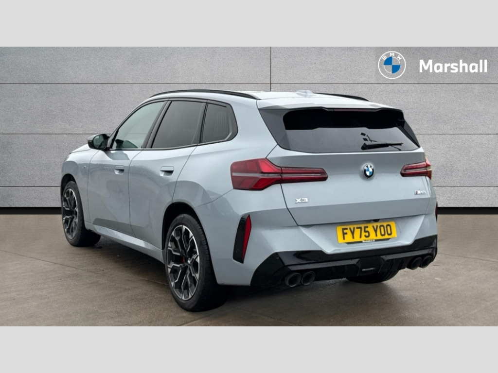 BMW X3 xDrive M50 5dr Auto Active guard professional, Attentiveness assist, Automatic operation of tailgate, BMW ConnectedDrive online services, BMW iDrive, BMW Online services, BMW Teleservices, Brake pad wear indicator, Condition based service, Drive off assistant, Flat tyre monitor, Language version English, My Mode - Personal, Efficient, Sport, Relax, Expressive, Servotronic system, Variable sport steering, Dynamic stability control, Multiple control arm rear axle, Steptronic transmission with gearshift paddles, Two-joint strut-type front axle with tension strut, DAB tuner, Personal eSim, 4 tailpipe tips, Adaptive LED Headlights, B-pillar trim panel in black high-gloss, BMW badge on front and rear, BMW M-specific front/rear bumpers and side sills, BMW M-specific radiator grille with horizontal bars in Dark Silver and M logo, Body colour mirror caps, Daytime running lights, Door handles flush to the surface with lock barrel on driver's side, Dynamic brake lights, Electric adjustable and heated door mirrors, Electric window trap release and convenient opening/closing feature, Headlight beam throw control, Heated rear window, Heated windscreen washer jets, High beam assistant, LED 3rd brake light, LED rear lights, LED tail lights, LED turning indicators, Locking of the doors, M-specific Exterior mirrors, Mirror base and mirror blade in satinised aluminium, Mirror triangle in black high-gloss, Rain sensor with automatic headlight activation, Rear side wing doors, Rear wiper, Reversing light, Side window frame in black high-gloss, Sun protection glass, Windscreen wipers, 12v power socket in front centre console and luggage compartment, 2 x USB Type C ports for charging and data transmission (front centre console) and 2 x USB Type C ports for charging (rear centre console), 3 rear headrests, 3 seat bench in 2nd row, 3 zone automatic air conditioning, 40:20:40 split folding rear seat with loading system, Ambient lighting, Anthracite headlining, Electric adjustable seats with memory function, Floor mats in velour, Footrest and pedals in black plastic, Four grab handles integrated in roof lining, Front armrest with integrated control panel, Front centre console trim in black high-gloss, Front head restraints, Front passenger seat, Front sports seats, Glove compartment, i-Size / ISOFIX attachment points on both outer rear seats, with covers in black, Interior door handles in dark chrome, Luggage compartment separating net, M sport leather steering wheel, Multifunction steering wheel, Rear side armrests integrated into door trim, Selector lever with toggle operation, Steering column adjustment, Sun visors with illuminated vanity mirrors, Three upper retaining strap clips integrated into the rear panels of the seat backrests, Through loading system, Two front cupholders and two in the rear center armrest, Wireless charging tray, BMW Iconic Glow exterior package - X3, Connected pro package - X3, Interior and exterior mirror package - X3, M Sport pro pack - X3, 3 point seatbelts, Airbag deployment is controlled with respect to the intensity and scope, Anti-lock braking system (ABS), Automatic hold function, BMW emergency call, Brake assist, Brake drying, Brake energy regeneration, Braking readiness, Central airbag, Child locks on rear doors, Cornering brake control (CBC), Crash Sensor - activation of central locking release, hazard warning light and interior lighting, Driver and front passenger front and side airbags, Dynamic brake control, Electromechanical parking brake, Front and rear disc brakes, Head airbags, Integrated braking system, M sport seatbelt, Post Crash Collision Warning with braking function, Trailer stability control, Tyre pressure sensor, Warning triangle, Alarm system, Closing system with central locking, Comfort access system with BMW digital key plus, Locking wheel bolts, Start/stop button with keyless motor start with acoustic drive, Tyre repair kit plus