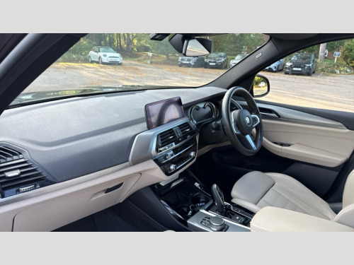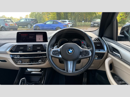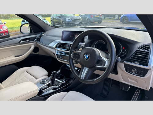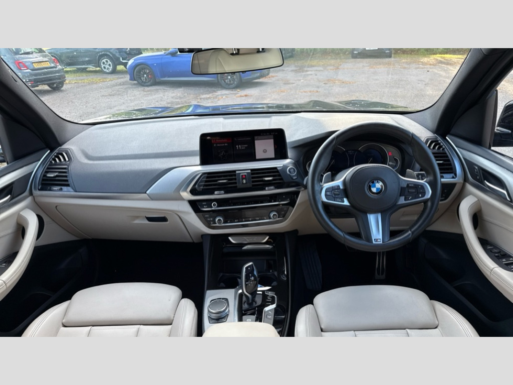 BMW X3 xDrive20d M Sport 5dr Step Auto Active Guard incl speed limiting and lane departure functions with auto steering, and front collision warning with brake intervention, Attentiveness assist, Automatic tailgate operation, BMW Online services, BMW remote services, BMW Teleservices, Brake pad wear indicator in front and rear, Check Control warning system for monitoring of lights and door/luggage compartment open warning, Control display - 6.5" colour display screen, Front/rear Parking distance control, iDrive Controller with 8 favourite buttons, Instrument cluster with speedometer with mph readout, tachometer, fuel gauge and oil temperature gauge, Lights on warning by audio warning signal when ignition is switched off, Navigation system - BMW Professional multimedia with Hard disc drive (HDD) and 10.25" touch display, Oil sensor for level and grade, warning by check control system, On board computer - average speed+fuel consumption, service interval, clock/date, odometer/trip meter, outside temperature display and ice warning, Optimum shift indicator, Personal Profile - automatic lock when driving away selectable, Real time traffic information, Stop/start system, Automatic transmission with gearshift paddles, Diesel particulate filter, Incorrect fuelling protection, Larger capacity fuel tank, Multi-link rear suspension, Performance Control, Auxiliary socket for external MP3 player, BMW professional radio/CD/MP3, DAB Digital radio, Black finish on B pillars, Body colour door handles, Body colour electric adjust heated aspherical door mirrors, Body colour roof mouldings, Body coloured bumpers, Chrome kidney grille with high gloss black vertical slats, Direction indicator, side repeaters, integrated in exterior mirrors, Dual chrome exhaust, Dynamic brake lights, Fingertip control / anti-trap function on electric window, Follow me home headlights, Front and rear bumper system with replaceable deformation elements, Front and rear electric windows, Green tinted heat insulating glass, Heated windscreen washer jets, Height adjustable headlamps, High gloss black door sill finishers, High level 3rd brake light incorporating LED Technology, Interior rear view electrochromatic mirror with automatic anti dazzle function, LED front fog lights, LED tail lights, Lightweight engineering, M aerodynamic bodystyling, Rain sensor including auto headlights activation, Rear wiper, Shark fin antenna, Visible VIN plate, Welcome lighting, Windscreen wipers with adjustable interval, 12V socket in centre console and luggage area, 3 rear headrests, 3 zone automatic air conditioning, 4 lashing points to secure luggage, Ambient lighting, Anthracite headlining, Anthracite Velour floor mats, Driver/passenger sunvisors with ticket holders + illuminated vanity mirrors, Foldable boot floor with storage compartment, Four grab handles integrated in roof lining, Front and rear bottle holders integrated into door trim storage compartments, Front and rear side armrests integrated into door trim, Front centre armrest with storage compartment, Front footwell lights, Front/rear courtesy lights with soft on/off dimming, Front/rear reading lights, Height adjustable front/rear head restraints, Isofix rear child seat preparation, Leather gear knob, Luggage area underfloor compartment, Luggage compartment lighting, M Sport multifunction leather steering wheel, Parcel shelf removeable and storable under boot floor, Rake/reach adjustable steering wheel, Rear seat centre armrest with two cupholders, Removable / retractable luggage cover, Slope adjustable rear seats, Storage compartment in rear centre console, Through loading system with 40/20/40 split folding rear seat, Toolkit located in luggage compartment, Two front cupholders with removable oddments tray/lid, Vernasca leather upholstery, ABS/EBD, ADB - Automatic Differential Brake, Automatic Stability Control (ASC), Battery safety cut-off, BMW emergency call, Brake assist function, Brake drying, Brake energy regeneration, Braking pre-tensioning, Child locks on rear doors, Cornering brake control (CBC), Crash Sensor - activation of central locking release, hazard warning light and interior lighting, Deactivation of fuel pump in the event of a crash, Driver and front passenger front and side airbags with passenger deactivation and ITS front and rear head airbags, DSC+, Dynamic brake control, Dynamic Traction Control - DTC, Electromechanical parking brake, Front seat belts warning, Hill descent control, Hill start assist, Seatbelt security check for front seats, Side impact protection, Three point seatbelts to all seats with front and outer rear pyrotechnic belt tensioners and seat belt force limiters, Two tone horn, Tyre pressure monitoring system, Ventilated front and rear disc brakes, Warning triangle and first aid kit, Central locking switch for all doors, fuel filler cap and luggage compartment, Electronic engine immobiliser, Locking wheel nuts, Remote control including two integrated key - one button for open/close all lockable content, windows and separate button for open luggage compartment, Remote control Thatcham category 1 alarm, Start/stop button with Comfort Go keyless engine start and auto Start/stop deactivation button, Low rolling resistance tyres