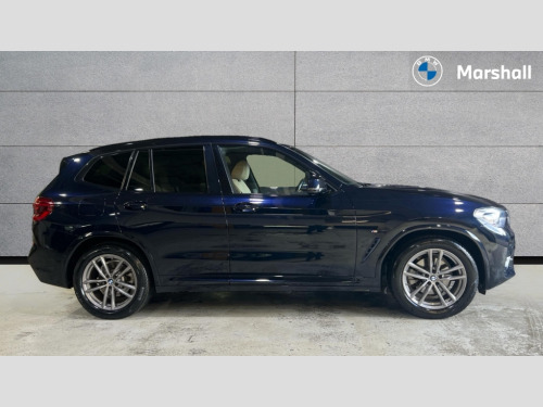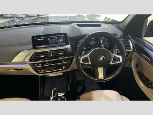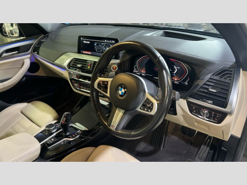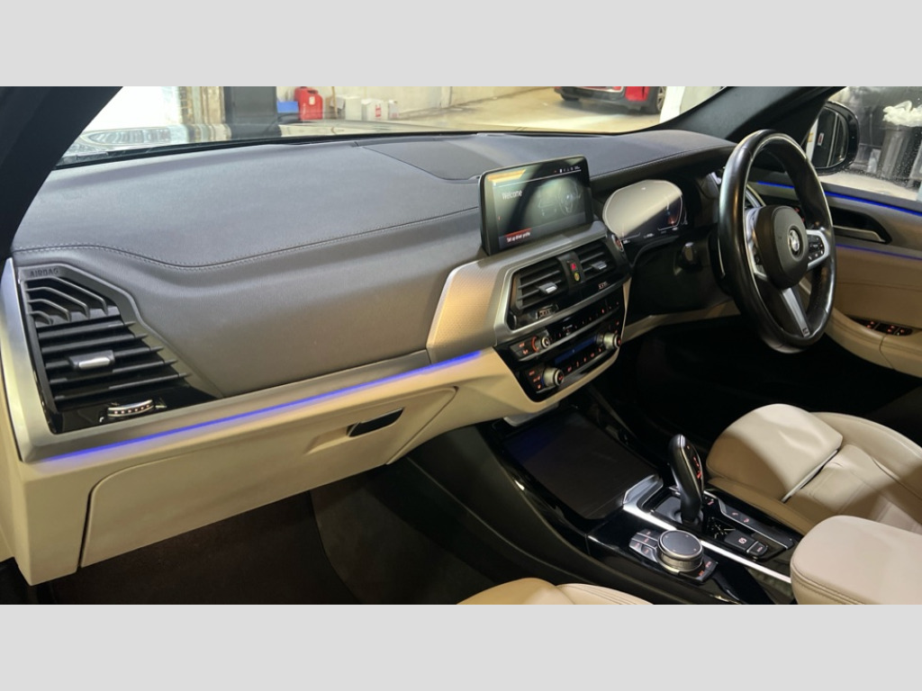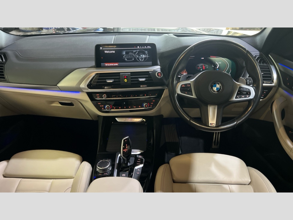 BMW X3 xDrive20d MHT M Sport 5dr Step Auto Attentiveness assist, Automatic tailgate operation, Bluetooth hands free telephone connection with USB audio interface + audio streaming, BMW Live Cockpit Professional sat nav system including 10.25" high resolution display and Intelligent Voice Assistant, BMW Online services, BMW Teleservices, Brake pad wear indicator in front and rear, Check Control warning system for monitoring of lights and door/luggage compartment open warning, Control display - 6.5" colour display screen, Electric Power Steering (EPS) with Servotronic, iDrive Controller with 8 favourite buttons, Lights on warning by audio warning signal when ignition is switched off, Navigation system - BMW Professional multimedia with Hard disc drive (HDD) and 10.25" touch display, Oil sensor for level and grade, warning by check control system, On board computer - average speed+fuel consumption, service interval, clock/date, odometer/trip meter, outside temperature display and ice warning, Optimum shift indicator, Personal Profile - automatic lock when driving away selectable, Semi digital instrument cluster, Stop/start system, Automatic transmission with gearshift paddles, Diesel particulate filter, Drive performance control with ECO PRO comfort + sport mode, Incorrect fuelling protection, Larger capacity fuel tank, M sport suspension, Multi-link rear suspension, Performance Control, 6 speakers, Auxiliary socket for external MP3 player, BMW professional radio/CD/MP3, DAB Digital radio, Acoustic glazing, Black finish on B pillars, Body colour door handles, Body colour electric adjust heated aspherical door mirrors, Body colour roof mouldings, Body coloured bumpers, Chrome kidney grille with high gloss black vertical slats, Direction indicator, side repeaters, integrated in exterior mirrors, Dual chrome exhaust, Dynamic brake lights, Exterior mirrors - electrically folding with anti-dazzle, Fingertip control / anti-trap function on electric window, Follow me home headlights, Front and rear bumper system with replaceable deformation elements, Front and rear electric windows, Green tinted heat insulating glass, Heated windscreen washer jets, Height adjustable headlamps, High gloss black door sill finishers, High gloss black shadow line roof rails, High gloss shadowline exterior trim in decorative moulding side frame/recess cover/guide rail/B, C pillars/mirror frame and triangle with mirror base, High level 3rd brake light incorporating LED Technology, Interior rear view electrochromatic mirror with automatic anti dazzle function, LED front fog lights, LED tail lights, Lightweight engineering, M aerodynamic bodystyling, Model designation, Rain sensor including auto headlights activation, Rear wiper, Shark fin antenna, Side exterior M designation badges, Visible VIN plate, Welcome lighting, Windscreen wipers with adjustable interval, 12V socket in centre console and luggage area, 3 rear headrests, 3 zone automatic air conditioning, 4 lashing points to secure luggage, Ambient lighting, Anthracite headlining, Anthracite Velour floor mats, Door sill finishers with BMW Individual designation, Driver/passenger sunvisors with ticket holders + illuminated vanity mirrors, Foldable boot floor with storage compartment, Four grab handles integrated in roof lining, Front and rear bottle holders integrated into door trim storage compartments, Front and rear side armrests integrated into door trim, Front centre armrest with storage compartment, Front footwell lights, Front sports seats, Front/rear courtesy lights with soft on/off dimming, Front/rear reading lights, Height adjustable front/rear head restraints, Illuminated glovebox with lock, Isofix rear child seat preparation, Leather gear knob, Luggage area underfloor compartment, Luggage compartment lighting, M sport leather steering wheel, Parcel shelf removeable and storable under boot floor, Reach and rake adjustable steering column, Rear centre armrest with 2 cupholders, Removable / retractable luggage cover, Slope adjustable rear seats, Storage compartment in rear centre console and front/rear door trims, Through loading system with 40/20/40 split folding rear seat, Toolkit located in luggage compartment, Two front cupholders with removable oddments tray/lid, Vernasca leather upholstery, Connected pack professional - X3, ABS/EBD, ADB - Automatic Differential Brake, Automatic Stability Control (ASC), Battery safety cut-off, BMW emergency call, Brake assist, Brake drying, Brake energy regeneration, Braking pre-tensioning, Child locks on rear doors, Cornering brake control (CBC), Crash Sensor - activation of central locking release, hazard warning light and interior lighting, Deactivation of fuel pump in the event of a crash, Driver and front passenger front and side airbags with passenger deactivation and ITS front and rear head airbags, DSC+, Dynamic brake control, Dynamic Traction Control - DTC, Electromechanical parking brake, Front seat belts warning, Hill descent control, Hill start assist, Seatbelt security check for front seats, Side impact protection, Three point seatbelts to all seats with front and outer rear pyrotechnic belt tensioners and seat belt force limiters, Two tone horn, Tyre pressure monitoring system, Ventilated front and rear disc brakes, Warning triangle and first aid kit, Central locking switch for all doors, fuel filler cap and luggage compartment, Electronic engine immobiliser, Locking wheel nuts, Remote control including two integrated key - one button for open/close all lockable content, windows and separate button for open luggage compartment, Remote control Thatcham category 1 alarm, Start/stop button with Comfort Go keyless engine start and auto Start/stop deactivation button, Low rolling resistance tyres