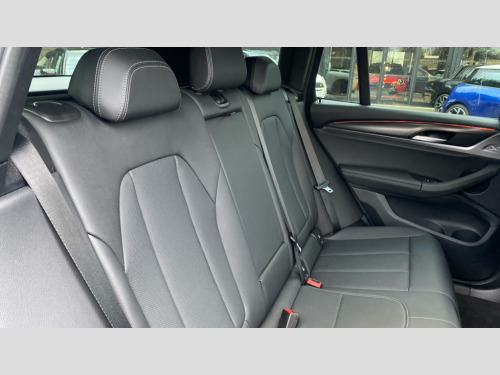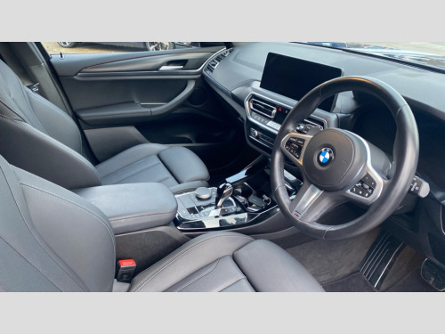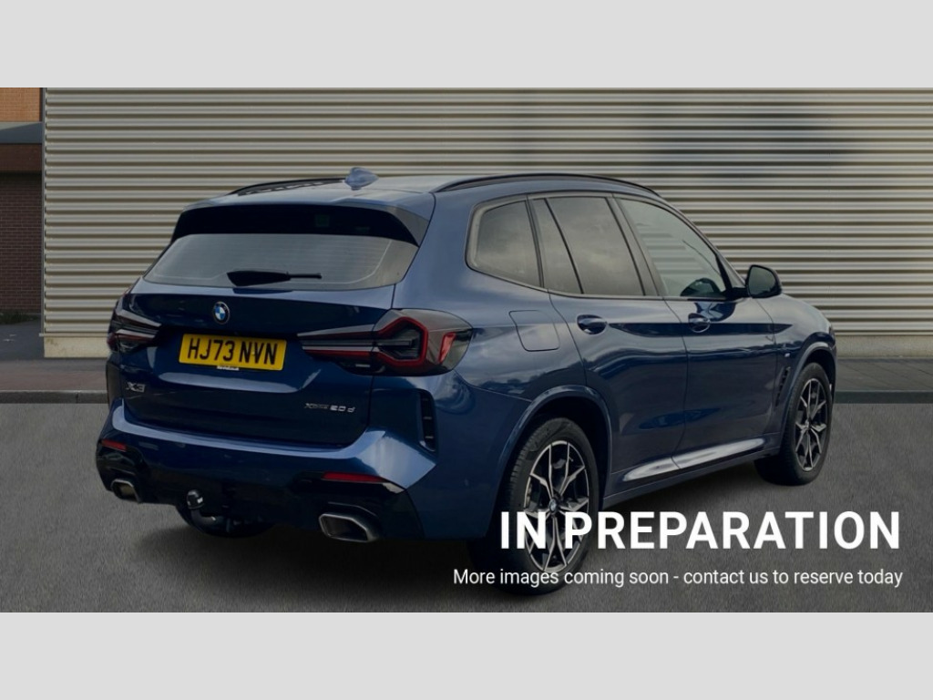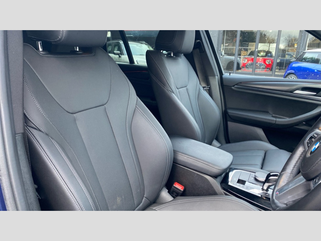 BMW X3 xDrive20d MHT M Sport 5dr Step Auto Active Guard, Attentiveness assist, BMW Live Cockpit Professional nav system including 12.3" instrument display + 12.3 high resolution control display, BMW Online services, BMW Teleservices, Brake pad wear indicator in front and rear, Check Control warning system for monitoring of lights and door/luggage compartment open warning, Condition based service - BMW service history, electronic service booklet, integrated owner's handbook, Connected drive services, Electric boot lid, Front/rear Parking distance control, iDrive touch controller with 8 favourite buttons, Instrument cluster with speedometer with mph readout, tachometer, fuel gauge and oil temperature gauge, Lights on warning by audio warning signal when ignition is switched off, Oil sensor for level and grade, warning by check control system, On board computer - average speed+fuel consumption, service interval, clock/date, odometer/trip meter, outside temperature display and ice warning, Optimum shift indicator, Personal Profile - automatic lock when driving away selectable, Run flat indicator, Stop/start system, Variable sports power steering with drive performance control Sport+ mode, Automatic transmission with gearshift paddles, Diesel particulate filter, Incorrect fuelling protection, Larger capacity fuel tank, M sport suspension, Multi-link rear suspension, BMW professional radio/CD/MP3, DAB tuner, Acoustic glazing, Automatic windscreen wipers and automatic headlight, Black finish on B pillars, Body colour door handles, Body colour electric adjust heated aspherical door mirrors, Body colour roof mouldings, Body coloured bumpers, Direction indicator, side repeaters, integrated in exterior mirrors, Dynamic brake lights, Exhaust tailpipes - dual, round, split left and right with chrome finisher, Fingertip control / anti-trap function on electric window, Folding wing mirrors with auto dimming, Follow me home headlights, Front and rear bumper system with replaceable deformation elements, Front and rear electric windows, Gloss chrome tailpipes finishers, Green tinted heat insulating glass, Heated windscreen washer jets, High beam assistant, High gloss black shadow line roof rails, High gloss shadowline exterior trim in decorative moulding side frame/recess cover/guide rail/B, C pillars/mirror frame and triangle with mirror base, High level 3rd brake light incorporating LED Technology, Interior rear view electrochromatic mirror with automatic anti dazzle function, LED tail lights, Lightweight engineering, M aerodynamic bodystyling, M Sport entry door sill strips, Model designation, Rain sensor, Rear side wing doors, Rear wing door, Rear wiper, Shark fin antenna, Side exterior M designation badges, Visible VIN plate, Welcome lighting, Windscreen wipers with adjustable interval, 12V power point in luggage area, 12V power socket in front centre console, 2 x USB Type C ports for charging and data transmission (front centre console) and 2 x USB Type C ports for charging (rear centre console), 3 rear headrests, 3 seat bench in 2nd row, 3 zone automatic air conditioning, 4 lashing points to secure luggage, 40:20:40 split folding rear seat with loading system, Ambient lighting, Anthracite headlining, Automatic interior light when door is opened/ignition switched off or via remote key, Floor mats in velour, Foldable storage floor with compartment, Four grab handles integrated in roof lining, Front and rear bottle holders integrated into door trim storage compartments, Front and rear side armrests integrated into door trim, Front centre armrest with storage compartment, Front footwell lights, Front head restraints, Front passenger seat, Front sports seats, Front/rear courtesy lights with soft on/off dimming, Front/rear reading lights, Heated front seats, Isofix rear child seat preparation, Leather gear knob, Lockable glove compartment, Luggage area underfloor compartment, Luggage compartment lighting, M sport leather steering wheel, Multifunction steering wheel, Parcel shelf removeable and storable under boot floor, Reach and rake adjustable steering column, Rear centre armrest with 2 cupholders, Removable / retractable luggage cover, Slope adjustable rear seats, Storage compartment in rear centre console and front/rear door trims, Sun visors with vanity mirrors and ticket pocket, Toolkit located in luggage compartment, Two front cupholders with removable oddments tray/lid, Connected pro pack - X3, ADB - Automatic Differential Brake, Anti-lock braking system (ABS) with brake assist, Automatic Stability Control (ASC), Battery safety cut-off, BMW emergency call, Brake drying, Brake energy regeneration, Braking pre-tensioning, Child locks on rear doors, Cornering brake control (CBC), Crash Sensor - activation of central locking release, hazard warning light and interior lighting, Deactivation of fuel pump in the event of a crash, Driver and front passenger front and side airbags with passenger deactivation and ITS front and rear head airbags, Driver and front passenger knee airbag, DSC+, Dynamic brake control, Dynamic Traction Control - DTC, Electromechanical parking brake, Hill descent control, Hill start assist, Seatbelt security check for front seats, Side impact protection, Three point seatbelts to all seats with front and outer rear pyrotechnic belt tensioners and seat belt force limiters, Two tone horn, Tyre pressure sensor, Ventilated front and rear disc brakes, Warning triangle and first aid kit, Central locking switch for all doors, fuel filler cap and luggage compartment, Electronic engine immobiliser, Locking wheel nuts, Remote control including two integrated key - one button for open/close all lockable content, windows and separate button for open luggage compartment, Remote control Thatcham category 1 alarm, Start/stop button with Comfort Go keyless engine start and auto Start/stop deactivation button, Low rolling resistance tyres