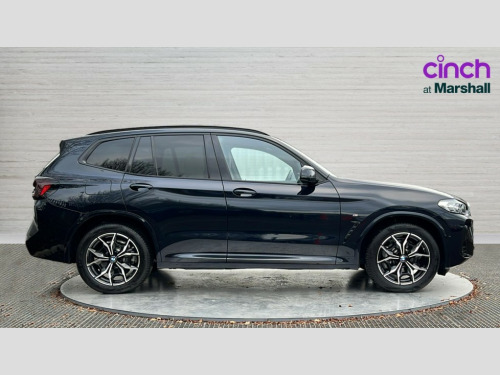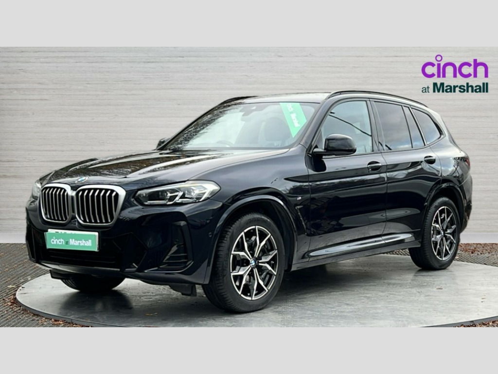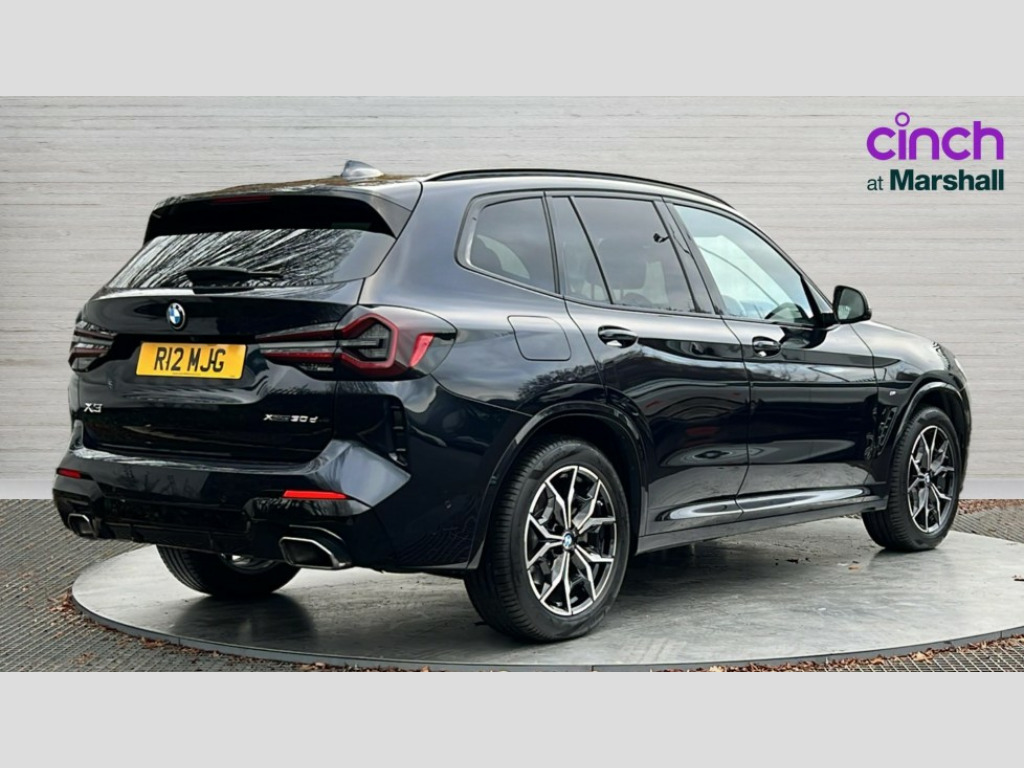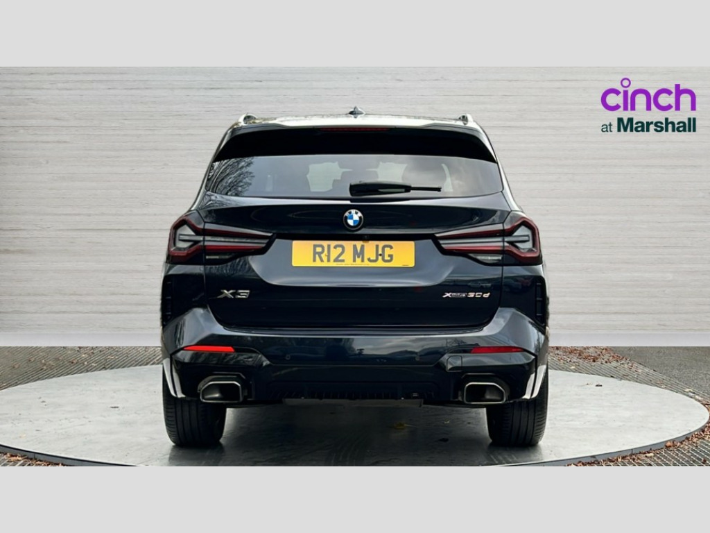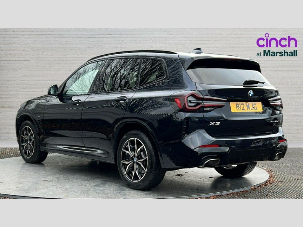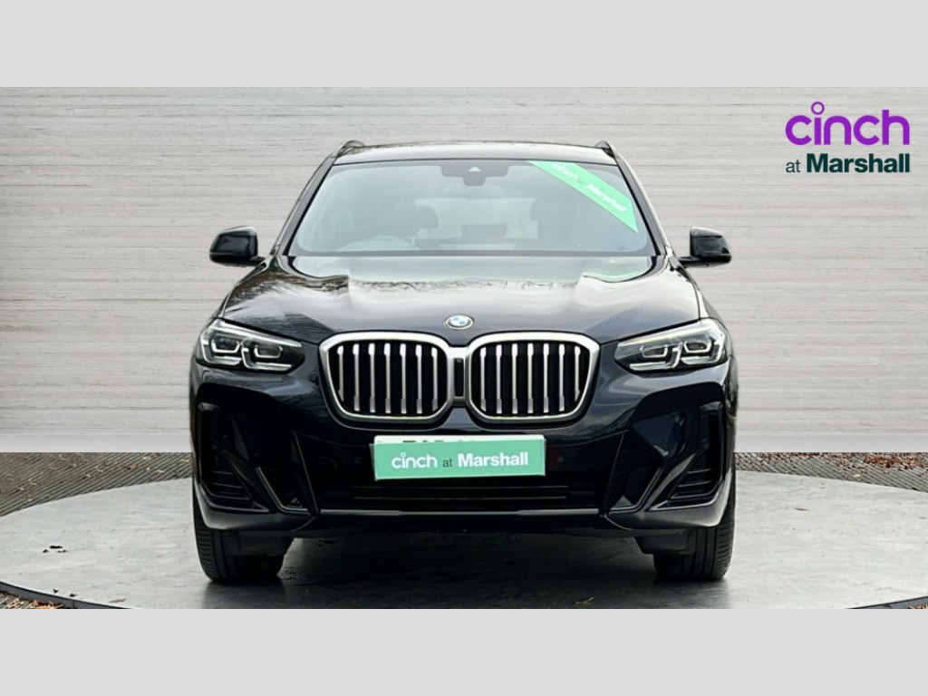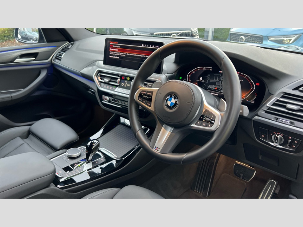 BMW X3 xDrive30d MHT M Sport 5dr Auto Active Guard, Attentiveness assist, BMW Live Cockpit Professional nav system including 12.3" instrument display + 12.3 high resolution control display, BMW Online services, BMW Teleservices, Brake pad wear indicator in front and rear, Check Control warning system for monitoring of lights and door/luggage compartment open warning, Condition based service - BMW service history, electronic service booklet, integrated owner's handbook, Connected drive services, Electric boot lid, Front/rear Parking distance control, iDrive touch controller with 8 favourite buttons, Instrument cluster with speedometer with mph readout, tachometer, fuel gauge and oil temperature gauge, Lights on warning by audio warning signal when ignition is switched off, Oil sensor for level and grade, warning by check control system, On board computer - average speed+fuel consumption, service interval, clock/date, odometer/trip meter, outside temperature display and ice warning, Optimum shift indicator, Personal Profile - automatic lock when driving away selectable, Run flat indicator, Stop/start system, Variable sports power steering with drive performance control Sport+ mode, Diesel particulate filter, Incorrect fuelling protection, Larger capacity fuel tank, M sport suspension, Multi-link rear suspension, Sport automatic transmission with gearshift paddles, BMW professional radio/CD/MP3, DAB tuner, Acoustic glazing, Automatic windscreen wipers and automatic headlight, Black finish on B pillars, Body colour door handles, Body colour electric adjust heated aspherical door mirrors, Body colour roof mouldings, Body coloured bumpers, Direction indicator, side repeaters, integrated in exterior mirrors, Dynamic brake lights, Exhaust tailpipes - dual, round, split left and right with chrome finisher, Fingertip control / anti-trap function on electric window, Folding wing mirrors with auto dimming, Follow me home headlights, Front and rear bumper system with replaceable deformation elements, Front and rear electric windows, Gloss chrome tailpipes finishers, Green tinted heat insulating glass, Heated windscreen washer jets, High beam assistant, High gloss black shadow line roof rails, High gloss shadowline exterior trim in decorative moulding side frame/recess cover/guide rail/B, C pillars/mirror frame and triangle with mirror base, High level 3rd brake light incorporating LED Technology, Interior rear view electrochromatic mirror with automatic anti dazzle function, LED tail lights, Lightweight engineering, M aerodynamic bodystyling, M Sport entry door sill strips, Model designation, Rain sensor, Rear side wing doors, Rear wing door, Rear wiper, Shark fin antenna, Side exterior M designation badges, Visible VIN plate, Welcome lighting, Windscreen wipers with adjustable interval, 12V power point in luggage area, 12V power socket in front centre console, 2 x USB Type C ports for charging and data transmission (front centre console) and 2 x USB Type C ports for charging (rear centre console), 3 rear headrests, 3 seat bench in 2nd row, 3 zone automatic air conditioning, 4 lashing points to secure luggage, 40:20:40 split folding rear seat with loading system, Ambient lighting, Anthracite headlining, Automatic interior light when door is opened/ignition switched off or via remote key, Floor mats in velour, Foldable storage floor with compartment, Four grab handles integrated in roof lining, Front and rear bottle holders integrated into door trim storage compartments, Front and rear side armrests integrated into door trim, Front centre armrest with storage compartment, Front footwell lights, Front head restraints, Front passenger seat, Front sports seats, Front/rear courtesy lights with soft on/off dimming, Front/rear reading lights, Heated front seats, Isofix rear child seat preparation, Leather gear knob, Lockable glove compartment, Luggage area underfloor compartment, Luggage compartment lighting, M sport leather steering wheel, Multifunction steering wheel, Parcel shelf removeable and storable under boot floor, Reach and rake adjustable steering column, Rear centre armrest with 2 cupholders, Removable / retractable luggage cover, Slope adjustable rear seats, Storage compartment in rear centre console and front/rear door trims, Sun visors with vanity mirrors and ticket pocket, Toolkit located in luggage compartment, Two front cupholders with removable oddments tray/lid, Connected pro pack - X3, ADB - Automatic Differential Brake, Anti-lock braking system (ABS) with brake assist, Automatic Stability Control (ASC), Battery safety cut-off, BMW emergency call, Brake drying, Brake energy regeneration, Braking pre-tensioning, Child locks on rear doors, Cornering brake control (CBC), Crash Sensor - activation of central locking release, hazard warning light and interior lighting, Deactivation of fuel pump in the event of a crash, Driver and front passenger front and side airbags with passenger deactivation and ITS front and rear head airbags, Driver and front passenger knee airbag, DSC+, Dynamic brake control, Dynamic Traction Control - DTC, Electromechanical parking brake, Hill descent control, Hill start assist, Seatbelt security check for front seats, Side impact protection, Three point seatbelts to all seats with front and outer rear pyrotechnic belt tensioners and seat belt force limiters, Two tone horn, Tyre pressure sensor, Ventilated front and rear disc brakes, Warning triangle and first aid kit, Central locking switch for all doors, fuel filler cap and luggage compartment, Electronic engine immobiliser, Locking wheel nuts, Remote control including two integrated key - one button for open/close all lockable content, windows and separate button for open luggage compartment, Remote control Thatcham category 1 alarm, Start/stop button with Comfort Go keyless engine start and auto Start/stop deactivation button, Low rolling resistance tyres