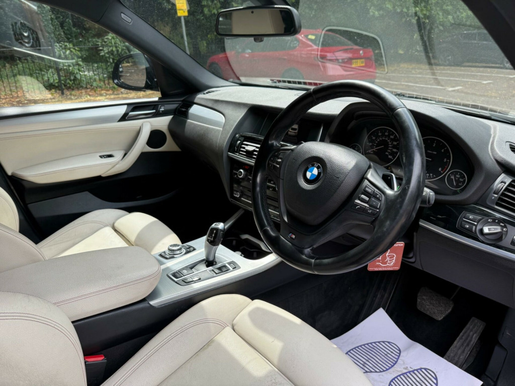This 2015 BMW X4 20d M Sport boasts a full service history and a clear vehicle history check, offering you complete peace of mind. As a Euro 6 compliant model, it features a powerful yet efficient 2.0L diesel engine paired with BMW's renowned four wheel drive system for excellent all weather capability. The M Sport trim enhances its sporty appeal, and you'll appreciate the convenience of Xenon headlights with automatic activation, Bluetooth hands free with USB audio, heated front seats, and rear park distance control.Experience impressive performance with a 0-62mph acceleration time of just 8.0 seconds, while also benefiting from an excellent fuel economy of 54 mpg, which is better than many similar vehicles. This X4 also offers generous boot space for all your needs and low CO2 emissions (Euro 6), making it a more environmentally conscious choice. CAR COMES WITH A LONG MOT. ENGINE AND GEARBOX IS GOOD WITH NO ISSUES; SMOOTH DRIVE.BODY WORK IS IN GOOD CONDITION. INTERIOR IS GOOD WITH NO RIP/TEARS ON THE SEATS. TYRES ARE IN GOOD CONDITION. FREE DELIVERY AVAILABLE, NATIONWIDE CONTACTLESS DELIVERY (terms and conditions apply)RESERVE OUR CARS FOR £99 - FULLY REFUNDABLE UPON VIEWING!ALL MAJOR DEBIT & CREDIT CARDS ACCEPTED. FINANCE AVAILABLE, PART EXCHANGE WELCOMEOPEN 7 DAYS A WEEK CONTACT US DAY OR NIGHT! EXTENDED WARRANTY AVAILABLE.---- MAYFAIR MOTORS LTD - WE HAVE BEEN IN BUSINESS FOR OVER 10 YEARS! - FCA APPROVED, VAT REGISTERED ---- hanced bluetooth telephone preparation with usb audio interface and voice control, nevada leather - ivory white application and stamping black, 12v power socket - centre console, 19in alloy wheels - light m double-spoke style 622m, 40-20-40 split folding rear seats, abs - anti lock braking system, asc - automatic stability control, additional detachable cupholder, air conditioning - automatic with two-zone control, airbags - curtain head protection system, airbags - driver, airbags - front side, airbags - passenger, airbags - passenger deactivation, alarm system thatcham 1 with remote control, ambient interior lighting, anti roll bars - front and rear, armrest - front with storage compartment, armrest - rear centre, automatically dimming rear view mirror, auxiliary input, bmw emergency call, bmw individual reading lights - rear, bmw professional radio - single cd and mp3, bmw teleservices, bluetooth hands free with usb audio interface, brake drying, brake fade compensation, brake force display, brake pre-tensioning, cbc - cornering brake control, central locking - remote, child proof locking system - rear doors, child seat isofix attachment - rear x2, crash sensor - activating central locking-hazard warning lights-fuel cut off, cruise control with brake function, dab digital radio, dbc - dynamic brake control, dsc - dynamic stability control - stabilises the vehicle in extreme situations - controls traction, dtc - dynamic traction control, daytime running lights, door handles - body colour, door mirrors - body coloured, door mirrors - electric and heated and aspheric, door sill finishers - m designation, drive performance control with eco pro - comfort and sport modes, ebd - electronic brake-force distribution, electric windows - front and rear with open-close fingertip control, electro mechanical parking brake, embellishers for instrument panel - black high-gloss, engine immobiliser, exterior trim - high-gloss shadowline, first aid kit, floor mats - velour, follow me home headlight function, footwell lights - front, glove compartment - illuminated, grab handles with coat hooks, hdc - hill descent control, head restraints - front and rear, headlights - automatic activation, headlights - height adjustment, headlights - washer system, headlining - anthracite, heated windscreen washer jets, high level third brake light, hill start assist, incorrect fuelling protection system, interior trim - brushed aluminium, keyless start, kidney grille - chrome with black vertical slats, led fog lights - front, lashing eyes in luggage compartment x4, locking wheel bolts, luggage compartment - removable cover, m aerodynamic bodystyling, m sport package, media package - bmw business, multifunction controls for steering wheel, navigation system - bmw business advanced, obc - on-board computer, optimum shift indicator, pdc - park distance control - front, pdc - park distance control - rear, performance control, power socket - 12v in luggage compartment, rain sensor, reading lights - front and rear, run flat tyres, seats - front - manual height adjustment, seats - front heated, side impact protection, speakers x6, sport seats - front, steering column with manual reach and rake adjustment, steering wheel - gearshift paddles, steering wheel - leather - m sport, storage compartment - front door pockets, storage compartment - trays in centre console, sun visors with illuminated vanity mirrors and ticket holder, suspension - sport, tpms - tyre pressure monitoring system, tailgate operation - powered, usb audio interface, variable sport steering, voice control - phone, warning triangle, xenon headlights, idrive controller on centre console with 6.5in colour display