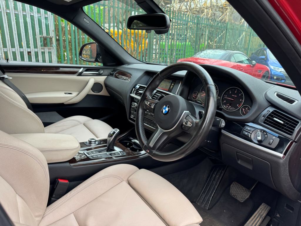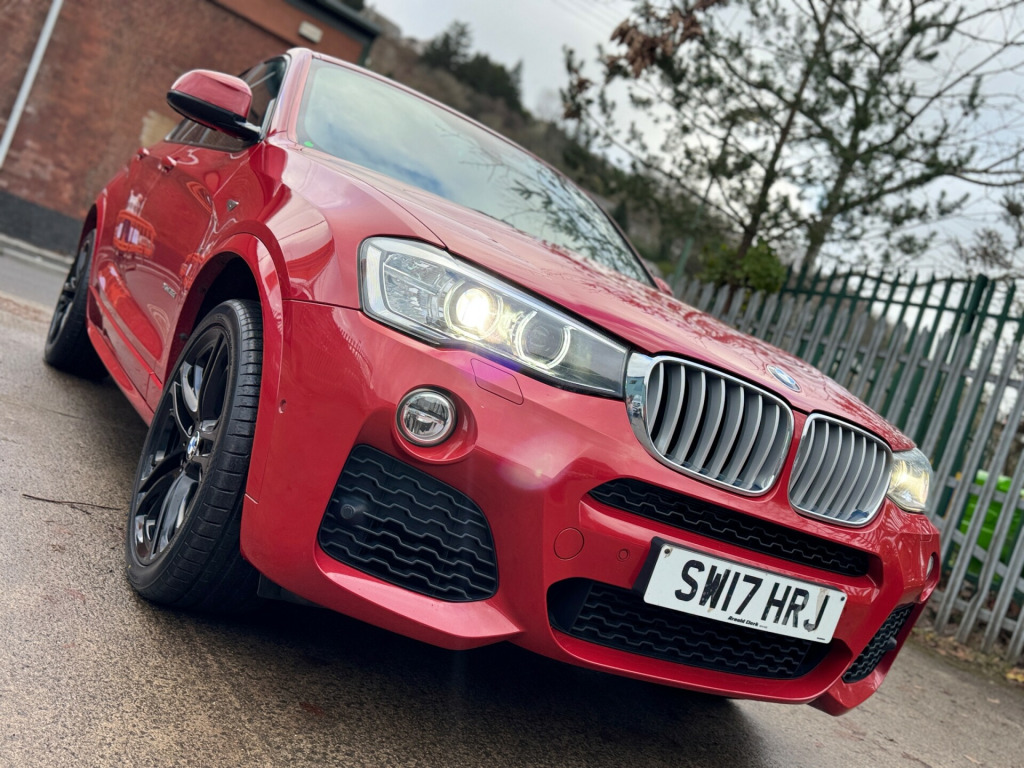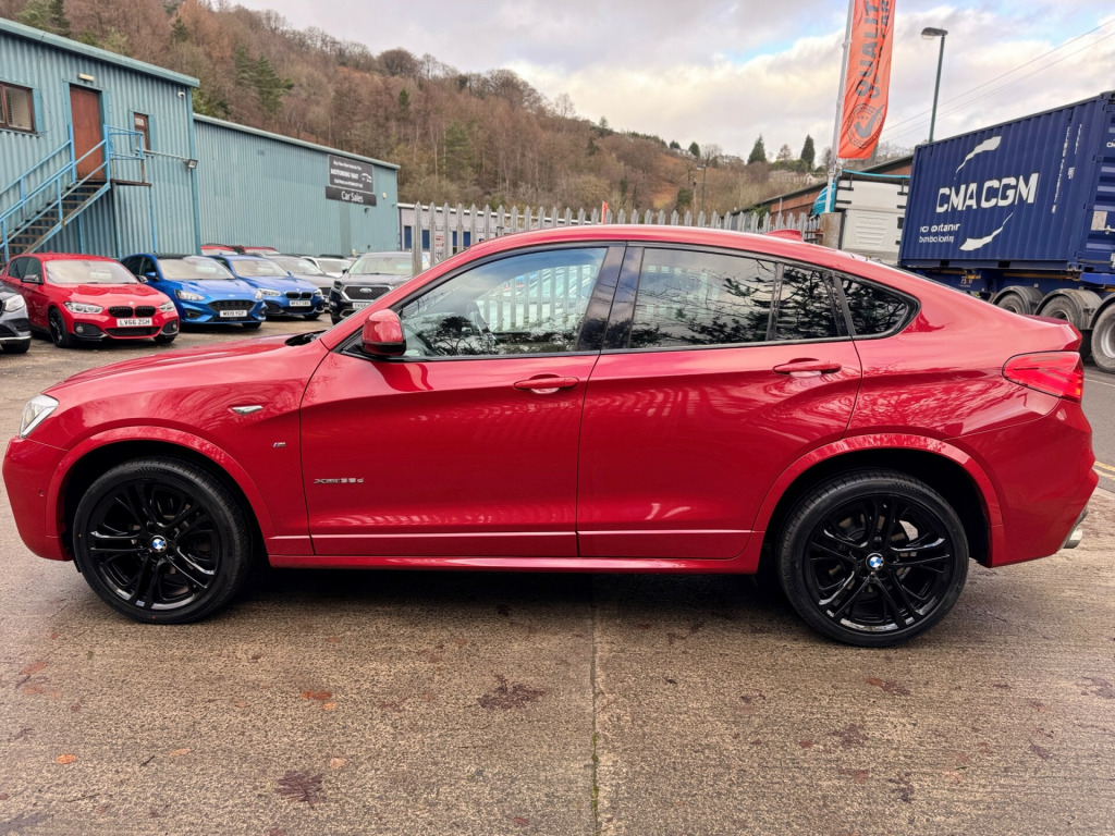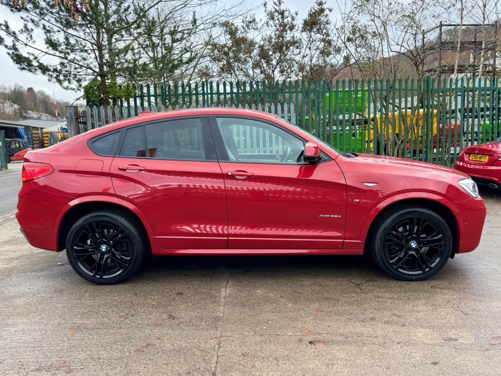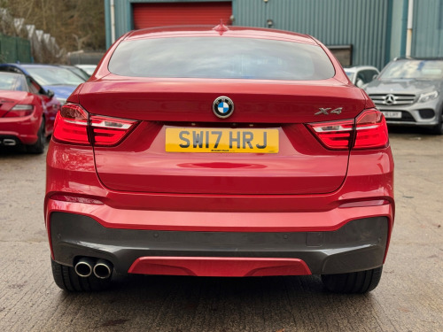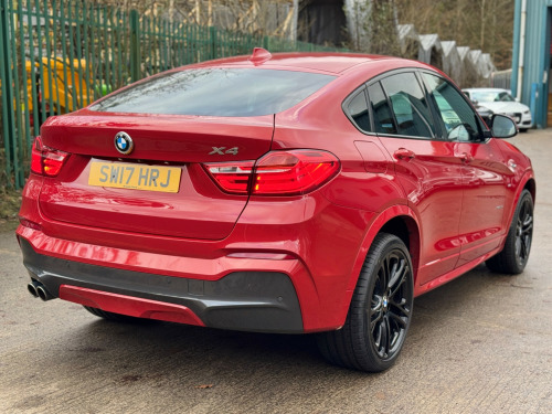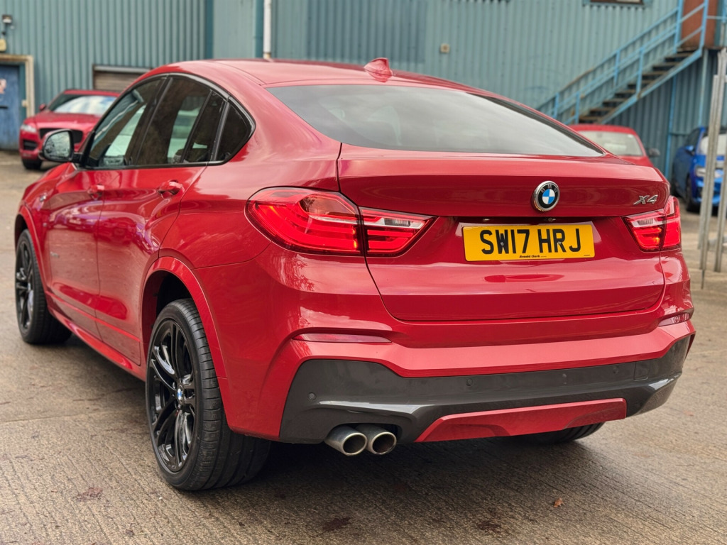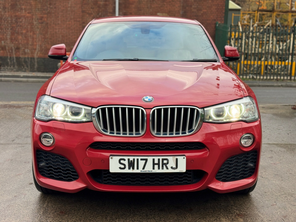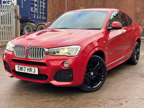 This 2017 BMW X4 3.0 35d M Sport SUV with 65994 miles on the clock is a Diesel-powered, ULEZ compliant vehicle in excellent condition. With 5 doors and 5 seats, this SUV comes with a long MOT valid until 31/07/2026. Featuring a powerful 313 ps engine, this Euro 6 (s/s) vehicle also includes 20in Alloy Wheels, M Sport Plus Package, and Sun Protection Glazing for added style and comfort. In a striking Melbourne Red color, this SUV also boasts an Advanced Parking Package, making it a practical and luxurious choice for anyone in need of a reliable and high-performance vehicle.UK delivery available.Part exchange welcome.AA extended warranty partner.AA standards approved dealership.Trading standards approved dealership.Autotrader highly rated dealership. in alloy wheels - light m double-spoke style 622m, b pillar - black mat, door handles - body colour, electric windows - front and rear with open-close fingertip control - anti-trap facility and comfort closing function, exhaust - dual with chrome finisher, exterior mirrors in body colour, exterior trim - high-gloss shadowline, heated windscreen washer jets, indicator lenses - clear, kidney grille - chrome with satin aluminium vertical slats, m aerodynamic bodystyling, m sport package, model designation, run flat tyres, wheels - locking wheel nuts, air conditioning - automatic - dual zone, ambient lighting, armrest - front with storage compartment, armrest - rear, automatically dimming rear view mirror, courtesy lights - front and rear with soft on-off dimming, cup holders - centre console with roll cover, door sill finishers - m designation, embellishers for instrument panel - black high-gloss, floor mats - velour, footwell lights - front, glove compartment - illuminated, grab handles with coat hooks - rear, head restraints - front and rear, headlining - anthracite, interior trim - brushed aluminium, luggage compartment - illuminated with four lashing eyes in boot floor, luggage compartment - removable cover, m leather steering wheel with gearshift paddles, rain sensor with automatic headlight activation, reading lights - front and rear, rear fog light, seat heating - front, seats - front sports, seats - manual adjustment for height - fore and aft position - recline angle and headrest, split folding rear seat - 40-20-40, start-stop button with keyless operation, steering column with manual reach and rake adjustment, steering wheel - gearshift paddles, storage pockets in both front doors, storage trays in centre console, sun visors with illuminated vanity mirrors and ticket pocket, tailgate operation - automatic, through-loading system, two tone horn, airbags, alarm system - thatcham 1 with remote control and engine immobiliser, anti roll bars - front and rear, central locking for doors boot and fuel flap activated via remote key or cabin switch, child locking system - rear doors, child seat isofix attachment - rear, dsc - dynamic stability control with extended contents, deformation zones - front and rear, electro mechanical parking brake, first aid kit and warning triangle, hdc - hill descent control, incorrect fuelling protection system, seat belts - front inertia reel with pyrotechnical belt latch tensioner and belt force limiter, seat belts - rear - three with inertia reel, side impact protection, auxiliary input point for auxiliary playing devices, bmw connecteddrive online services, bmw emergency call, bmw navigation system, bmw professional radio with single cd player - with mp3 playback compatibility, bmw teleservices, bluetooth hands free with usb audio interface, dab digital radio, loudspeaker system with six speakers, power sockets - 12v in front centre console and 12v in luggage compartment, real time traffic information, brake force display, cruise control with brake function, drive performance control - eco pro - comfort - sport - sport plus, instrument binnacle with speedometer - tachometer - fuel level and consumption, obc - on-board computer, pdc - park distance control - front and rear, performance control, servotronic steering, suspension - sport, tpms - tyre pressure monitoring system, variable sport steering, idrive controller on centre console with 6.5in colour display, xdrive status display, headlights - height adjustment, headlights - washer system, high level third brake light, led fog lights - front, xenon headlights, xenon headlights with follow-me-home function