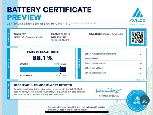 ** 1 Previous Owner ** ** Finance Soft Search Pre Approval ** This 66 Plate BMW X5 2.0 40e 9.0kWh M Sport SUV 5dr Petrol Plug-in Hybrid Auto xDrive Euro 6 (313bhp) has covered 99,000 miles in Black with BMW Individual Terra Leather interior, Vehicle has service history. 1 Previous Owner, Lane Assist, Traffic Jam Assist, Sat Nav, Heated Front & Rear Seats, Heated Steering Wheel, Panoramic Roof, Head Up Display, Dual Climate Control, Bang & Olufsen Speakers, AA Approved Dealer + much more + 6 months nationwide warranty included (with certain prep packages), upgrades available + Any inspection/test drive more than welcome + Up to 40 photos available + Video walk around available on request + Credit/Debit card payment welcome + Approved finance partner with consumer credit licence held + Part exchange welcome + Private plate transfers, delivery service all available on request + Call 7 days a week to discuss and book an appointment Dakota Leather - Terra with Black Interi, Instrument Panel - Leather, Luggage Compartment Separating Net, Dakota Leather - Canberra Beige with Bei, Universal Remote Control, 12V Power Sockets, 20GB HDD Memory, 20in Alloy Wheels - Light M Double Spoke, 40-20-40 Split Folding Rear Seats, Adaptive M Sport Suspension, Air Conditioning - Automatic with Two-Zo, Airbags, Alarm System - Thatcham 1 with Remote Co, Ambient Interior Lighting, Armrest - Front with Storage Compartment, Automatic Start-Stop Button, Automatic Transmission with Gearshift Pa, Automatically Dimming Rear View Mirror, Auxiliary Input Point for Auxiliary Play, BMW ConnectedDrive Online Services, BMW ConnectedDrive Services, BMW
