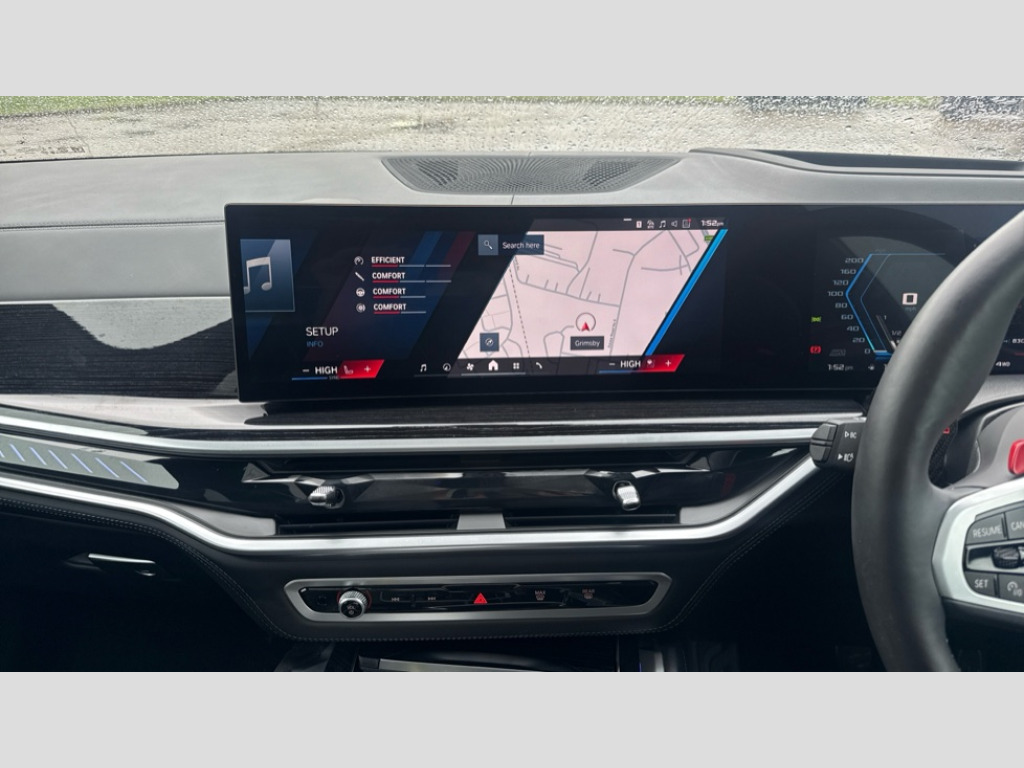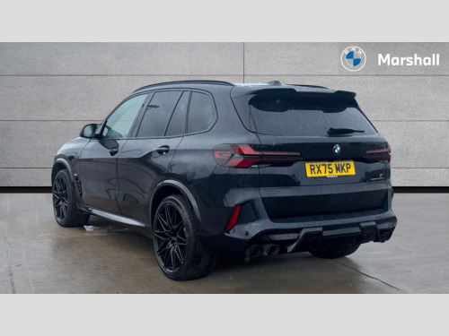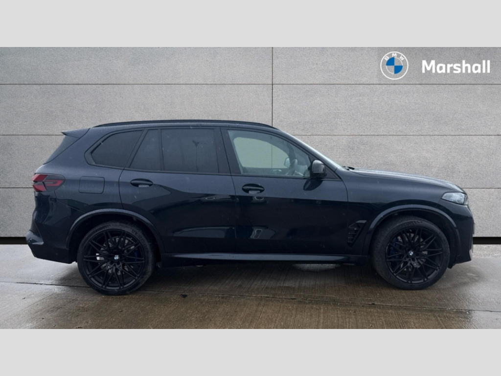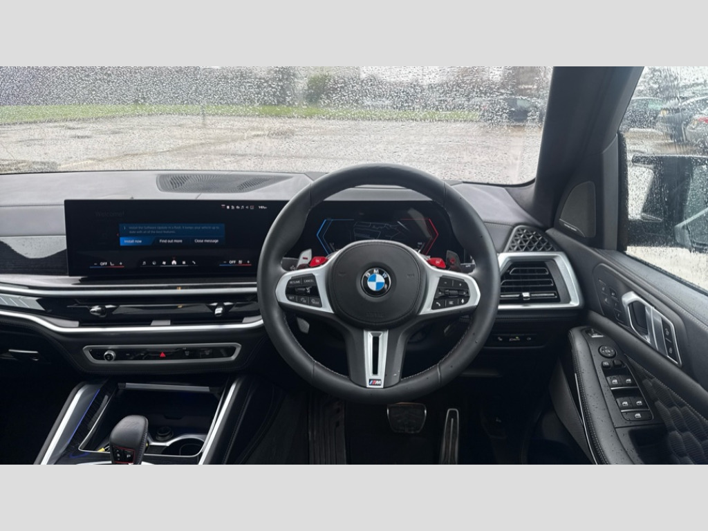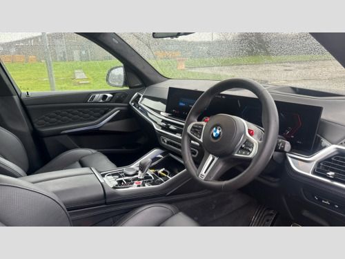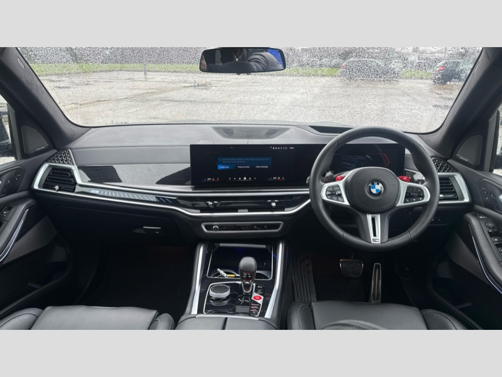 BMW X5 M xDrive X5 M Competition 5dr Step Auto 32GB hard disc drive (HDD) memory, Attentiveness assist, Automatic tailgate with seperately opening top hinged section, BMW ConnectedDrive online services, BMW Drive recorder, BMW gesture control, BMW legal emergency call, BMW Live Cockpit Pro with Head up display including 12.3" instrument display and 14.9" high resolution control display with navigation function, BMW Recovery system, BMW Teleservices, Brake force display, Brake pad wear indicator warning light, Condition based service - BMW service history, electronic service booklet, integrated owner's handbook, Electric power steering, Enhanced bluetooth hands free facility with Telephony wireless charging, Front/rear park distance control (PDC), iDrive controller with shortcut buttons, Infinity symbol with line graphic on reset of average consumption, Language version English, M drive buttons, M servotronic, Oil sensor for level and grade, On board computer inc. average speed, fuel consumption, liquid crystal Info display, journey computer, outside temperature display, personal profile, Recovery braking system, Run flat indicator, Service interval indicator, Stop/start button, Storage for wireless charging, Wi-Fi hotspot, 8 speed automatic with steptronic transmission including launch control and gearshift paddles on the steering wheel, Active M differential, BMW M TwinPowerTurbo 8 cylinder petrol engine, Double VANOS, High precision injection, M Adaptive suspension pro, M Sport differential, M xDrive system, Petrol Particulate Filter, Safety battery terminal clamp, Turbocharger with Valvetronic, BMW Personal eSim, DAB Tuner enables digital radio reception, Favourite buttons, USB connection, USB type A 1.5A in cupholder, USB Type C 3A in centre armrest, Adaptive LED Headlights, Automatically dimming rear view mirror, BMW Individual high gloss shadow line exterior trim, BMW Individual high gloss shadow line with extended contents, BMW individual lights shadow line, Body color M rear spoiler, Body colour bumpers, Body colour door handles, Body colour roof spoiler, Brake lights illuminate under normal braking, Door locking - after driving off to secure vehicle, Dynamic brake lights with LED technology, Exterior mirror base in black matt, Follow me home headlight function, Front and rear bumper system, Front and rear door sill strips, Front and rear electric windows with open and close fingertip control, anti trap facility and comfort closing, Heated windscreen washer jets, High beam assistant, High gloss black shadow line roof rails, Integrated direction indicators, LED daytime running lights, LED fog lights, LED Rear light with tail light, brake light and turn indicators, LED Reflectors, left and right, integrated in tailgate, M Sport exhaust system, M strake element with model designation, integrated in the Air Breather, M-specific Exterior mirrors, Rain sensor with automatic headlight activation and windscreen wiper control, Rear side wing doors, Rear wiper, Roller shutter, Sun protection glazing, Third brake light in rear spoiler, Trailer stabilisation logic, Under severe vehicle deceleration, Variable intermittent rear wash/wipe, Welcome light carpet, X5 M competition badging on tailgate high gloss black right finished, 12V - Power sockets with 2x centre console and 1x luggage compartment, 3 rear headrests, 3 seat bench in 2nd row, 4 Lashing eyes in boot, 4 zone control automatic air conditioning, 40:20:40 split folding rear seats, BMW ID, Child seat ISOFIX attachment with rear outer seats includes top tether, Compartment in front of cupholder, Driver + front passenger lumbar support, Electric adjustment of the upper section of the backrest with Illuminated M logo on the head restraint, Electrical steering column with adjustable height and length with activation and control on the steering column, Front and rear cupholders x 2, Front and rear door pockets, Front and rear side armrest integrated into door trim, Front reading lights, Gear selector lever and operation, Left and right bag hooks in luggage compartment, Light inside glove compartment, Lockable glove compartment, Luggage compartment floor panel with integral storage tray, Luggage compartment lighting, Luggage net, Lumbar support with height and depth adjustment in backrest, M Electric front sport seats with memory function, M sport leather steering wheel, M steering wheel with gearshift paddle switches made of CFC, Multifunction controls for leather steering wheel, Multifunctional hooks, Seat back with flap pocket, Securing rings in luggage compartment, Single front passenger seat, Storage bins on all doors, Storage space underneath the floor insert in luggage compartment, Storage tray and compartment with cover in centre console, Sunvisors with illuminated vanity mirrors, Toolkit located in luggage compartment, Vanity mirror lights, Velour floormats, Ambient light interior pack - X5 M/ X6M, Connected Package Professional - X5 M, Driving Assistant Professional Pack - X5 M, Expanded exterior mirror pack - X5 M/X6 M, Parking Assistant Professional Pack - X5M&X6M, Anti-lock braking system (ABS), Automatic Stability Control (ASC), Black M sports seatbelts with coloured M seam for all seats, Brake drying, Brake energy regeneration, Brake fade compensation, Braking pre-tensioning, Child proof locking system in rear door, Cornering brake control (CBC), Crash sensor activating central locking release, hazard warning lights, fuel cut off, interior lighting + activation of safety battery terminal clamp, Deformation zones - front and rear with door reinforcements and bumpers up to 2.5 mph, Driver and front passenger airbags, Driver and front passenger side airbags, DSC - Dynamic Stability Control, Dynamic brake control, Dynamic Traction Control - DTC, Electromechanical parking brake with automatic drive away release and auto hold function, Electronic brake force distribution, Front and rear brake discs with interior ventilation, Front 