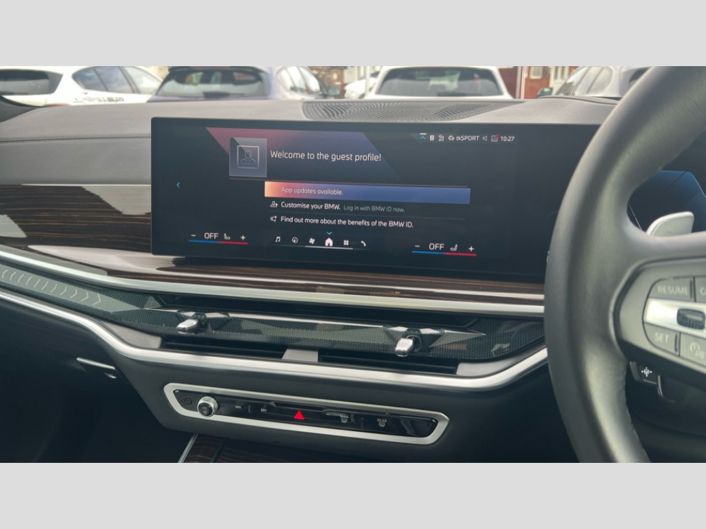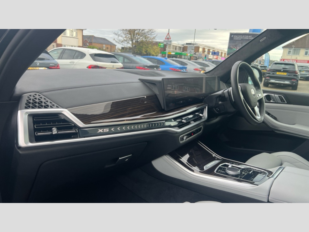 BMW X5 xDrive30d MHT xLine 5dr Auto Attentiveness assist, Automatic tailgate operation, BMW ConnectedDrive online services, BMW Recovery system, BMW Teleservices, Condition based service, Cruise control with brake assist, eCall emergency call system, Enhanced bluetooth with wireless charging, Integrated owner's handbook, PAS, Speed limiter, Wi-Fi hotspot, Drive performance control with ECO PRO comfort + sport mode, Eight speed steptronic sport automatic transmission and gearshift paddles on the steering wheel, Adaptive LED Headlights, Aluminium roof rails, Front and rear electric windows, High beam assistant, LED daytime running lights, Rain sensor, Rear side wing doors, Third brake light in rear spoiler, Variable intermittent rear wash/wipe, 12V - Power sockets with 2x centre console and 1x luggage compartment, 3 seat bench in 2nd row, Electric front seat adjustment with driver and front passenger memory function, Foldable rear centre armrest with 2 cupholders and storage compartment, Front and rear side armrest integrated into door trim, Headrests for all seats, Luggage compartment separating net, Lumbar support with height and depth adjustment in backrest, Single front passenger seat, Three spoke sport leather steering wheel, Velour floormats, Ambient light interior pack - X5, Driving assistant pack with radar based driver assistance system - X5, Expanded exterior mirror pack - X5/X5 M, 3 rear seatbelts, Active protection, Airbags - driver/front passenger, rear and side, first and second row seats head airbags, front passenger seat airbag deactivation + knee airbag, Anti-lock braking system (ABS), Automatic Stability Control (ASC), Brake energy regeneration, Cornering brake control (CBC), Crash sensor activating central locking release, hazard warning lights, fuel cut off, interior lighting + activation of safety battery terminal clamp, DSC - Dynamic Stability Control, Dynamic Traction Control - DTC, Electromechanical parking brake with automatic drive away release and auto hold function, Electronic brake force distribution, Hill start assistant, Mechanical child proof lock on rear doors, Tyre pressure monitoring system, Tyre pressure sensors, Ventilated front and rear disc brakes, Warning triangle and first aid kit, Alarm system, Closing system with central locking, Comfort access system, Locking wheel bolts