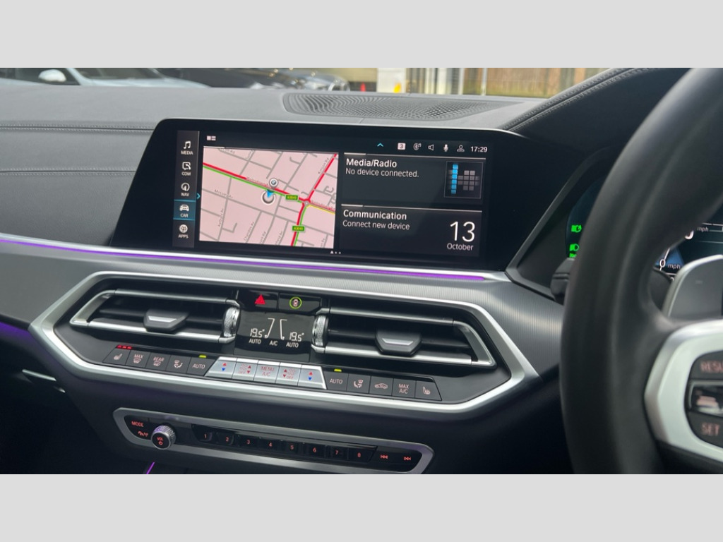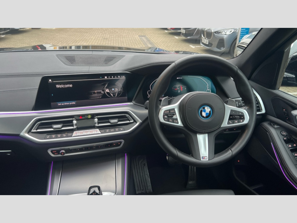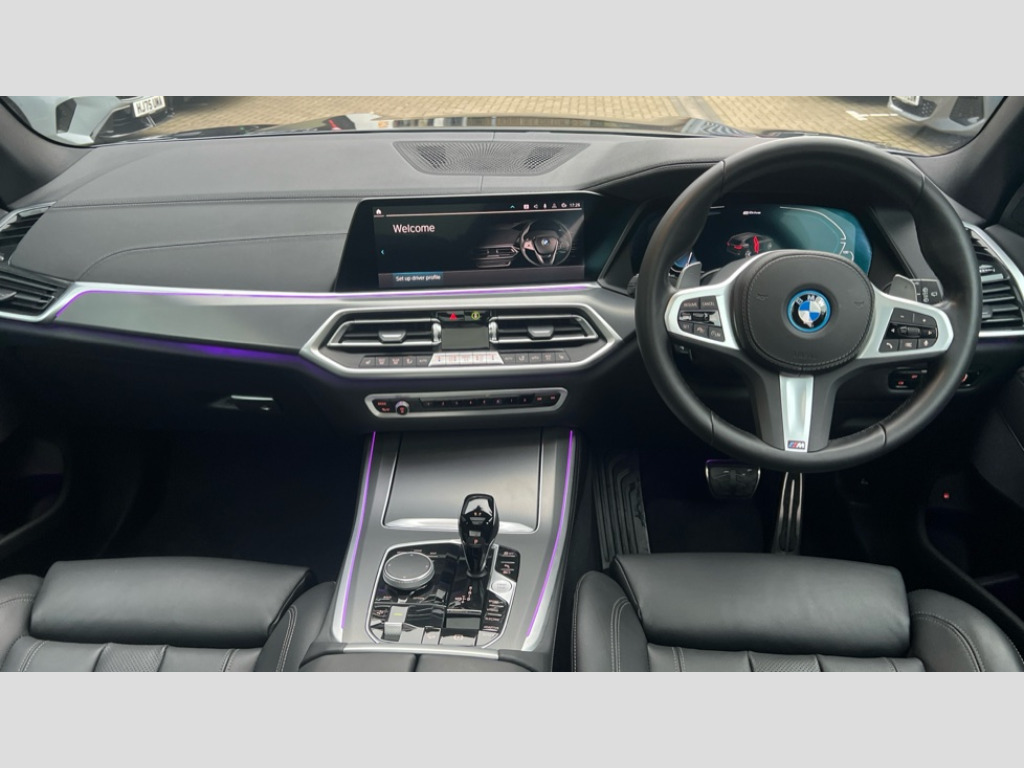 BMW X5 xDrive45e M Sport 5dr Auto 20GB hard disc drive (HDD) memory, Active guard plus, Attentiveness assist, Automatic tailgate with top hinged section open and manual bottom hinged section, BMW ConnectedDrive online services, BMW digital live cockpit professional - 12.3" digital instrument panel and 12.3" CID, with touch/voice command, BMW legal emergency call, BMW Teleservices, Brake force display, Brake pad wear indicator warning light, Cruise control with brake assist, eDrive button to select between AUTO eDrive, MAX eDrive and SAVE Battery settings, Enhanced bluetooth with wireless charging, Front/rear park distance control, Lights on warning, Oil sensor for level and grade, On board computer inc. average speed, fuel consumption, liquid crystal Info display, journey computer, outside temperature display, personal profile, Service interval indicator, Speed limit info display, Speed limiting function, Wi-Fi hotspot, 5 metre AC Fast charge cable, Adaptive 2-axle air suspension, Double VANOS, Double wishbone front axle, Drive performance control with ECO PRO comfort + sport mode, eDrive exterior sound, Eight speed steptronic sport automatic transmission and gearshift paddles on the steering wheel, High precision injection, Petrol Particulate Filter, Safety battery terminal clamp, Standard Charging cable (Mode 2) for home socket, Twin scroll turbocharger with Valvetronic, DAB Tuner enables digital radio reception, Favourite buttons, Hi-Fi loudspeaker system, USB connection, USB type A 1.5A in cupholder, USB Type C 3A in centre armrest, Active Air Stream kidney grille with high-gloss chrome, Adaptive air flap control bar in high-gloss black, Automatically dimming rear view mirror, BMW Individual high gloss black shadow line roof rails, BMW Individual high gloss shadow line, Body colour bumpers, Body colour door handles, Dynamic brake lights with LED technology, Exhaust tailpipes - single, left and right with Chrome finisher, Follow me home headlight function, Front and rear electric windows with open and close fingertip control, anti trap facility and comfort closing, Heated windscreen washer jets, High beam assistant, High gloss black outer and central air intakes on front bumper with pearlescent chrome finish, High gloss black Side elements, LED daytime running lights, LED rear lights, Left charging flap on the front side, M aerodynamic body styling, M designation on left and right front side panels, Pearlescent chrome front grille bars, Rain sensor with automatic headlight activation and windscreen wiper control, Rear side wing doors, Satin aluminium side window graphic, Third brake light in rear spoiler, Variable intermittent rear wash/wipe, Welcome light carpet, X5 on left tailgate, xDrive designation on right tailgate, 12V - Power sockets with 2x centre console and 1x luggage compartment, 3 seat bench in 2nd row, 40:20:40 split folding rear seats, Ambient interior lighting with 6 pre-designed selectable lights including dynamic function, Centre and rear interior light, Child seat ISOFIX attachment with rear outer seats includes top tether, Compartment in front of cupholder, Electric front seat adjustment with driver and front passenger memory function, Electrical steering column with adjustable height and length with activation and control on the steering column, Foldable rear centre armrest with 2 cupholders and storage compartment, Front and rear cupholders x 2, Front and rear door pockets, Front and rear door sill inlays with illuminated BMW M designation, Front and rear side armrest integrated into door trim, Front footwell lights, Front reading lights, Light inside glove compartment, Lockable glove compartment, Luggage compartment floor panel with integral storage tray, Luggage compartment lighting, M leather steering wheel, M specific key, M specific pedals, M specific steering wheel, Make-up mirror lights, Multifunction controls for leather steering wheel, Multifunctional hooks, Rear head restraints, Seat back with flap pocket, Securing rings in luggage compartment, Single front passenger seat, Storage bins on all doors, Storage tray and compartment with cover in centre console, Sunvisors with illuminated vanity mirrors, Toolkit located in luggage compartment, Velour floormats, Connected Package Professional - X5 xDrive45e, Expanded exterior mirror pack - X5/X5 M, Non-smokers pack - X5, Airbags - driver/front passenger, rear and side, first and second row seats head airbags, front passenger seat airbag deactivation + knee airbag, Anti-lock braking system (ABS), Automatic Stability Control (ASC), Brake drying, Brake energy regeneration, Brake fade compensation, Braking pre-tensioning, Cornering brake control (CBC), Crash sensor activating central locking release, hazard warning lights, fuel cut off, interior lighting + activation of safety battery terminal clamp, Deformation zones - front and rear with door reinforcements and bumpers up to 2.5 mph, DSC - Dynamic Stability Control, Dynamic brake control, Dynamic Traction Control - DTC, Electromechanical parking brake with automatic drive away release and auto hold function, Electronic brake force distribution, Front and rear seatbelts with seatbelt stopper, seatbelt tensioner for front and outer rear seats and belt force limiter, Front head restraints with anti-whiplash, Height adjustable front seatbelts, Hill start assistant, Integrated brake system, M Sport braking system in blue high gloss + blue painted brake calipers with M designation, Mechanical child proof lock on rear doors, Passive protection for pedestrians, Seat occupancy detection for driver and passenger side, Side impact protection, Three 3 point inertia reel seatbelts, Two tone horn, Tyre pressure monitoring system, Ventilated front and rear disc brakes, Warning triangle and first aid kit, Closing system with central locking, Driver and front passenger door centre lock switch, Locking wheel bolts, Thatcham 1 alarm system with remote control and engine immobilis