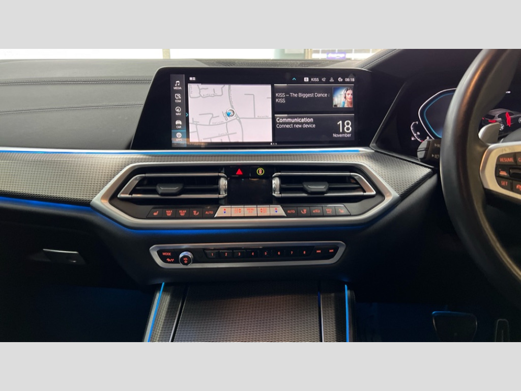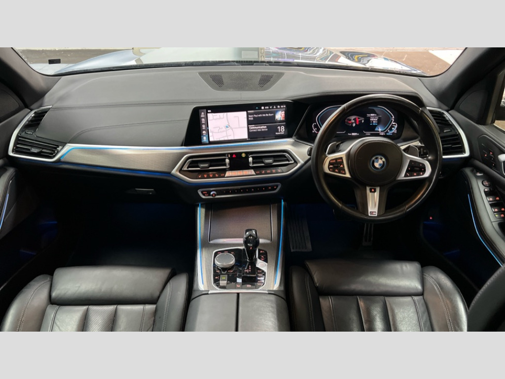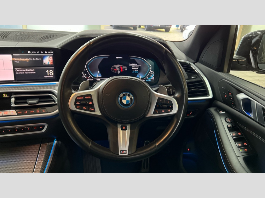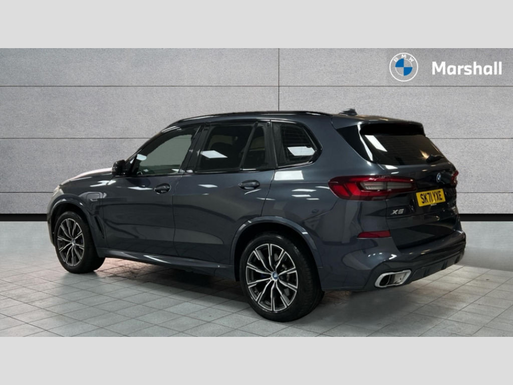 BMW X5 xDrive45e M Sport 5dr Auto 20GB hard disc drive (HDD) memory, Active guard plus, Attentiveness assist, Automatic tailgate with top hinged section open and manual bottom hinged section, BMW ConnectedDrive online services, BMW digital live cockpit professional - 12.3" digital instrument panel and 12.3" CID, with touch/voice command, BMW legal emergency call, BMW Teleservices, Brake force display, Brake pad wear indicator warning light, Cruise control with brake assist, eDrive button to select between AUTO eDrive, MAX eDrive and SAVE Battery settings, Front/rear park distance control, Lights on warning, Oil sensor for level and grade, On board computer inc. average speed, fuel consumption, liquid crystal Info display, journey computer, outside temperature display, personal profile, Service interval indicator, Speed limit info display, Speed limiting function, 5 metre AC Fast charge cable, Adaptive 2-axle air suspension, Double VANOS, Double wishbone front axle, Drive performance control with ECO PRO comfort + sport mode, eDrive exterior sound, Eight speed steptronic sport automatic transmission and gearshift paddles on the steering wheel, High precision injection, Petrol Particulate Filter, Safety battery terminal clamp, Standard Charging cable (Mode 2) for home socket, Twin scroll turbocharger with Valvetronic, DAB Tuner enables digital radio reception, Favourite buttons, USB connection, USB type A 1.5A in cupholder, USB Type C 3A in centre armrest, Active Air Stream kidney grille with high-gloss chrome, Adaptive air flap control bar in high-gloss black, Automatically dimming rear view mirror, BMW Individual high gloss black shadow line roof rails, Body colour bumpers, Body colour door handles, Dynamic brake lights with LED technology, Exhaust tailpipes - single, left and right with Chrome finisher, Follow me home headlight function, Front and rear electric windows with open and close fingertip control, anti trap facility and comfort closing, Heated windscreen washer jets, High beam assistant, High gloss black outer and central air intakes on front bumper with pearlescent chrome finish, High gloss black Side elements, LED daytime running lights, LED rear lights, Left charging flap on the front side, M aerodynamic body styling, M designation on left and right front side panels, Pearlescent chrome front grille bars, Rain sensor with automatic headlight activation and windscreen wiper control, Satin aluminium side window graphic, Third brake light in rear spoiler, Variable intermittent rear wash/wipe, Welcome light carpet, X5 on left tailgate, xDrive designation on right tailgate, 12V - Power sockets with 2x centre console and 1x luggage compartment, 40:20:40 split folding rear seats, Ambient interior lighting with 6 pre-designed selectable lights including dynamic function, Centre and rear interior light, Child seat ISOFIX attachment with rear outer seats includes top tether, Compartment in front of cupholder, Electric front seat adjustment with driver and front passenger memory function, Electrical steering column with adjustable height and length with activation and control on the steering column, Foldable rear centre armrest with 2 cupholders and storage compartment, Front and rear cupholders x 2, Front and rear door pockets, Front and rear door sill inlays with illuminated BMW M designation, Front and rear side armrest integrated into door trim, Front footwell lights, Front reading lights, Light inside glove compartment, Lockable glove compartment, Luggage compartment floor panel with integral storage tray, Luggage compartment lighting, M leather steering wheel, M specific key, M specific pedals, M specific steering wheel, M specific velour floor mats, Make-up mirror lights, Multifunction controls for leather steering wheel, Multifunctional hooks, Rear head restraints, Seat back with flap pocket, Securing rings in luggage compartment, Storage bins on all doors, Storage tray and compartment with cover in centre console, Sunvisors with illuminated vanity mirrors, Toolkit located in luggage compartment, Connected Package Professional - X5 xDrive45e, Expanded exterior mirror pack - X5/X5 M, Non-smokers pack - X5, Airbags - driver/front passenger, rear and side, first and second row seats head airbags, front passenger seat airbag deactivation + knee airbag, Anti-lock braking system (ABS), Automatic Stability Control (ASC), Brake drying, Brake energy regeneration, Brake fade compensation, Braking pre-tensioning, Cornering brake control (CBC), Crash sensor activating central locking release, hazard warning lights, fuel cut off, interior lighting + activation of safety battery terminal clamp, Deformation zones - front and rear with door reinforcements and bumpers up to 2.5 mph, DSC - Dynamic Stability Control, Dynamic brake control, Dynamic Traction Control - DTC, Electromechanical parking brake with automatic drive away release and auto hold function, Electronic brake force distribution, Front and rear seatbelts with seatbelt stopper, seatbelt tensioner for front and outer rear seats and belt force limiter, Front head restraints with anti-whiplash, Height adjustable front seatbelts, Hill start assistant, Integrated brake system, M Sport braking system in blue high gloss + blue painted brake calipers with M designation, Mechanical child proof lock on rear doors, Passive protection for pedestrians, Seat occupancy detection for driver and passenger side, Side impact protection, Three 3 point inertia reel seatbelts, Two tone horn, Tyre pressure monitoring system, Ventilated front and rear disc brakes, Warning triangle and first aid kit, Closing system with central locking, Driver and front passenger door centre lock switch, Locking wheel bolts, Thatcham 1 alarm system with remote control and engine immobiliser, Start/stop toggle diamond shaped trim finisher in pearl chrome