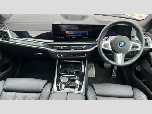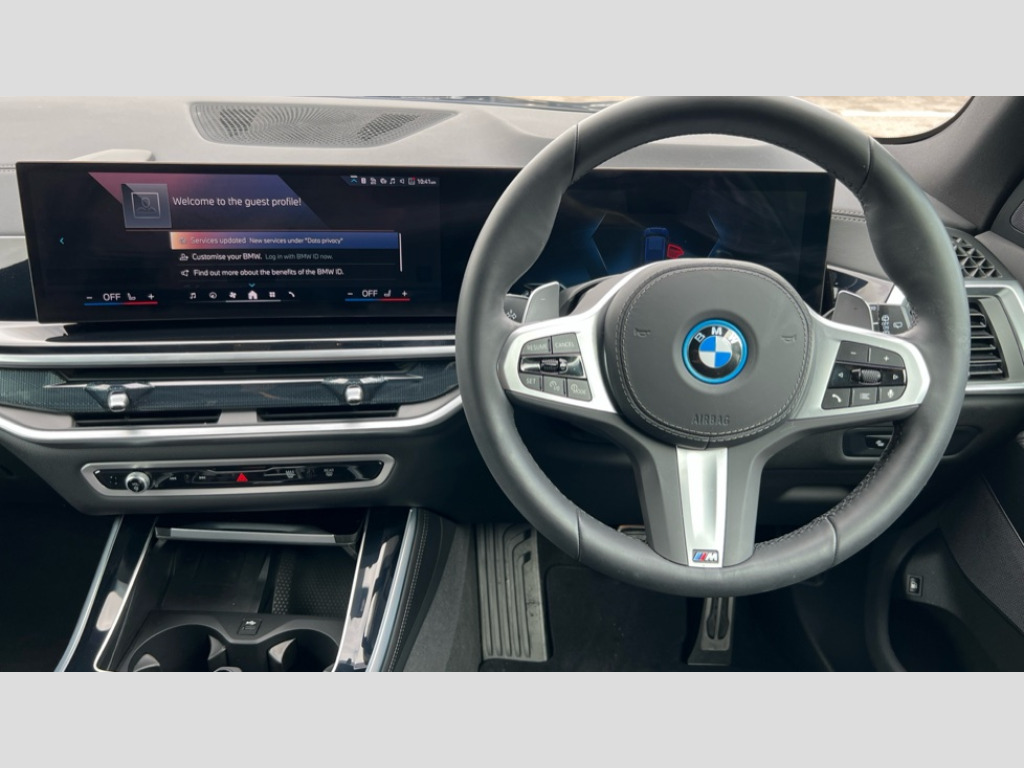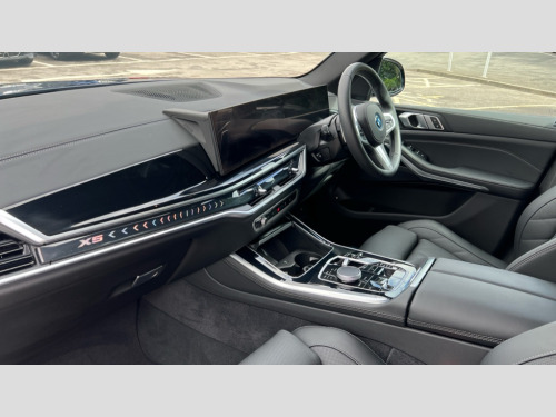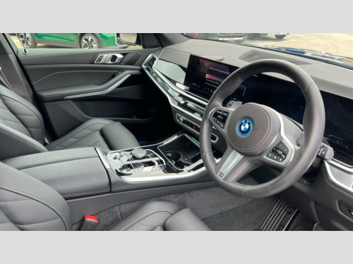 BMW X5 xDrive50e M Sport 5dr Auto Attentiveness assist, Automatic tailgate operation, BMW ConnectedDrive online services, BMW live cockpit + with curved 12.3 instrument cluster/14.9 central display,nav/Tuner with diversity reception,RDS/4GLTE/remote software upgrade, BMW Teleservices, Condition based service, Cruise control with brake assist, eCall emergency call system, Enhanced bluetooth with wireless charging, Integrated owner's handbook, PAS, Speed limiter, Wi-Fi hotspot, AC Fast charging preparation (Maximum charging power 11kW), Adaptive 2-axle Front and rear air suspension, Drive performance control with ECO PRO comfort + sport mode, Eight speed steptronic sport automatic transmission and gearshift paddles on the steering wheel, Adaptive LED Headlights, Front and rear electric windows, High beam assistant, High gloss black shadow line roof rails, LED daytime running lights, Rain sensor, Rear side wing doors, Third brake light in rear spoiler, Variable intermittent rear wash/wipe, 12V - Power sockets with 2x centre console and 1x luggage compartment, 3 seat bench in 2nd row, Foldable rear centre armrest with 2 cupholders and storage compartment, Front and rear side armrest integrated into door trim, Headrests for all seats, Luggage compartment separating net, Lumbar support with height and depth adjustment in backrest, Single front passenger seat, Three spoke sport M leather steering wheel, Velour floormats, Ambient light interior pack - X5, Driving assistant pack with radar based driver assistance system - X5, Expanded exterior mirror pack - X5/X5 M, M aerodynamics pack - X5, Parking assistant pack - X5, 3 rear seatbelts, Acoustic protection for pedestrians, Active protection, Airbags - driver/front passenger, rear and side, first and second row seats head airbags, front passenger seat airbag deactivation + knee airbag, Anti-lock braking system (ABS), Automatic Stability Control (ASC), Brake energy regeneration, Cornering brake control (CBC), Crash sensor activating central locking release, hazard warning lights, fuel cut off, interior lighting + activation of safety battery terminal clamp, DSC - Dynamic Stability Control, Dynamic Traction Control - DTC, Electromechanical parking brake with automatic drive away release and auto hold function, Electronic brake force distribution, Hill start assistant, M Sport blue painted brake calipers with 'M' designation, Mechanical child proof lock on rear doors, Tyre pressure monitoring system, Tyre pressure sensors, Ventilated front and rear disc brakes, Warning triangle and first aid kit, Alarm system, Closing system with central locking, Comfort access system, Locking wheel bolts