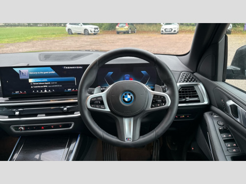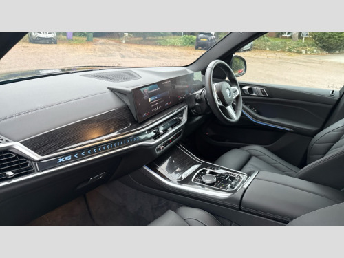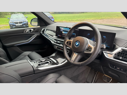 BMW X5 xDrive50e M Sport 5dr Auto Attentiveness assist, Automatic tailgate operation, BMW ConnectedDrive online services, BMW live cockpit + with curved 12.3 instrument cluster/14.9 central display,nav/Tuner with diversity reception,RDS/4GLTE/remote software upgrade, BMW Teleservices, Condition based service, Cruise control with brake assist, eCall emergency call system, Enhanced bluetooth with wireless charging, Integrated owner's handbook, PAS, Speed limiter, Wi-Fi hotspot, AC Fast charging preparation (Maximum charging power 11kW), Adaptive 2-axle Front and rear air suspension, Drive performance control with ECO PRO comfort + sport mode, Eight speed steptronic sport automatic transmission and gearshift paddles on the steering wheel, Adaptive LED Headlights, Front and rear electric windows, High beam assistant, High gloss black shadow line roof rails, LED daytime running lights, Rain sensor, Rear side wing doors, Third brake light in rear spoiler, Variable intermittent rear wash/wipe, 12V - Power sockets with 2x centre console and 1x luggage compartment, 3 seat bench in 2nd row, Foldable rear centre armrest with 2 cupholders and storage compartment, Front and rear side armrest integrated into door trim, Headrests for all seats, Luggage compartment separating net, Lumbar support with height and depth adjustment in backrest, Single front passenger seat, Three spoke sport M leather steering wheel, Velour floormats, Ambient light interior pack - X5, Driving assistant pack with radar based driver assistance system - X5, Expanded exterior mirror pack - X5/X5 M, M aerodynamics pack - X5, Parking assistant pack - X5, 3 rear seatbelts, Acoustic protection for pedestrians, Active protection, Airbags - driver/front passenger, rear and side, first and second row seats head airbags, front passenger seat airbag deactivation + knee airbag, Anti-lock braking system (ABS), Automatic Stability Control (ASC), Brake energy regeneration, Cornering brake control (CBC), Crash sensor activating central locking release, hazard warning lights, fuel cut off, interior lighting + activation of safety battery terminal clamp, DSC - Dynamic Stability Control, Dynamic Traction Control - DTC, Electromechanical parking brake with automatic drive away release and auto hold function, Electronic brake force distribution, Hill start assistant, M Sport blue painted brake calipers with 'M' designation, Mechanical child proof lock on rear doors, Tyre pressure monitoring system, Tyre pressure sensors, Ventilated front and rear disc brakes, Warning triangle and first aid kit, Alarm system, Closing system with central locking, Comfort access system, Locking wheel bolts