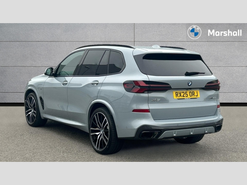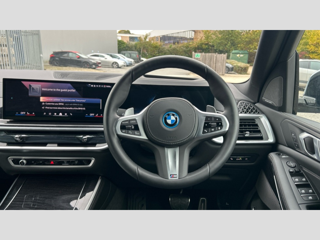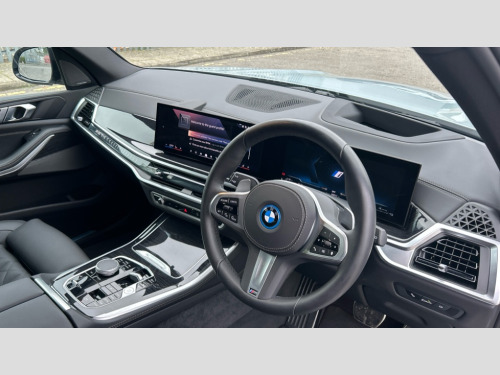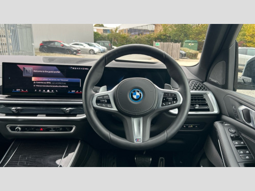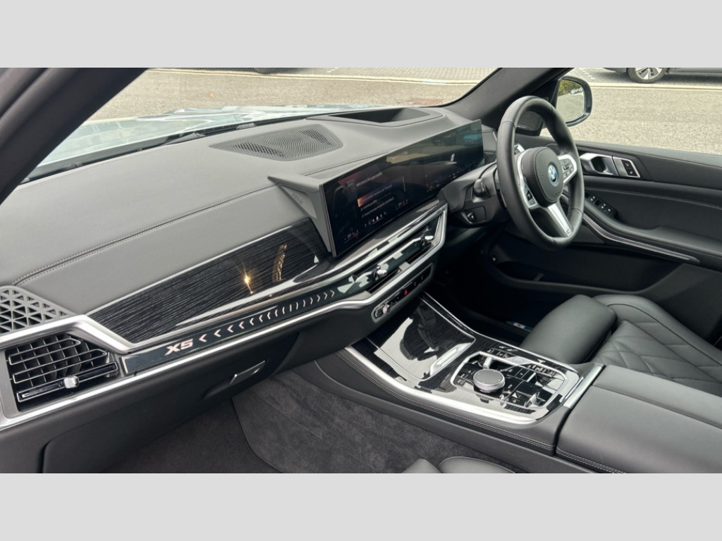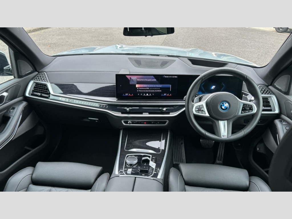BMW X5 xDrive50e M Sport 5dr Auto Attentiveness assist, Automatic tailgate operation, BMW ConnectedDrive online services, BMW live cockpit + with curved 12.3 instrument cluster/14.9 central display,nav/Tuner with diversity reception,RDS/4GLTE/remote software upgrade, BMW Teleservices, Condition based service, Cruise control with brake assist, eCall emergency call system, Enhanced bluetooth with wireless charging, Integrated owner's handbook, PAS, Speed limiter, Wi-Fi hotspot, AC Fast charging preparation (Maximum charging power 11kW), Adaptive 2-axle Front and rear air suspension, Drive performance control with ECO PRO comfort + sport mode, Eight speed steptronic sport automatic transmission and gearshift paddles on the steering wheel, Adaptive LED Headlights, Front and rear electric windows, High beam assistant, High gloss black shadow line roof rails, LED daytime running lights, Rain sensor, Rear side wing doors, Third brake light in rear spoiler, Variable intermittent rear wash/wipe, 12V - Power sockets with 2x centre console and 1x luggage compartment, 3 seat bench in 2nd row, Foldable rear centre armrest with 2 cupholders and storage compartment, Front and rear side armrest integrated into door trim, Headrests for all seats, Luggage compartment separating net, Lumbar support with height and depth adjustment in backrest, Single front passenger seat, Three spoke sport M leather steering wheel, Velour floormats, Ambient light interior pack - X5, Driving assistant pack with radar based driver assistance system - X5, Expanded exterior mirror pack - X5/X5 M, M aerodynamics pack - X5, Parking assistant pack - X5, 3 rear seatbelts, Acoustic protection for pedestrians, Active protection, Airbags - driver/front passenger, rear and side, first and second row seats head airbags, front passenger seat airbag deactivation + knee airbag, Anti-lock braking system (ABS), Automatic Stability Control (ASC), Brake energy regeneration, Cornering brake control (CBC), Crash sensor activating central locking release, hazard warning lights, fuel cut off, interior lighting + activation of safety battery terminal clamp, DSC - Dynamic Stability Control, Dynamic Traction Control - DTC, Electromechanical parking brake with automatic drive away release and auto hold function, Electronic brake force distribution, Hill start assistant, M Sport blue painted brake calipers with 'M' designation, Mechanical child proof lock on rear doors, Tyre pressure monitoring system, Tyre pressure sensors, Ventilated front and rear disc brakes, Warning triangle and first aid kit, Alarm system, Closing system with central locking, Comfort access system, Locking wheel bolts