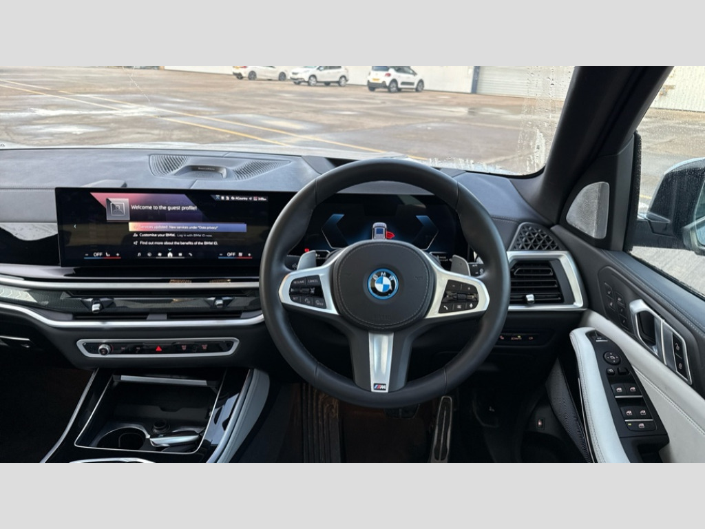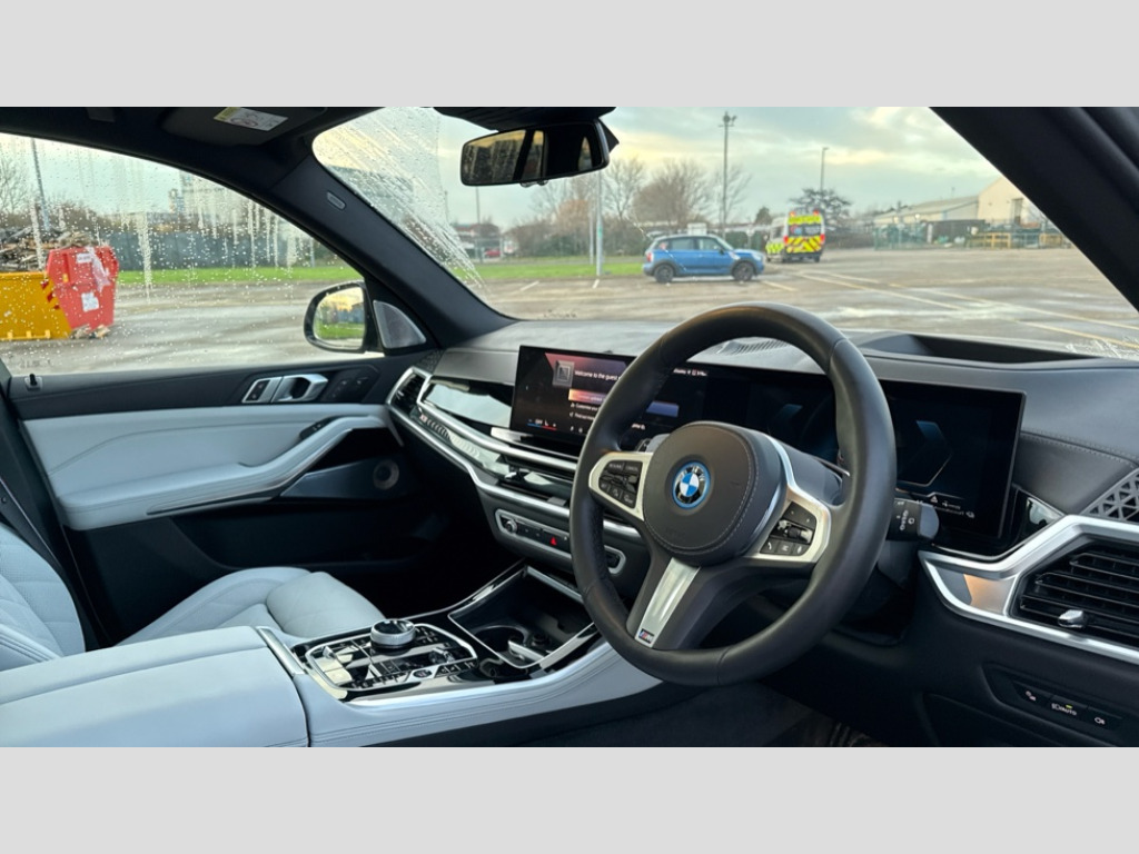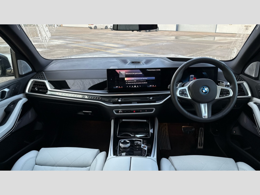 BMW X5 xDrive50e M Sport 5dr Auto Attentiveness assist, Automatic tailgate operation, BMW ConnectedDrive online services, BMW Teleservices, Condition based service, Cruise control with brake assist, eCall emergency call system, Enhanced bluetooth with wireless charging, Integrated owner's handbook, Navigation/Tuner with diversity reception,RDS/4GLTE/remote software upgrade, PAS, Speed limiter, Wi-Fi hotspot, AC Fast charging preparation (Maximum charging power 11kW), Adaptive 2-axle Front and rear air suspension, Drive performance control with ECO PRO comfort + sport mode, Eight speed steptronic sport automatic transmission and gearshift paddles on the steering wheel, Adaptive LED Headlights, BMW Iconic glow kidney grille, Front and rear electric windows, High beam assistant, High gloss black shadow line roof rails, LED daytime running lights, Rain sensor, Rear side wing doors, Third brake light in rear spoiler, Variable intermittent rear wash/wipe, 12V - Power sockets with 2x centre console and 1x luggage compartment, 3 seat bench in 2nd row, Foldable rear centre armrest with 2 cupholders and storage compartment, Front and rear side armrest integrated into door trim, Headrests for all seats, Luggage compartment separating net, Lumbar support with height and depth adjustment in backrest, Single front passenger seat, Three spoke sport M leather steering wheel, Velour floormats, Ambient light interior pack - X5, Driving assistant pack with radar based driver assistance system - X5, Expanded exterior mirror pack - X5/X5 M, M aerodynamics pack - X5, M sport pro package - X5 50e, 3 rear seatbelts, Acoustic protection for pedestrians, Active protection, Airbags - driver/front passenger, rear and side, first and second row seats head airbags, front passenger seat airbag deactivation + knee airbag, Anti-lock braking system (ABS), Automatic Stability Control (ASC), Brake energy regeneration, Cornering brake control (CBC), Crash sensor activating central locking release, hazard warning lights, fuel cut off, interior lighting + activation of safety battery terminal clamp, DSC - Dynamic Stability Control, Dynamic Traction Control - DTC, Electromechanical parking brake with automatic drive away release and auto hold function, Electronic brake force distribution, Hill start assistant, Mechanical child proof lock on rear doors, Tyre pressure monitoring system, Tyre pressure sensors, Ventilated front and rear disc brakes, Warning triangle and first aid kit, Alarm system, Closing system with central locking, Comfort access system, Locking wheel bolts