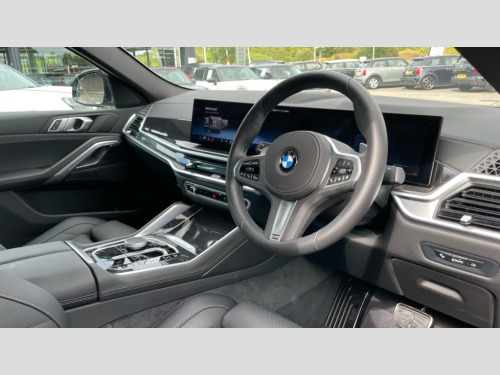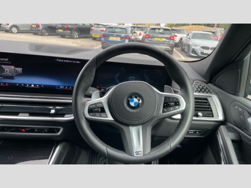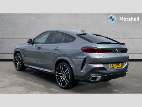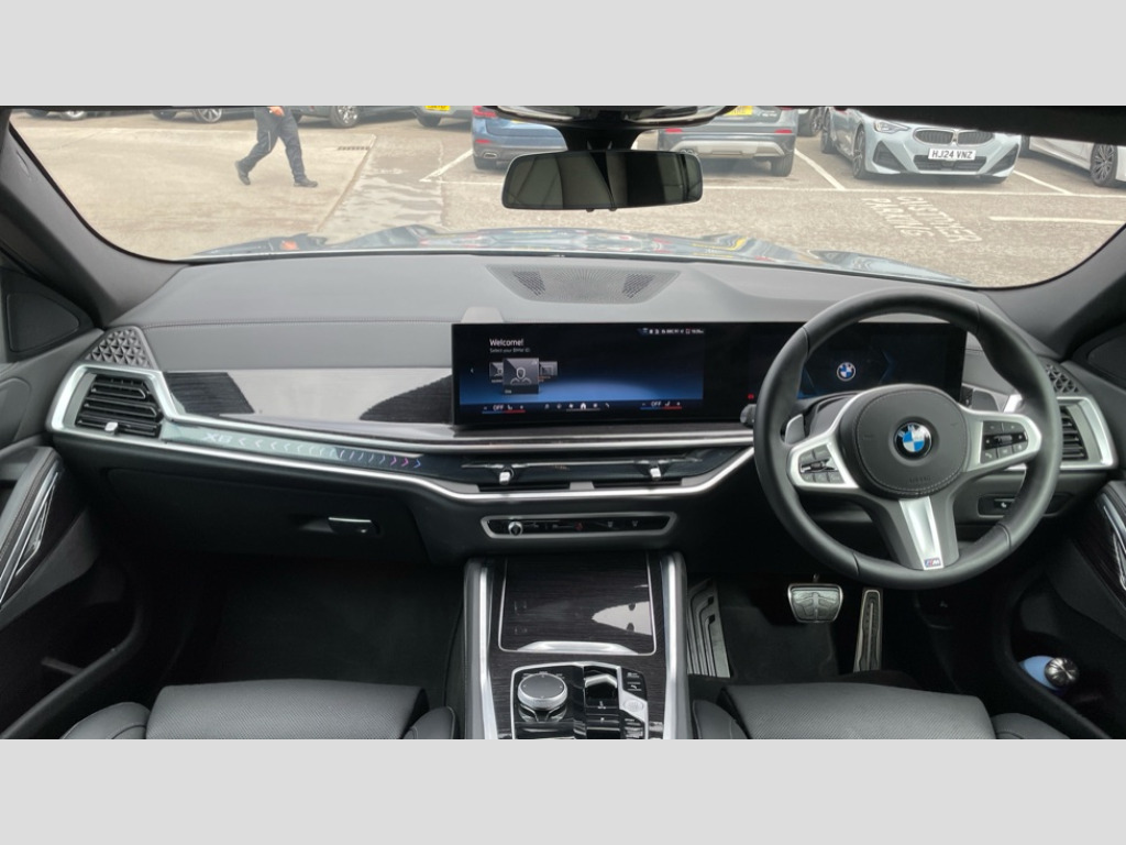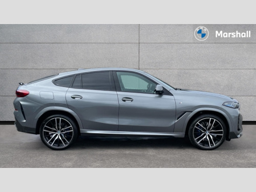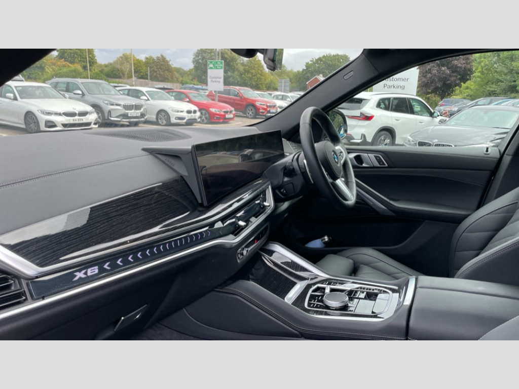 BMW X6 xDrive40d MHT M Sport 5dr Step Auto Active guard plus, Attentiveness assist, Automatic tailgate two part with top hinged section open and manual bottom hinged section, BMW live cockpit + with curved 12.3 instrument cluster/14.9 central display,nav/Tuner with diversity reception,RDS/4GLTE/remote software upgrade, Brake pad wear indicator in front and rear, Cruise control with brake assist, Driving experience switch, eCall emergency call system, Enhanced bluetooth with wireless charging, iDrive controller with shortcut buttons, Lights on warning, Oil sensor for level and grade, On board computer inc. average speed, fuel consumption, liquid crystal Info display, journey computer, outside temperature display, personal profile, Service interval indicator, Speed limit info display, Speed limiter, Wifi hotspot preparation, 8 speed automatic with steptronic transmission including automatic hold function and gearshift paddles on the steering wheel, Diesel particulate filter, Double wishbone front axle, Drive performance control with ECO PRO comfort + sport mode, Safety battery terminal clamp, Variable vane geometry, DAB Tuner enables digital radio reception, Favourite buttons, Adaptive LED Headlights, Door locking - after driving off to secure vehicle, Dynamic brake lights with LED technology, Electrically adjustable and heated aspheric folding side mirrors with auto dimming, electric fold in function, automatic parking function, Front and rear electric windows with open and close fingertip control, anti trap facility and comfort closing, Heated windscreen washer nozzles, High beam assistant, Integrated turn indicators, LED daytime running lights, LED technology rear tail lights, brake lights and turn indicators, LED technology reflector left and right integrated in tailgate, LED third brake light in rear spoiler, M high gloss shadowline, Mirror base in black matt, Rain sensor with automatic headlight activation and windscreen wiper control, Rear side wing doors, Trailer stabilisation logic, Welcome light setting when approaching the vehicle, 12V - Power sockets with 2x centre console and 1x luggage compartment, 3 seat bench in 2nd row, 40:20:40 split folding rear seats, BMW inscription in front and rear door entry sills with illuminated, Centre and rear interior light, Driver and front passenger sunvisors with illuminated vanity mirrors and ticket holder, Electrical steering column with adjustable height and length with activation and control on the steering column, Foldable rear centre armrest with 2 cupholders and storage compartment, Front and rear side armrest integrated into door trim, Front footwell lights, Front reading lights, Grab handles in 1st and 2nd row outer seats, Headrests for all seats, Light inside glove compartment, Luggage compartment lighting, Luggage net, M leather steering wheel, Make-up mirror lights, Multifunction controls for leather steering wheel, Multifunctional hooks, Single front passenger seat, Velour floormats, Ambient light interior package - X6, M Aerodynamic pack - X6, Parking assistant pack - X6, 3 rear seatbelts, Active protection, Airbags - driver/front passenger, rear and side, first and second row seats head airbags, front passenger seat airbag deactivation + knee airbag, Anti-lock braking system (ABS), Automatic Stability Control (ASC), Brake drying, Brake energy regeneration, Brake fade compensation, Braking pre-tensioning, Cornering brake control (CBC), Crash sensor inclu activation of airbags, interior light, safety battery terminal clamp, hazard warn flasher, unlock doors, deactivation of fuel pump, DSC - Dynamic Stability Control, Dynamic brake control, Dynamic Traction Control - DTC, Electromechanical parking brake with automatic drive away release and auto hold function, Electronic brake force distribution, Front and rear brake discs with interior ventilation, Front head restraints with anti-whiplash, Hill descent control, Hill start assistant, Integrated braking system, M Sport blue painted brake calipers with 'M' designation, Mechanical child proof lock on rear doors, PC iBrake (Post crash approach control warning with light braking function), Seat occupancy detection for driver and passenger side, Side impact protection, Two tone horn, Tyre pressure monitoring system, Variable torque distribution, Warning triangle and first aid kit, Alarm system, Automatic locking when moving away from the vehicle, Automatic unlocking when approaching the vehicle, BMW Digital key, Comfort access system, Contractless opening/closing tailgate, Key card with NFC technology, Keyless access to the vehicle, Locking wheel bolts, Locking/unlocking and starting the vehicle using compatiable smartphone