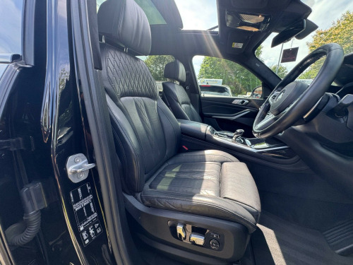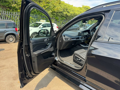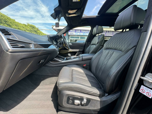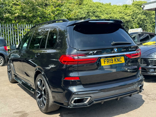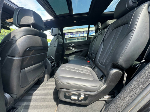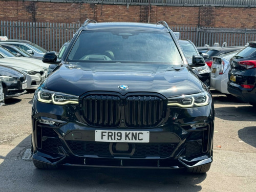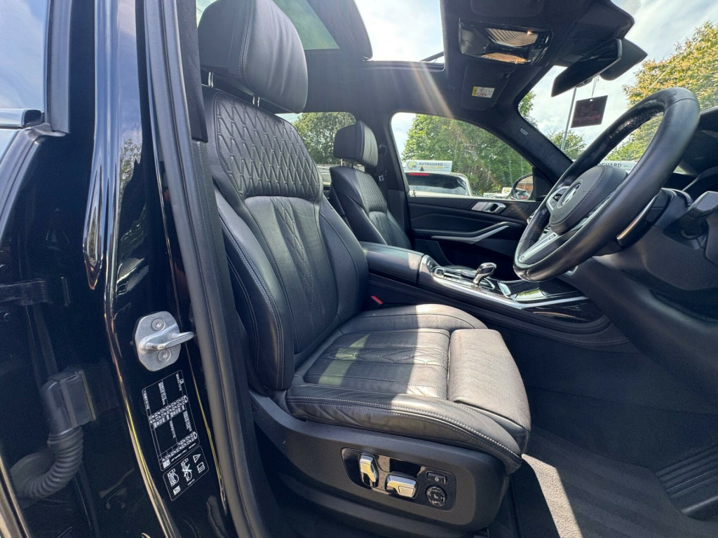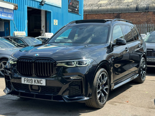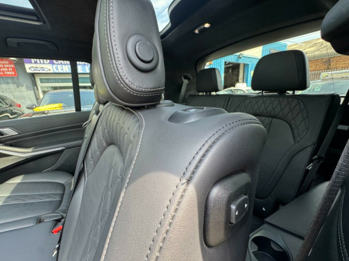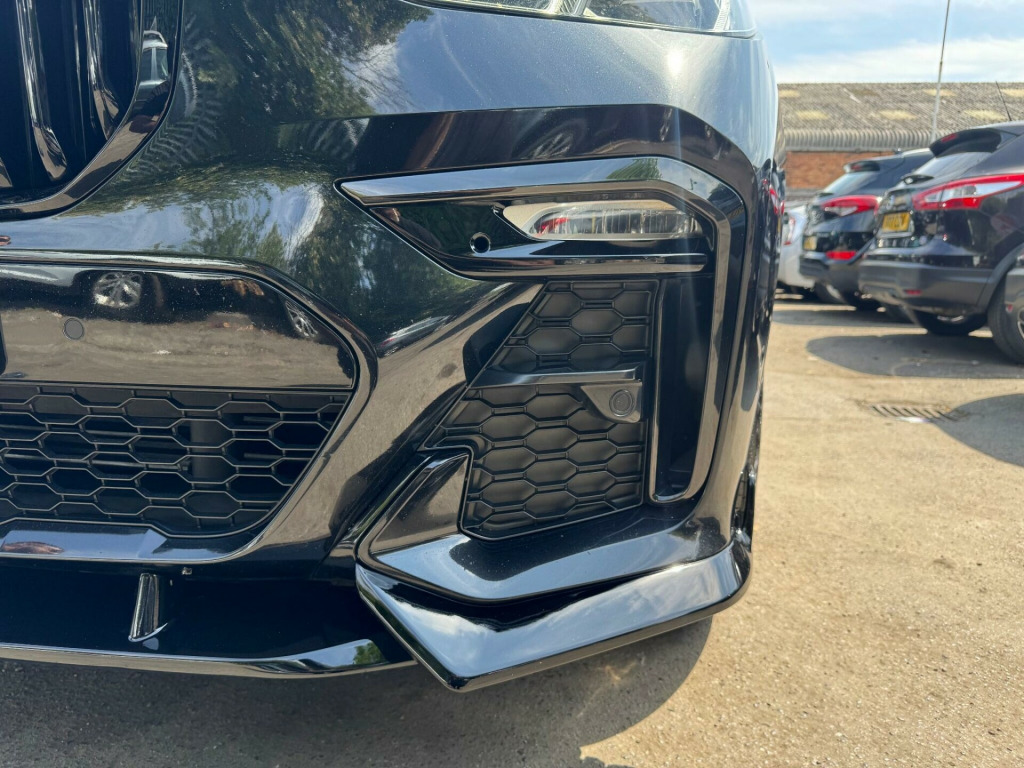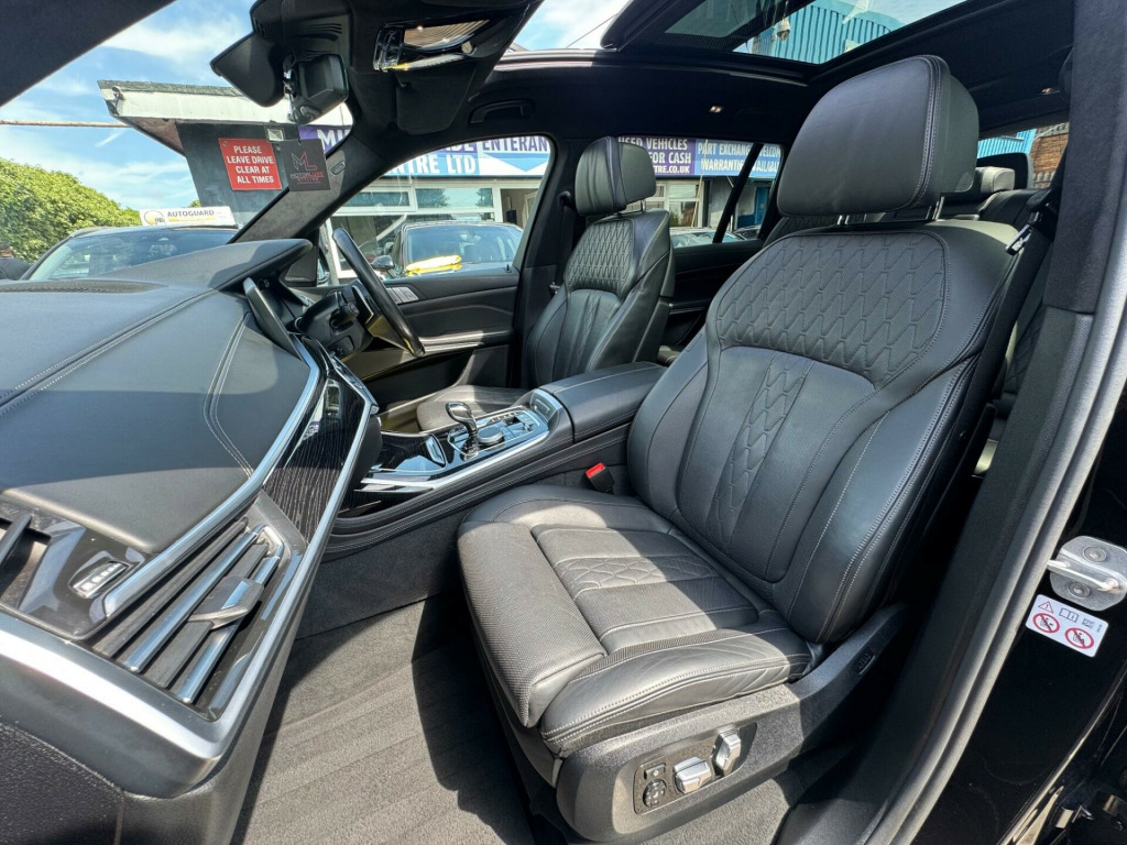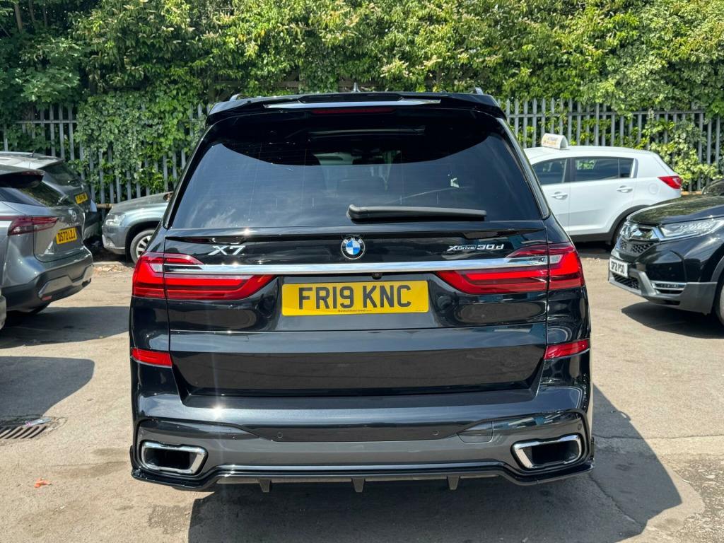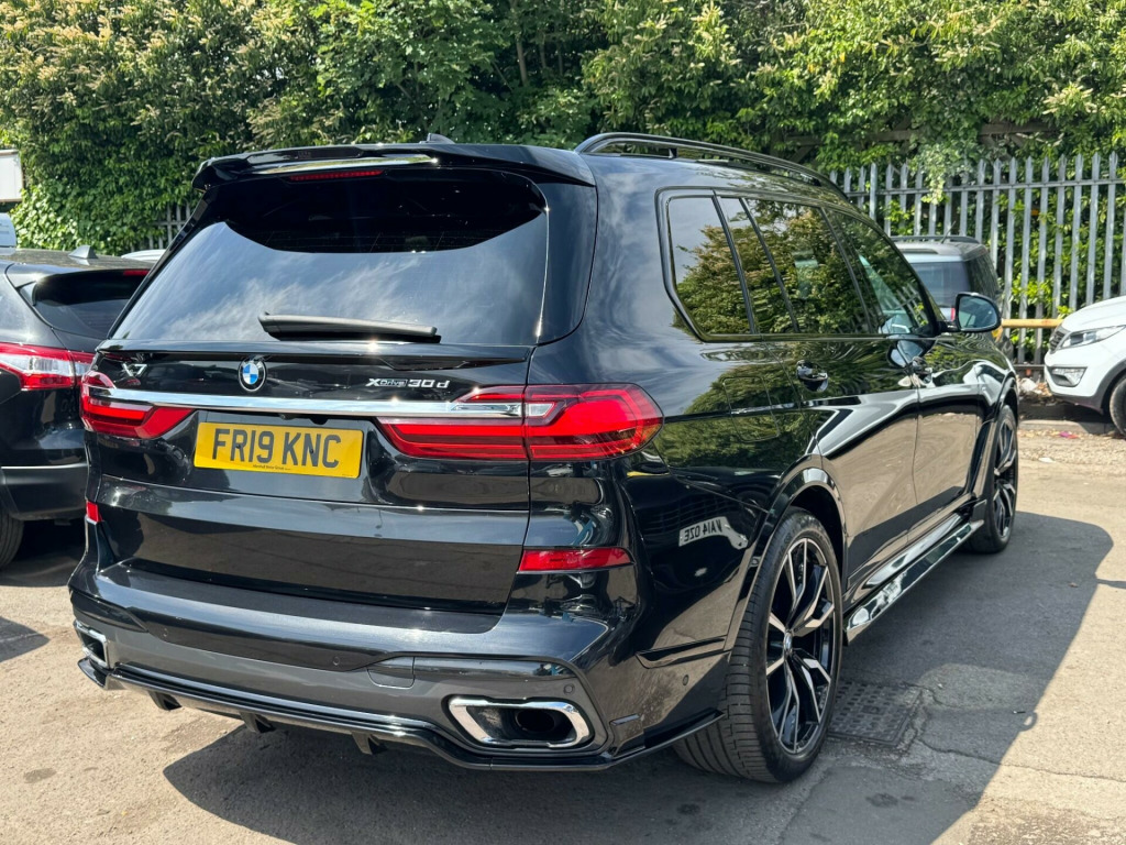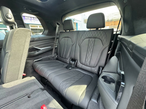 This 2019 BMW X7 30d M Sport offers a superb blend of luxury and capability, presented in excellent condition. As a Euro 6 compliant model, it features a powerful 3.0L diesel engine paired with a smooth four wheel drive system, ensuring confident performance in all conditions. This spacious X7 comfortably seats seven occupants and boasts a generous boot space, making it ideal for families or those who require ample room for luggage. The M Sport trim enhances its dynamic appeal, complemented by striking chrome trims and door surrounds.The X7 30d M Sport is equipped with desirable optional packages, including the Premium Package which adds climate control and a heated steering wheel, alongside the M Sport Plus Package. For an engaging driving experience, it features steering wheel gearshift paddles, and the interior is further elevated by a luxurious BMW Individual Alcantara Anthracite headlining. With an impressive towing weight of 2200 kg and a swift 0-62mph acceleration time of just 7.0 seconds, this BMW X7 demonstrates a superior combination of performance, practicality, and refinement compared to other vehicles in its class. chnology package, premium package, m sport plus package, 22in alloy wheels - m light v-spoke style 755 m bicolour jet black, panorama glass roof sky lounge, sun protection glazing, loudspeaker system - harman kardon, 1 x usb a 1.5a in cupholder - 1 x usb c 3a in centre armrest and 1 x double usb c 3a in rear end of console for 2nd seat row, 20gb hard disc drive hdd memory, 21in alloy wheels - m light double spoke style 754m bicolour, 7-seat in 2+3+2 configuration, acoustic glazing, active air stream kidney grille - high-gloss chrome, active guard plus, active protection, adaptive 2-axle air suspension, air conditioning - automatic with four zone control, airbags, alarm system - thatcham 1 with remote control and engine immobiliser, ambient lighting, armrests, attentiveness assistant, bmw connected package professional, bmw connecteddrive services, bmw display key, bmw individual high-gloss shadowline, bmw individual instrument panel finished in leather, bmw individual roof rails high-gloss shadow line, bmw legal emergency call, bmw live cockpit professional, brake force display, brake system, brake-pad wear indicator, centre lock switch - driver and front passenger door, child seat isofix attachment - rear outer seats in 2nd row and both seats in 3rd row - includes top tether, chrome trims and door surrounds, closing system with central locking, comfort access system, comfort cushion, comfort seats - front - electrically adjustable, compartment in front of cupholder, crash sensor and safety battery terminal clamp, cruise control with brake function, cup holders - front x2 and rear x2, dab tuner, dsc - dynamic stability control - stabilises the vehicle in extreme situations - controls traction, daytime running lights - led, door pockets - front and rear, door sill finishers - m designation, door sill inlays - bmw m designation illuminated, double-wishbone front axle, drive performance control - eco pro - comfort - sport and adaptive modes, dynamic brake lights with led technology, eps - electric power steering with servotronic, electric front seat adjustment with driver memory, electric windows - front and rear, electrical steering column with adjustable height and length, electro-mechanical parking brake with automatic drive-away release and auto-hold function, expanded exterior mirror package, exterior mirror housing - body colour, exterior trim - high-gloss shadowline, favourite buttons, floor mats - velour, follow me home headlight function, footwell lights - front, galvanic embellisher for controls, gesture control, grab handles, headlights - adaptive led, headlining - bmw individual alcantara anthracite, headrests - all seats, hifi loudspeaker system, high-beam assistant, instrument panel in sensatec, interior light - rear centre, interior mirror - frameless, interior trim - fineline black wood - high-gloss with metal effect, led fog lights, led rear lights, led third brake light - spoiler, launch control, light inside glove compartment, lockable glove compartment, locking wheel bolts, luggage compartment floor panel with integral storage tray, luggage compartment package, m aerodynamics package, m designation on front side panels - left and right, m leather steering wheel, m specific key, m specific pedals, m sport braking system, m sport package, make-up mirror lights, mechanical childproof lock - rear doors, multifunctional hooks, obc - on-board computer, oil sensor for level and grade, pdc - park distance control - front and rear, panoramic glass sunroof, parking assistant plus, passive protection for pedestrians, power sockets 12v - 2x centre console - 1x luggage compartment, rain sensor with automatic headlight activation and windscreen wiper control, reading lights - front, run flat tyres, seat back with flap pocket, seat heating - front and rear, seat occupancy detection for driver and passenger side, side impact protection, soft close doors, speed limiting function, split folding 2nd row seating with 40-20-40 configuration, steering wheel - gearshift paddles, sun visors with illuminated vanity mirrors, tpms - tyre pressure monitoring system, tailgate automatic - two part top-hinged section which can be opened separately and manual bottom-hinged section, tailpipe finishers in m sport package-specific geometry, telephony with wireless charging, teleservices, third-row seating, three-point seat belts, toolkit located in luggage compartment, two tone horn, warning triangle, welcome light carpet, wifi hotspot, windscreen washer jets - heated, x7 on tailgate - left, idrive touch controller with shortcut buttons, xdrive and engine designation on tailgate - right