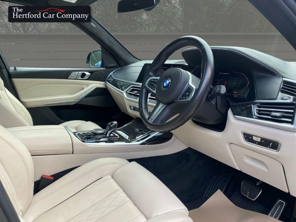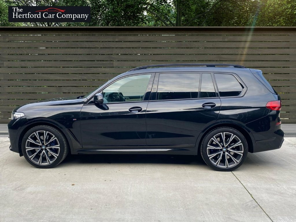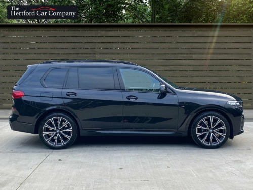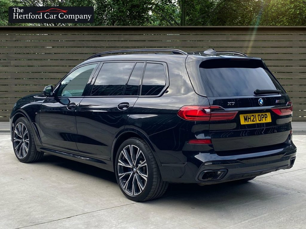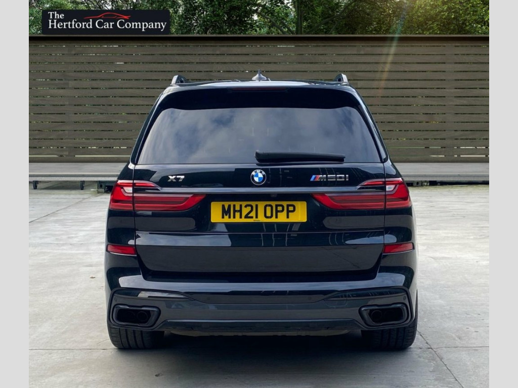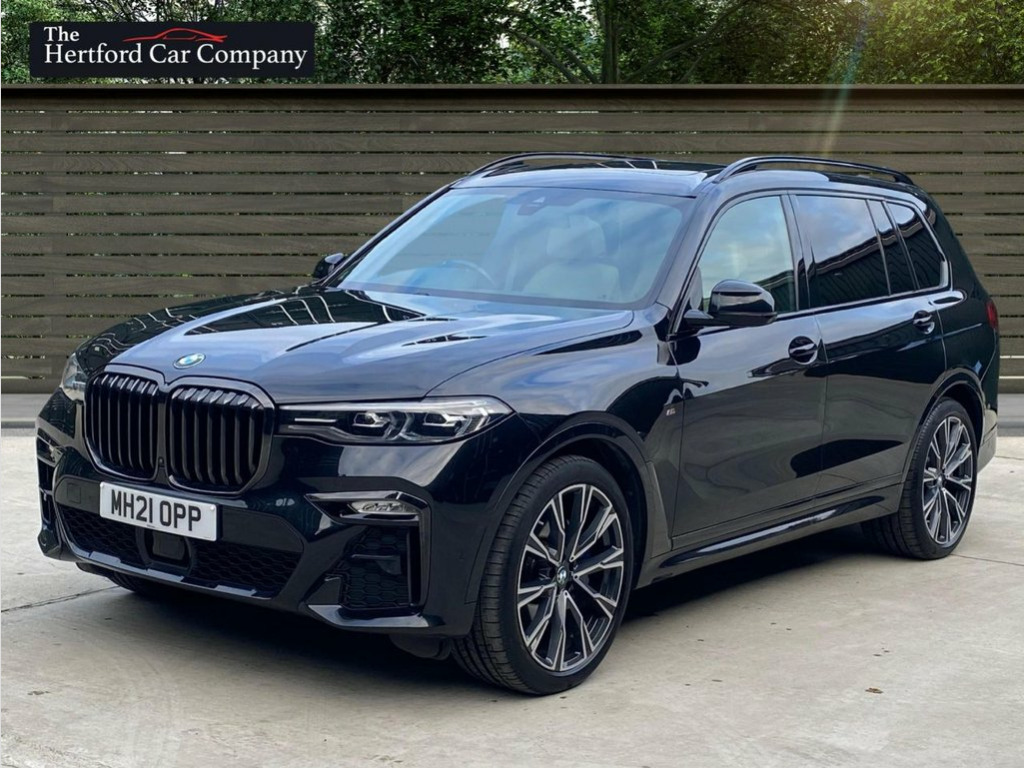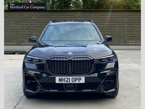 This 2021 BMW X7 M50i V8 presents a remarkable ownership history, boasting only one owner and a full dealership service record, ensuring its provenance is as impressive as its performance. This substantial seven seat SUV is equipped with a powerful 4.4 litre petrol engine and a four wheel drive drivetrain, meeting Euro 6 emission standards. It features striking 22 inch BMW Individual Light Y Spoke Style 758 alloy wheels and a Sky Lounge panoramic glass sunroof that opens for an enhanced experience. Comfort is paramount with automatic four zone air conditioning, and parking is made effortless with the Parking Assistant Plus, which includes a 360 degree camera and sensors all around. With a towing weight of 2600 kg and an MOT valid until September 2026, this vehicle is ready for any adventure. The low mileage of just 27,438 miles for its age, combined with its impressive acceleration from 0 to 60 mph in a mere 4.7 seconds, clearly sets this BMW X7 M50i V8 apart from other vehicles in its class. This exceptional performance, coupled with the luxurious features and meticulous care evident in its full dealership service history and single owner status, makes this a truly outstanding example of the X7 model. 1 x USB A 1.5A in Cupholder - 1 x USB C , 20GB Hard Disc Drive HDD Memory, 22in Alloy Wheels - M Light V-Spoke Styl, 7-Seat in 2 - 3 - 2 Configuration, Acoustic Glass, Active Guard Plus, Active Protection, Additional Storage Compartment, Air Conditioning - Automatic with Four Z, Airbags, Alarm System - Thatcham 1 with Remote Co, Ambient Lighting, Armrests, Attentiveness Assistant, Automatic Start-Stop Button, BMW Connected Package Professional, BMW ConnectedDrive Services, BMW Emergency Call, BMW Head-Up Display, BMW Individual High-Gloss Shadowline, BMW Live Cockpit Professional, BMW TeleServices, Brake Force Display, Brake System, Brake-Pad Wear Indicator, Centre Lock Switch - Driver and F